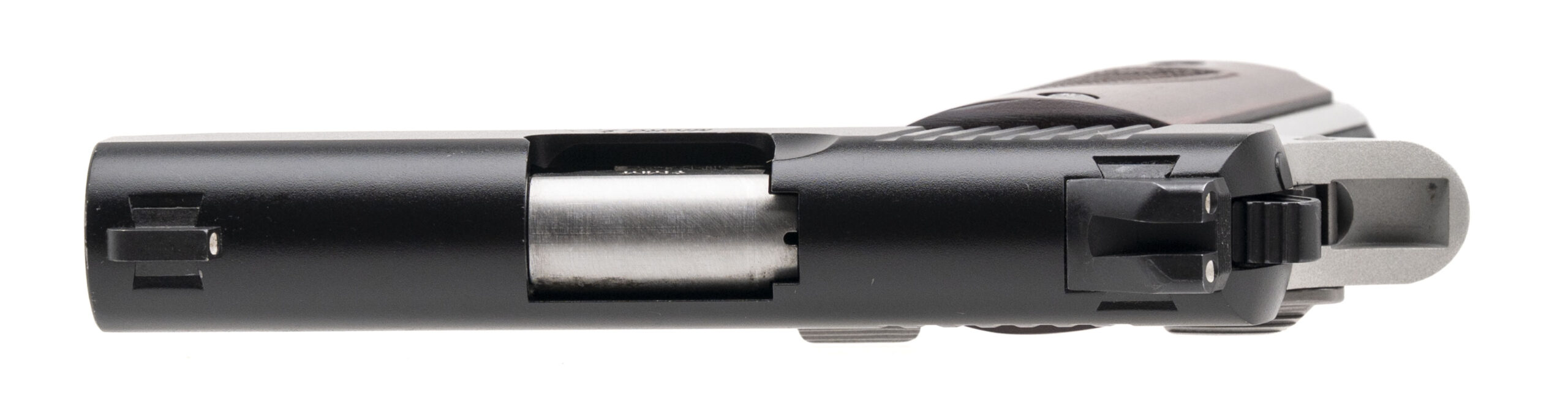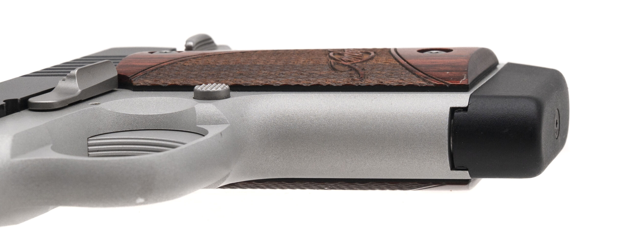 SN: PB0351376 modern production sub compact aluminum frame 1911 style pistol chambered in 9mm with a 3” barrel, two tone finish, checkered wood grips and extended 7 round magazine with a thumb safety and 3 dot sights. Overall in very good condition with an excellent bore. Comes with case and 3 extra magazines.