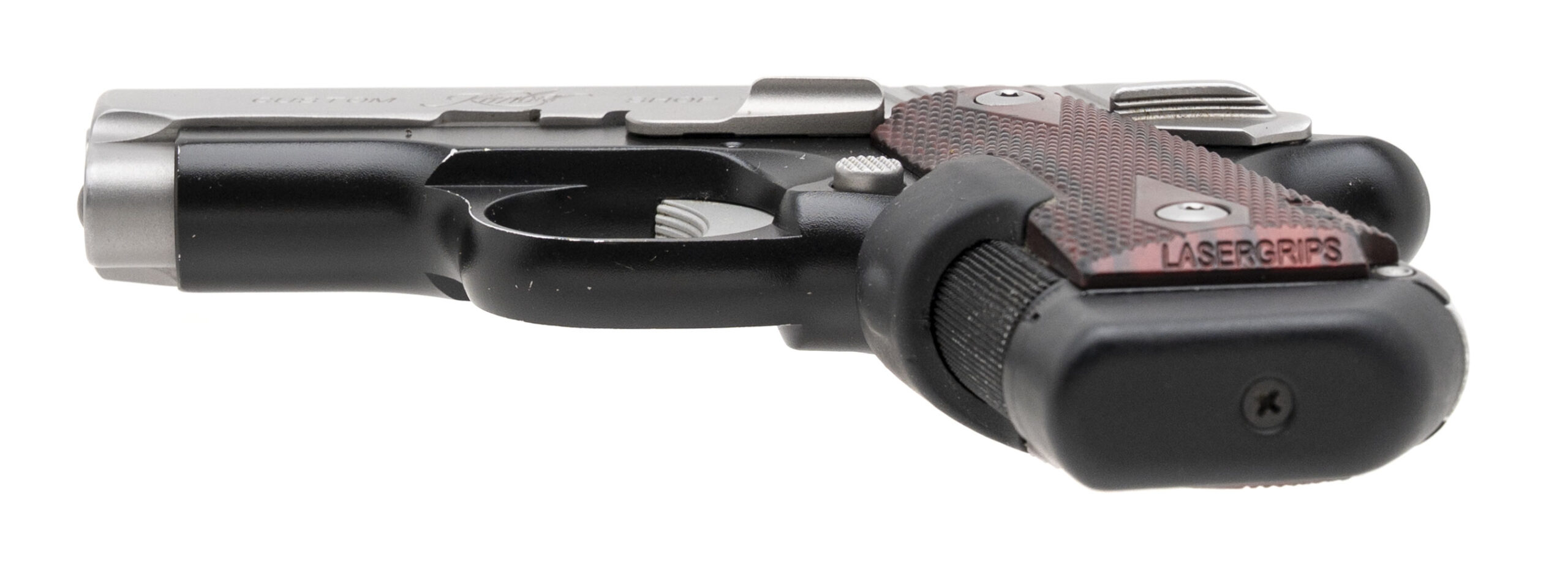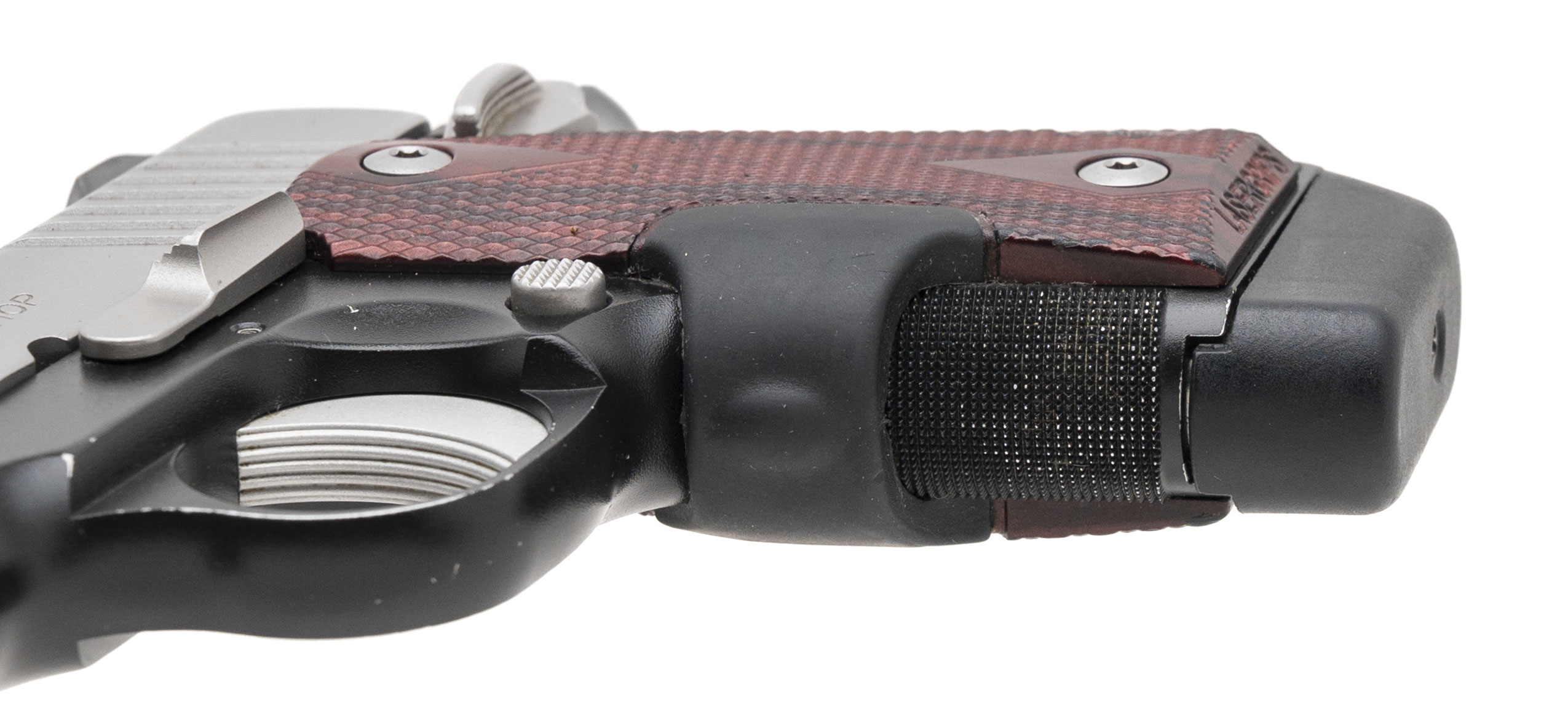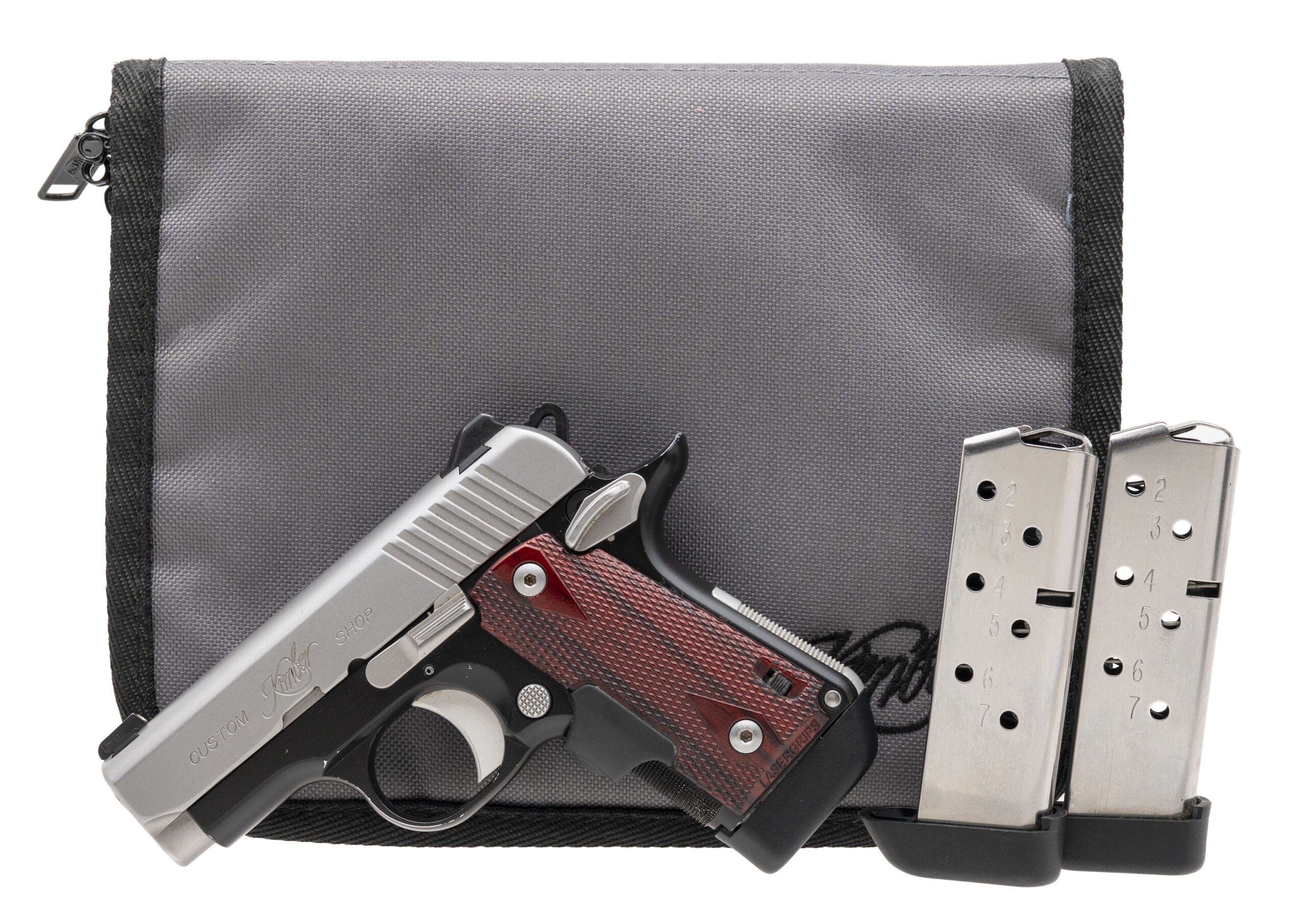 SN: M0026527. Modern production, .380 ACP with a 2.6" barrel. Bore is excellent. Sub-compact 1911 style pistol with Crimson Trace laser grips, tritium front& rear night sights, and two-tone finish. Laser grips do not function, minor handling wear to finish. includes an additional 2-7rd magazines, and original soft carry case. Overall condition is very good.