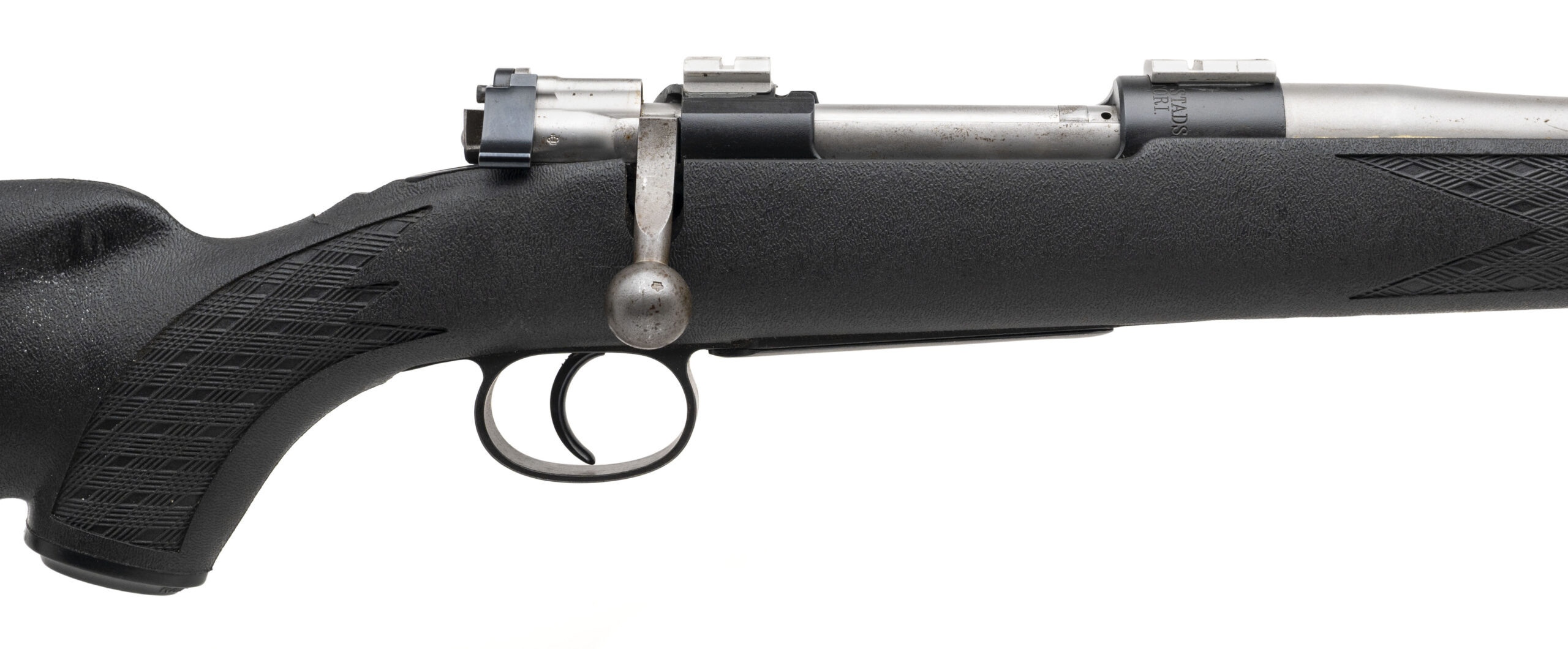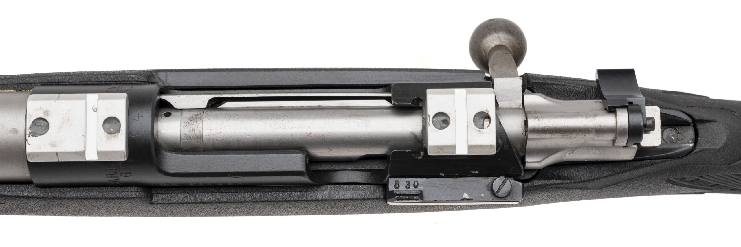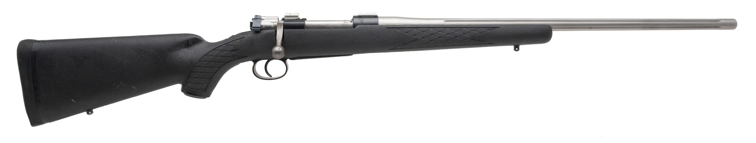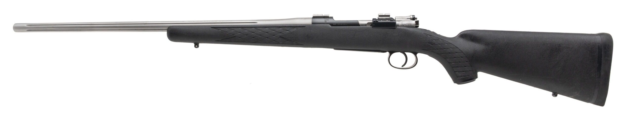 SN: HK331830 Swedish Mauser M96 Sporterized by "Kimber of America" in Clackamas Oregon with a 24" fluted stainless barrel chambered in 308 Win. Forged bolt handle and flag safety, Weaver style scope bases and original bottom metal bedded into a Ram-Line synthetic stock. Some light handling marks but overall in very good condition with an excellent bore.