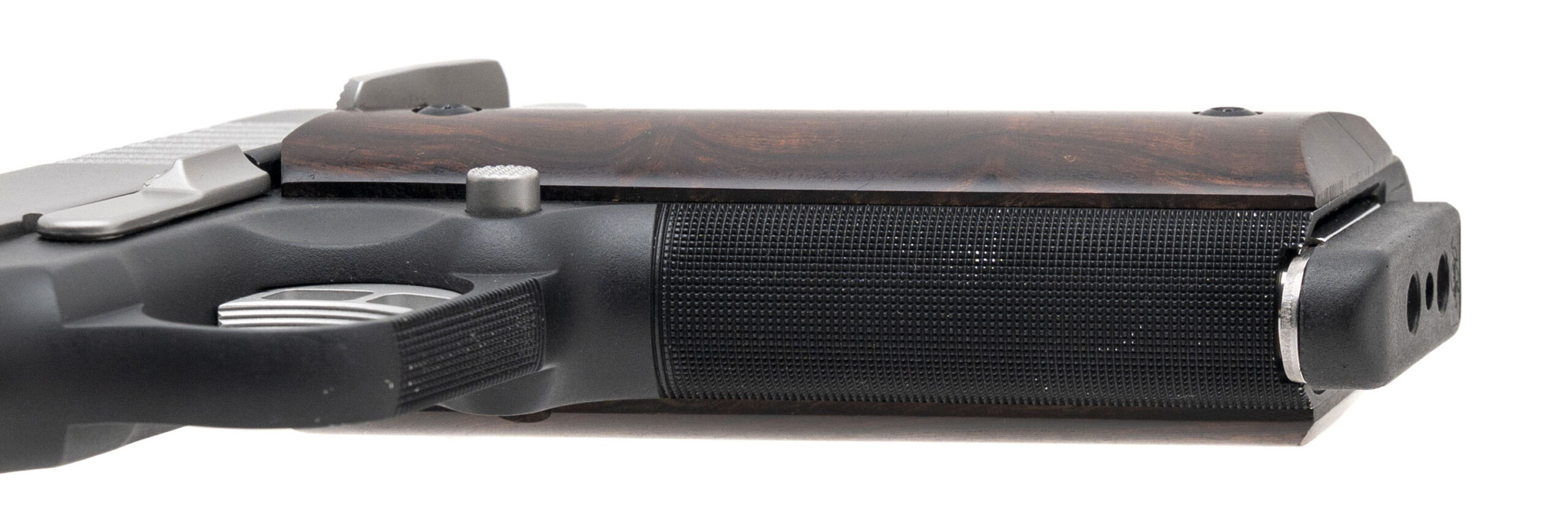 SN: KR128818. Modern production, .45 Auto with a 4" barrel. Bore is bright with strong rifling. Custom shop Pro model 1911 style pistol with night sights. Two tone finish is near excellent. Wood grips are excellent. Comes with case and extra magazine. Overall condition is excellent.
