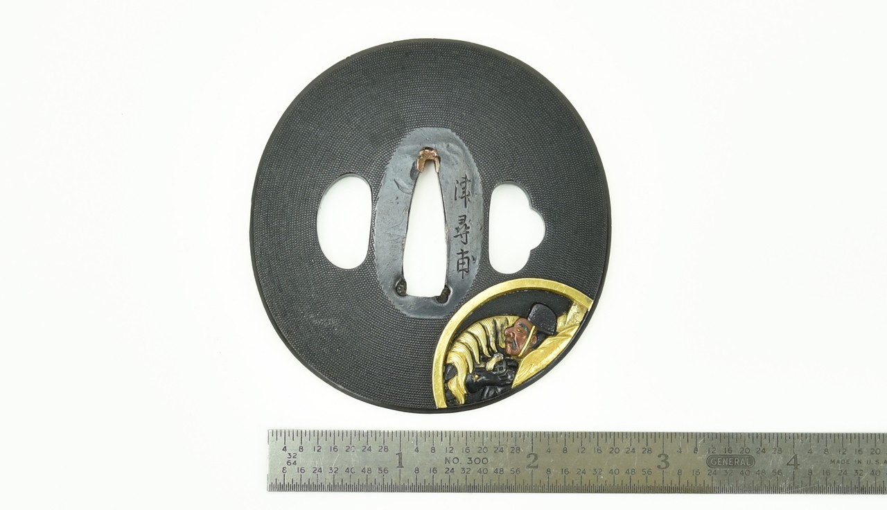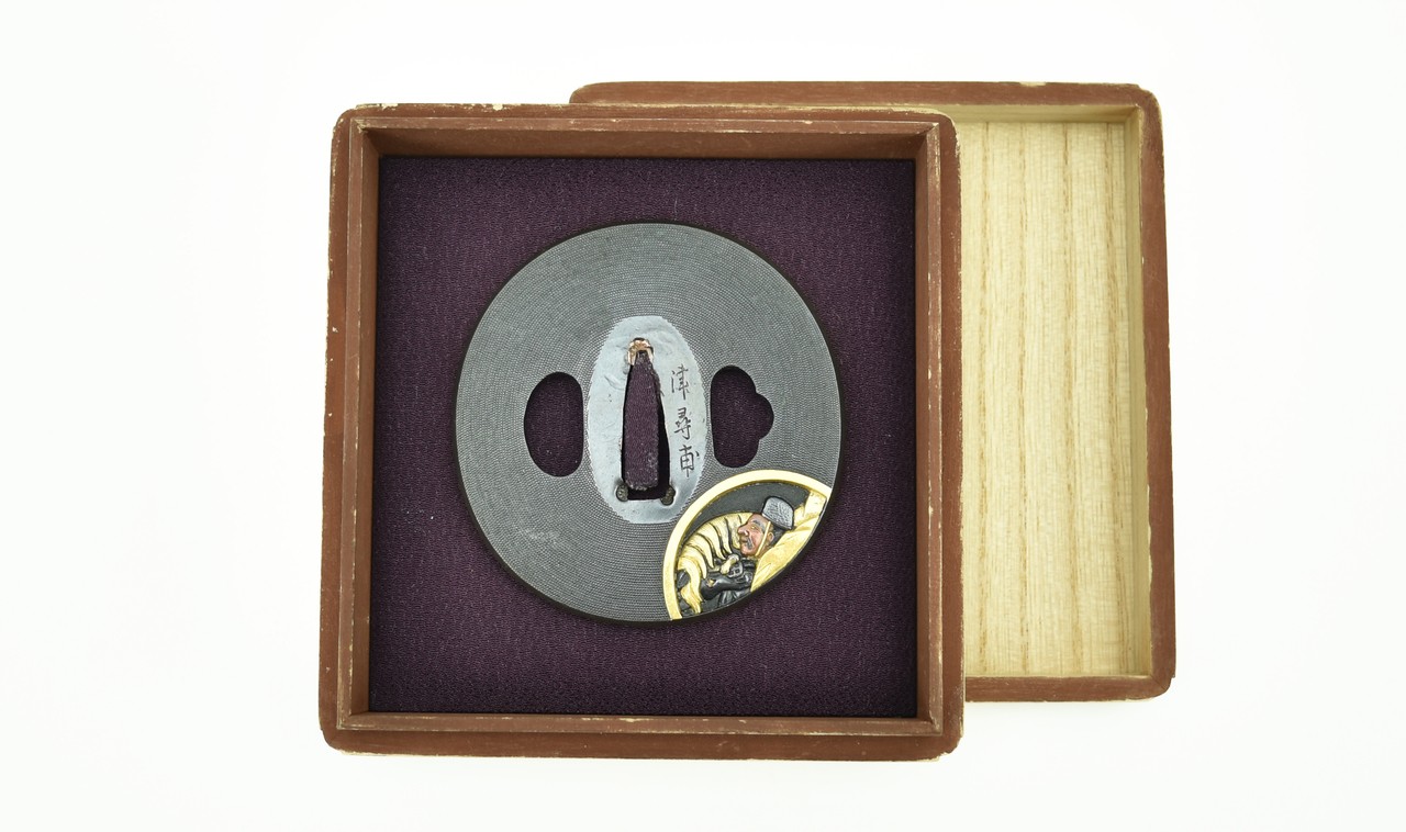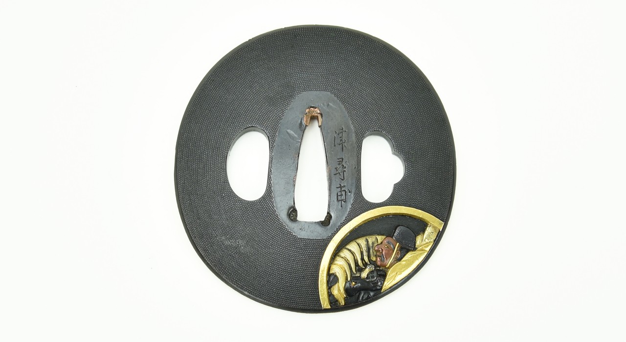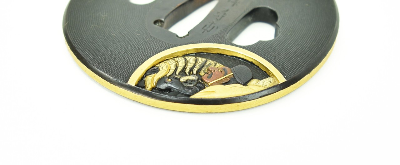 Kinko Tsuba. Shakudo Nanako ground. Scene depicts a groom with horse nuzzling him. The reverse with a gold rope bearing sacred paper slips in silver. Rim is lined in gold with cat-scratch pattern. An elegant Tsuba. Signed: Toshi-suke.
