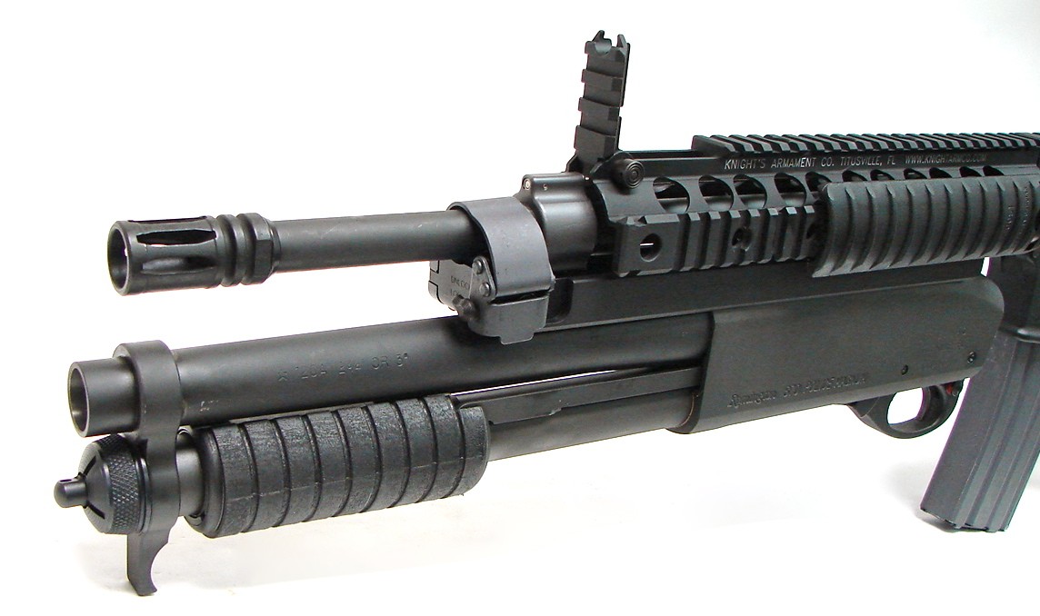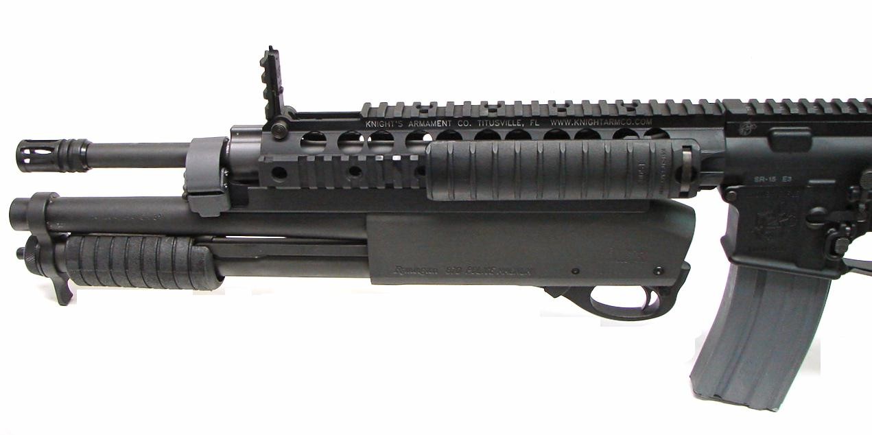 Knight Mfg. SR-15 E3 5.56 NATO caliber rifle. KAC rifle with 16” barrel, URX II quad rail, KAC BUIS, KA rail cover, ambi-controlled lower receiver, KAC vertical forearm grip, LMT SOPMOD stock, 1-30 round magazine, hard case and 2-QD swivel slings. YES! you too could be like “BILLY” from the movie “PREDATOR” with a MASTER KEY under your rifle! Remington 870 Police Mag 12 GA shotgun. KAC marked Master Key and Knights Armament rifle with 16” barrel, URX II quad rail, KAC BUIS, KA rail cover, ambi-controlled lower receiver, KAC vertical forearm grip, 1-20RD mag, hard case and 2-QD swivel slings. The Master Key is a Remington 870 SBS with 4RD capacity and front hand stop. Class III item. NFA rules do apply.