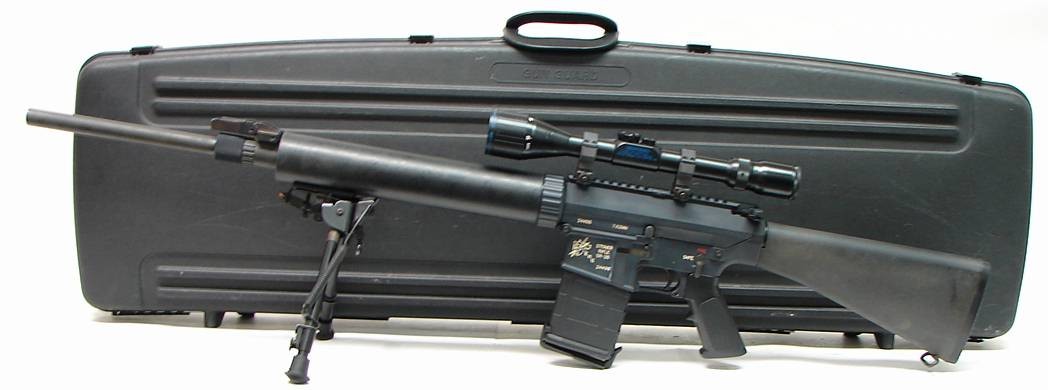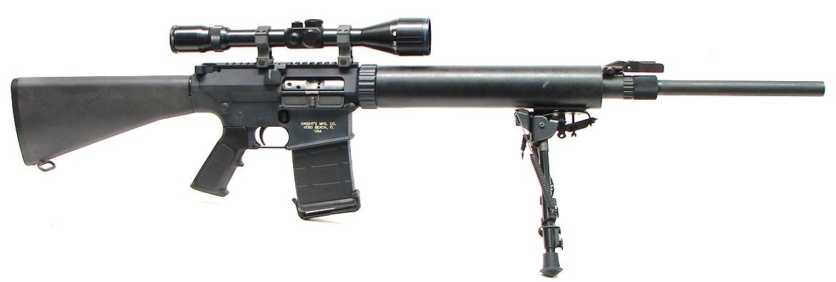 Knight Mfg. SR-25 7.62 mm caliber rifle. Military grade long range semi-auto sniper rifle. Very good condition with Shepherd 3X1 (R11058)