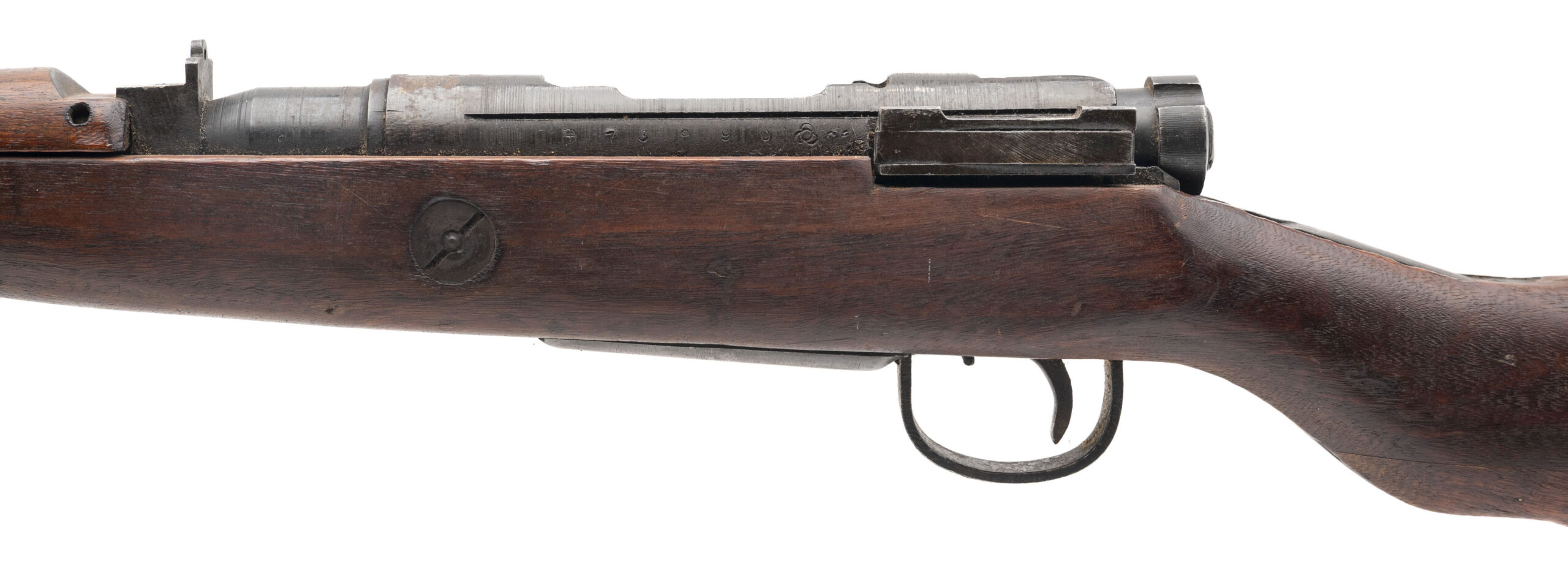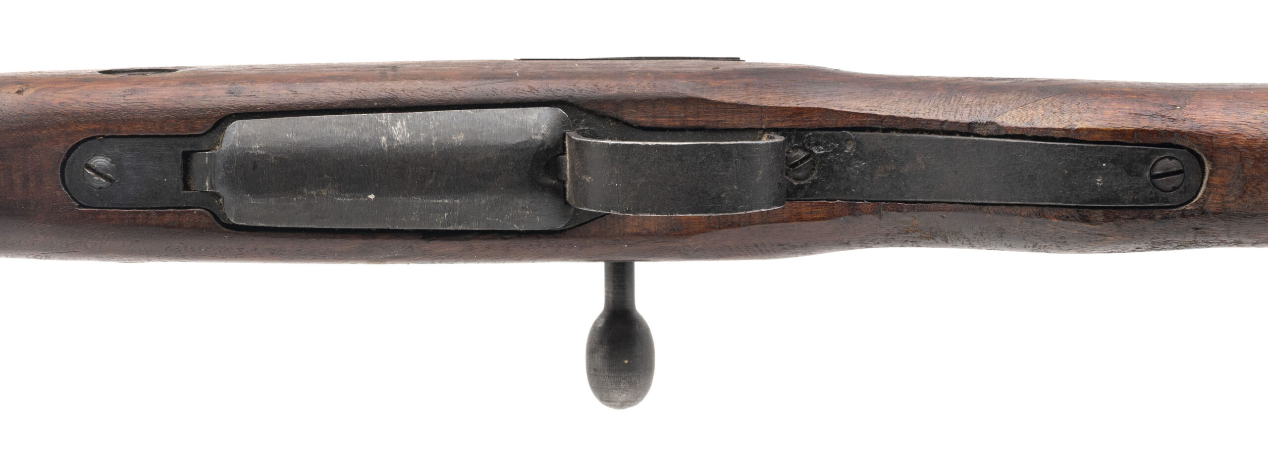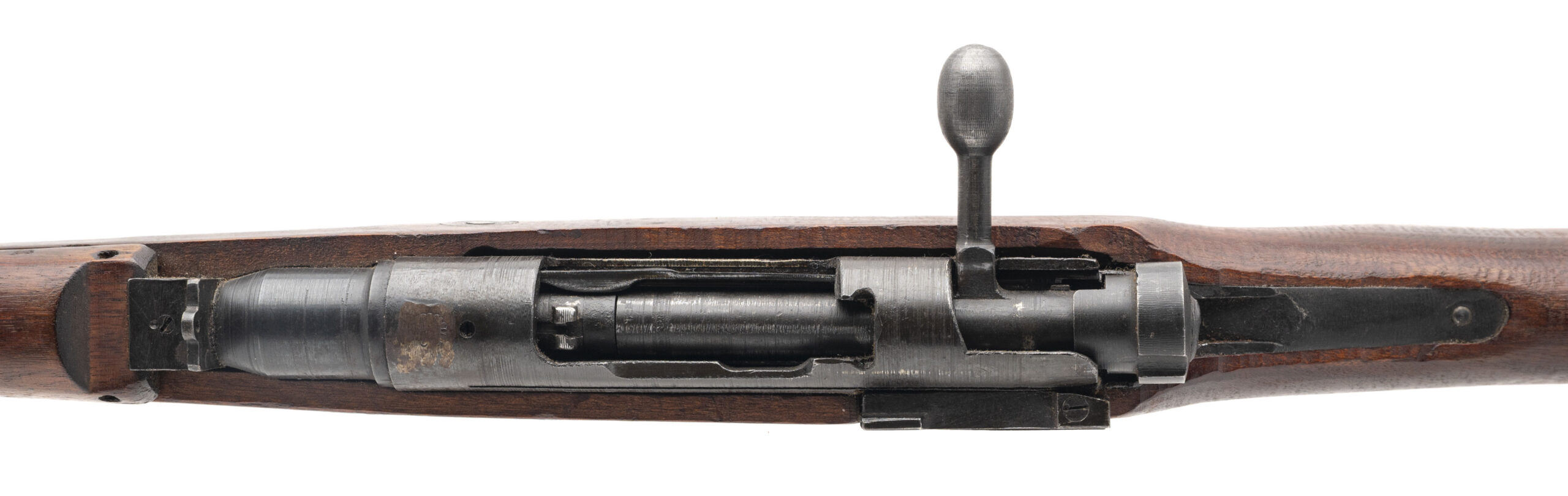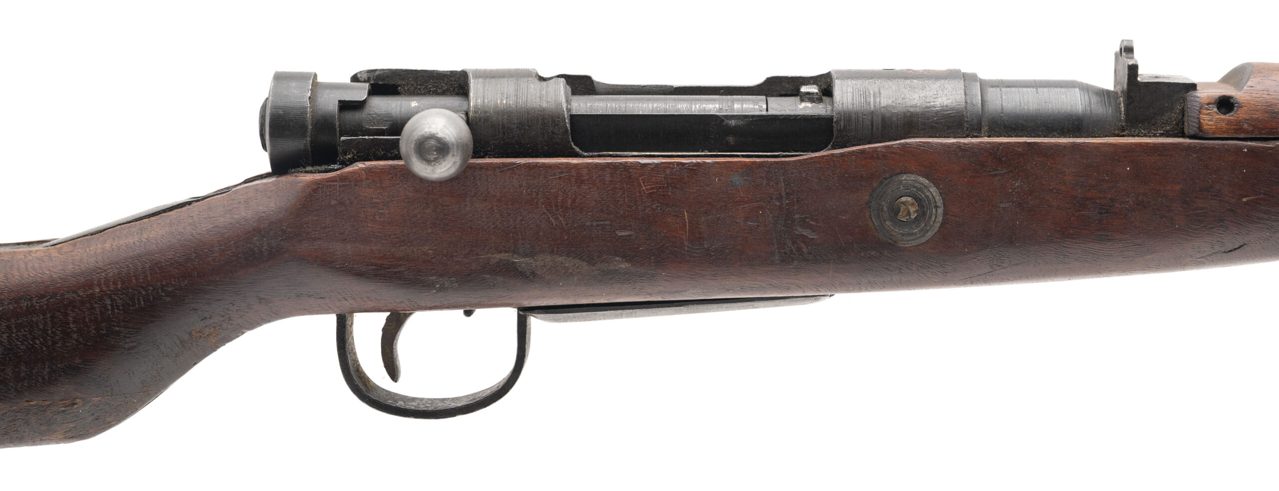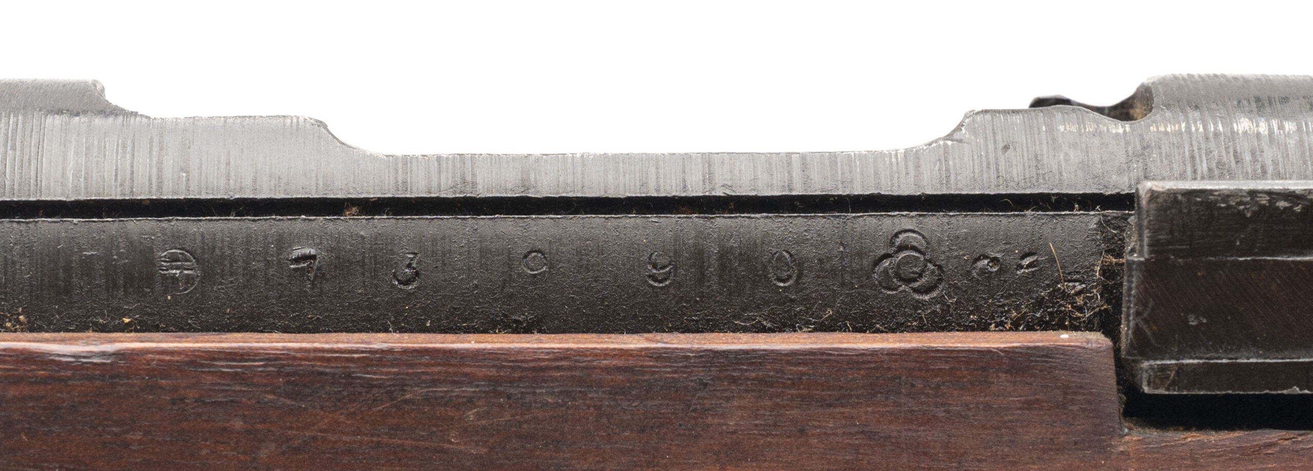 SN: 73990 (in series 25). Bolt-action Imperial Japanese military rifle made by Kokura arsenal near the end of World War 2. Standard 26" barrel chambered for 7.7x58mm Arisaka. "Last ditch" pattern rifle with simplified barrel band, sights, rough-turned safety and wood, and wooden buttplate. Bolt handle and firing pin sleeve are numbered "630". Bore is dark with rifling remaining. Mum has been ground.