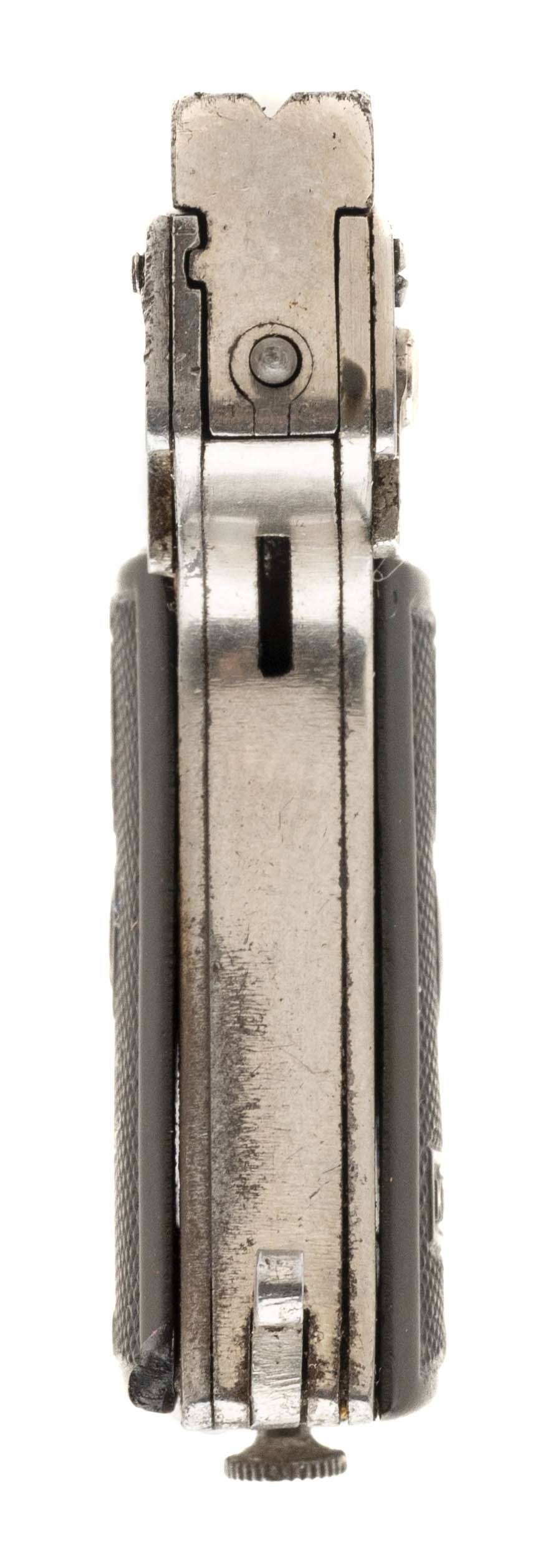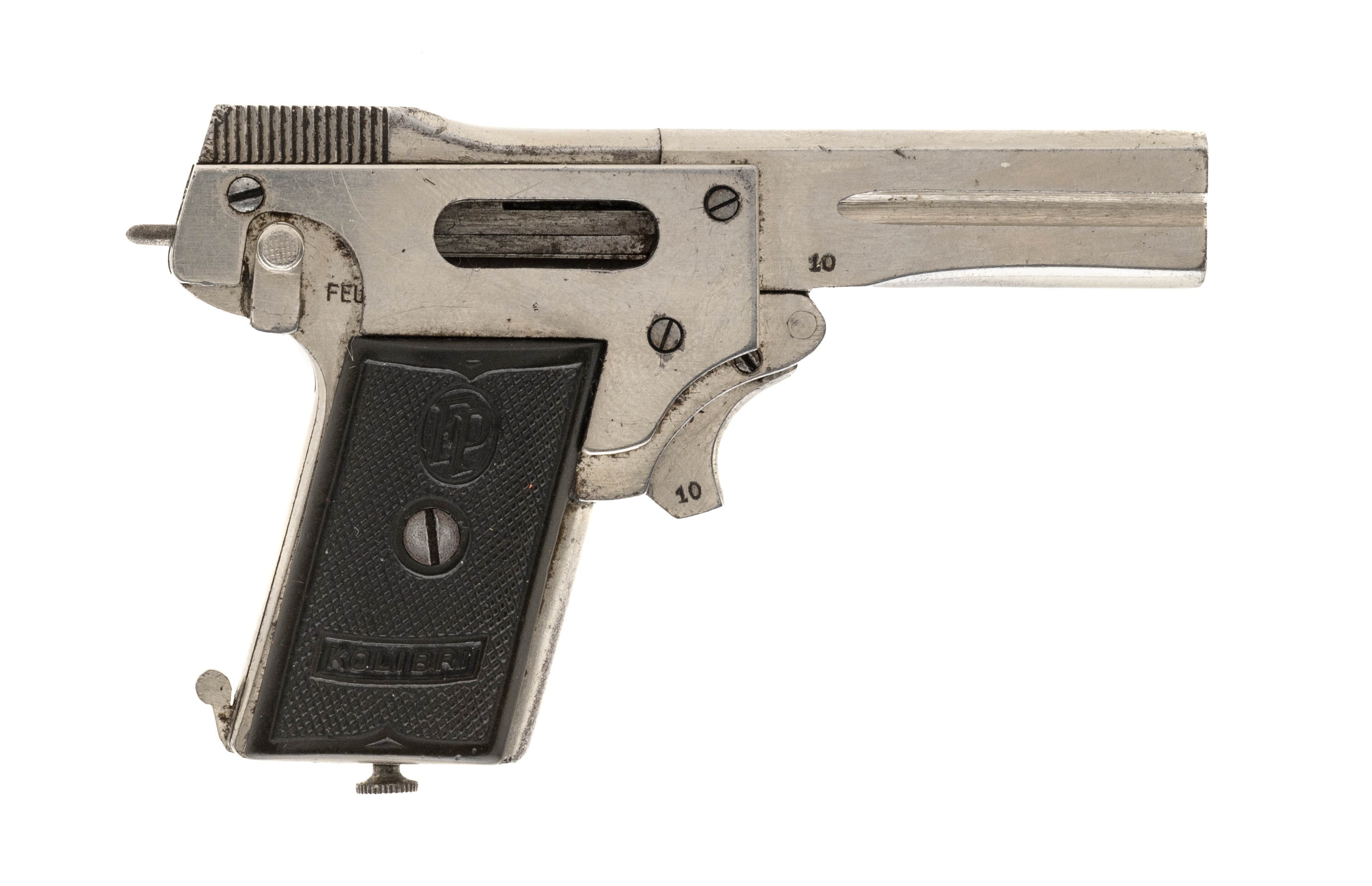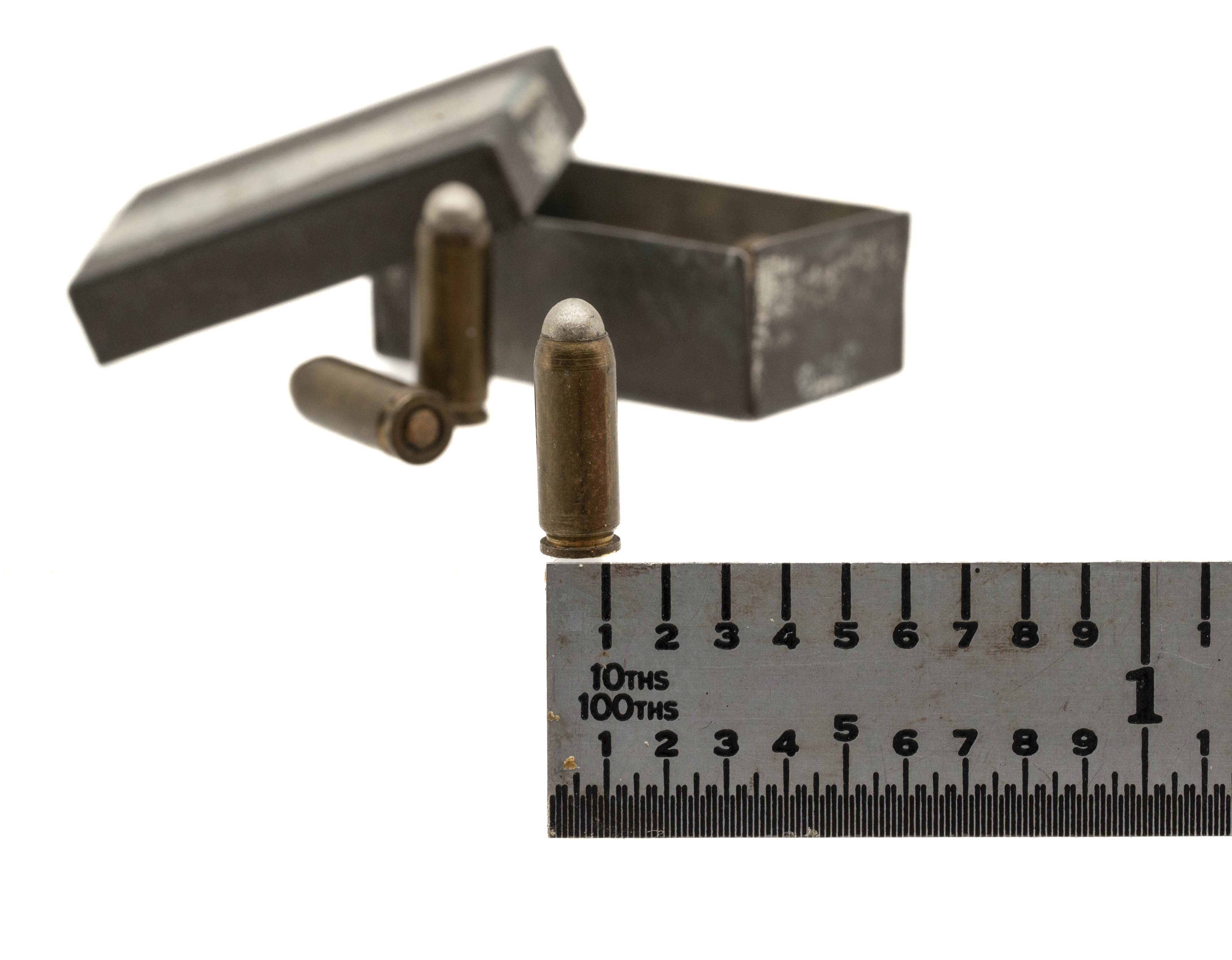 SN: 10. Rare stainless micro pistol with 1.5" barrel and 7rd capacity. Approximately 1000 were produced from 1910 to 1938. The bore is excellent. The actions work properly. All visible serials are matching and all markings are sharp. The left side of the barrel is marked "79459.13" and a proofmark. Has a a small box of 9rds of 2.7mm.