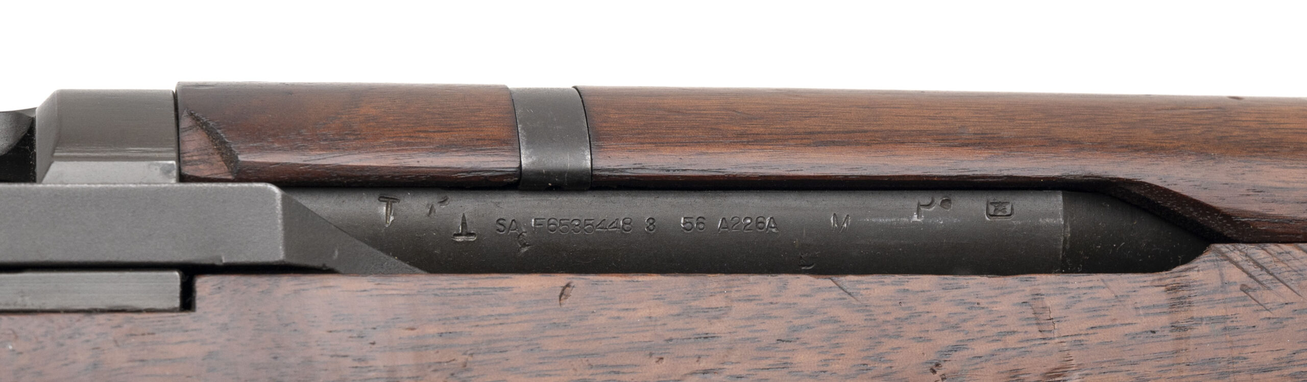 Serial No. 4264230, manufactured circa 1952–1954, .30-06, 24” round barrel marked “SA F6535448 8-56 A226A” This late-pattern M1 Garand was produced during the Korean War era by Springfield Armory, featuring a postwar barrel dated August 1956. The bolt is marked “6528287-SA/Y01,” while the receiver is marked “A38B/D 6528291 43.” The cut op-rod is stamped “6535382 IHC,” and the trigger group is correctly marked “SA.” The stock is in very good condition, showing only light surface impressions from service use. Action is smooth and functions correctly. Rifle comes equipped with a sling. A solid representative example of a Korean War Springfield Garand.