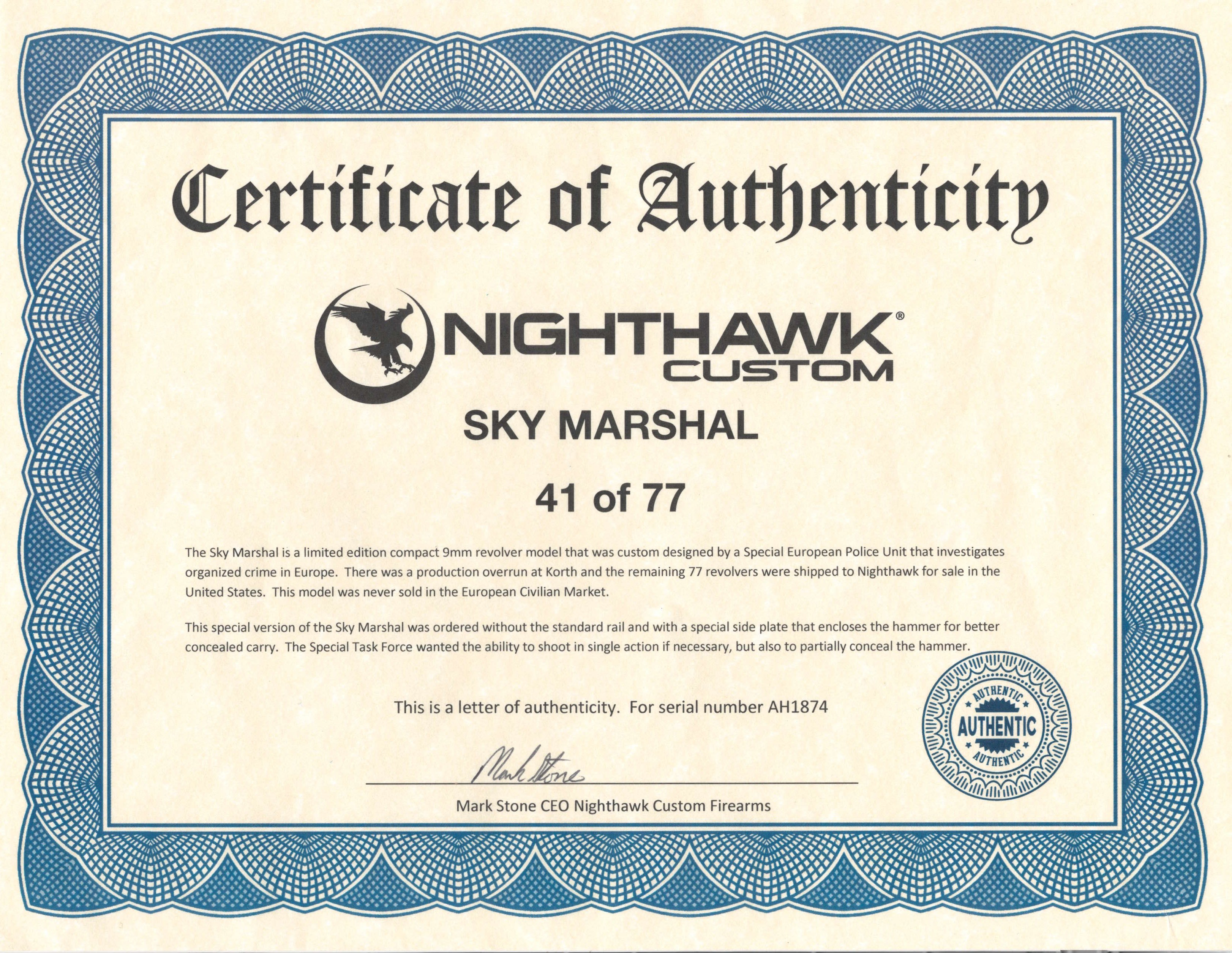 Korth Nighthawk Sky Marshal 9mm caliber revolver. Rare Korth Sky Marshal “One of 77” manufactured for a European Police Agency. Excellent condition with case, speed loader and paperwork.