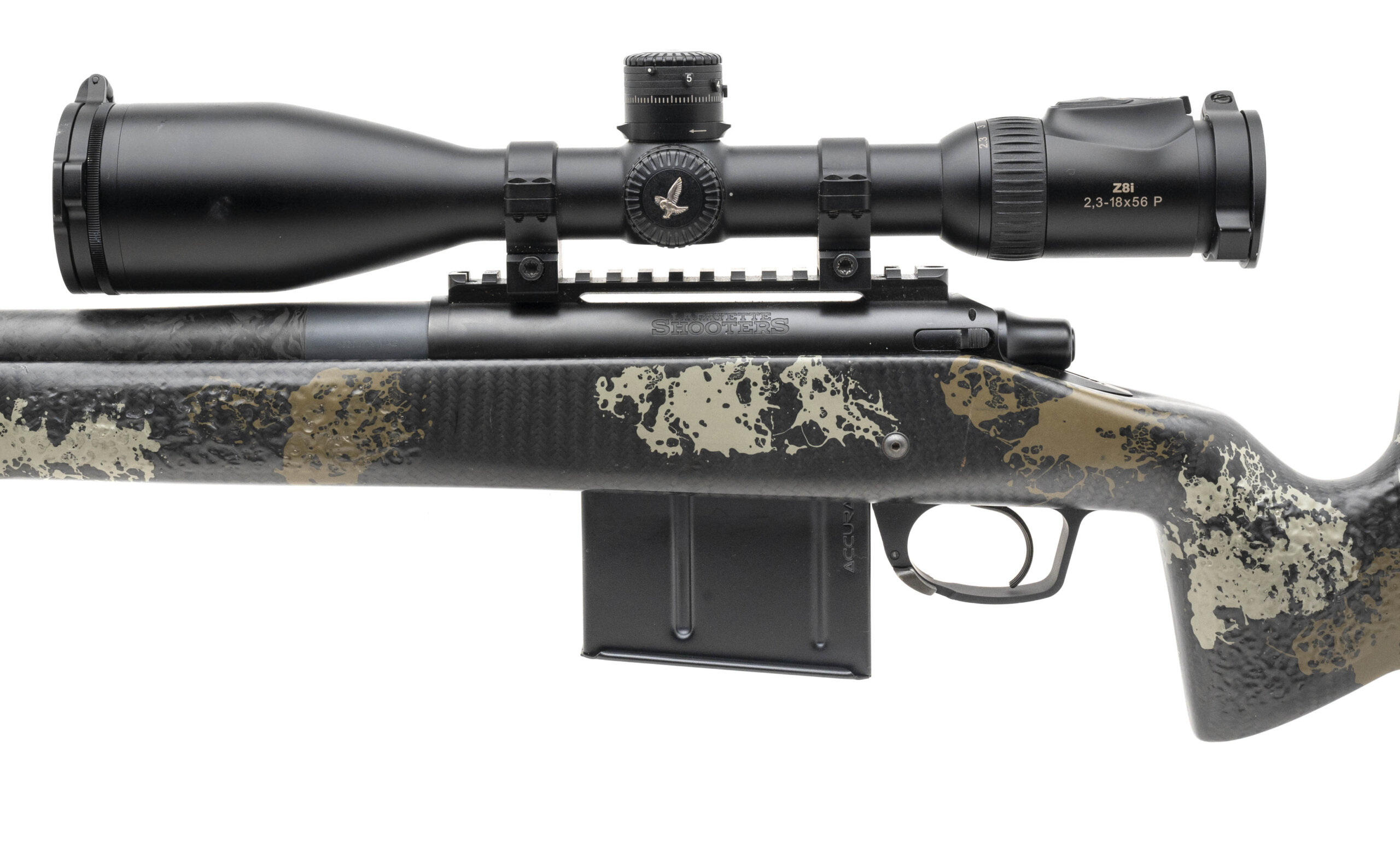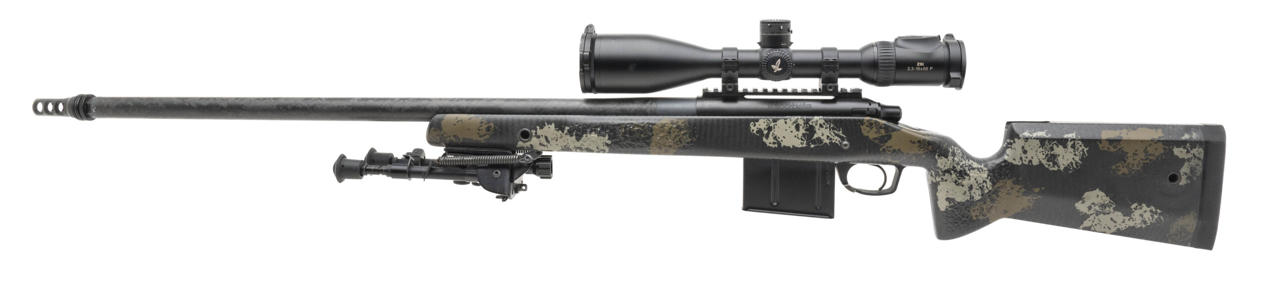 SN: F511948, Modern production, .300 Win Mag with a 26" threaded Proof Research carbon fiber barrel with muzzle brake. Custom bolt action hunting rifle built on a Defiance action, Trigger Tech "Special" Trigger, and Harris Bi-pod. Bore, Elite Tactical Camo Finish, Manners EH1 Elite Tactical Camo stock with mini chassis are in excellent condition. Rifle comes with Swarovski Z8i 2-3-18X56 scope, Swarovski Z8i Ballistic turret, and Swarovski magnetic scope caps.