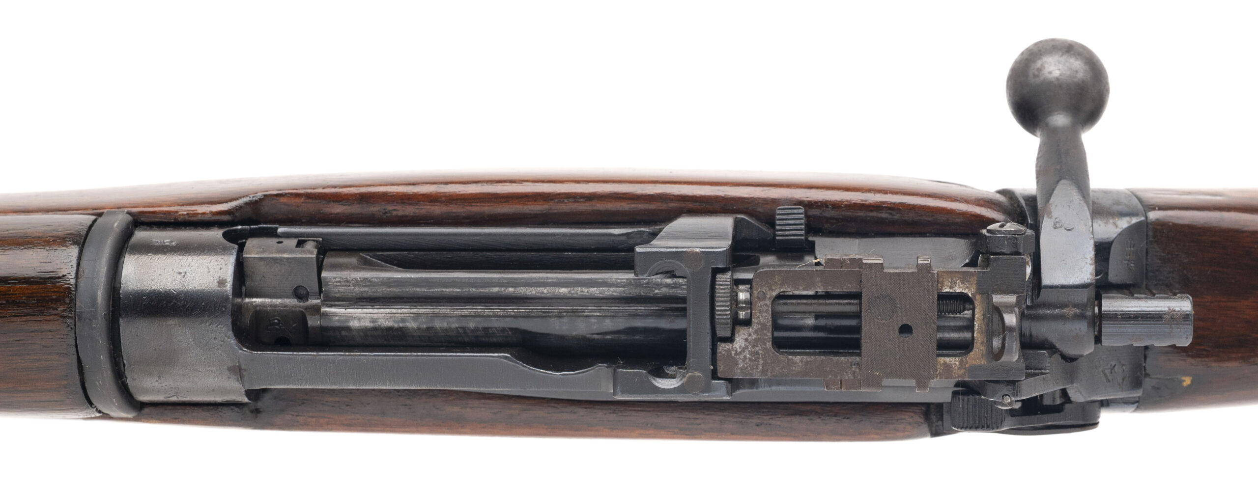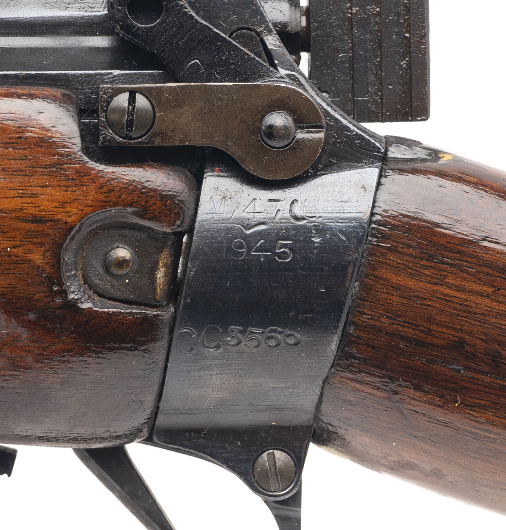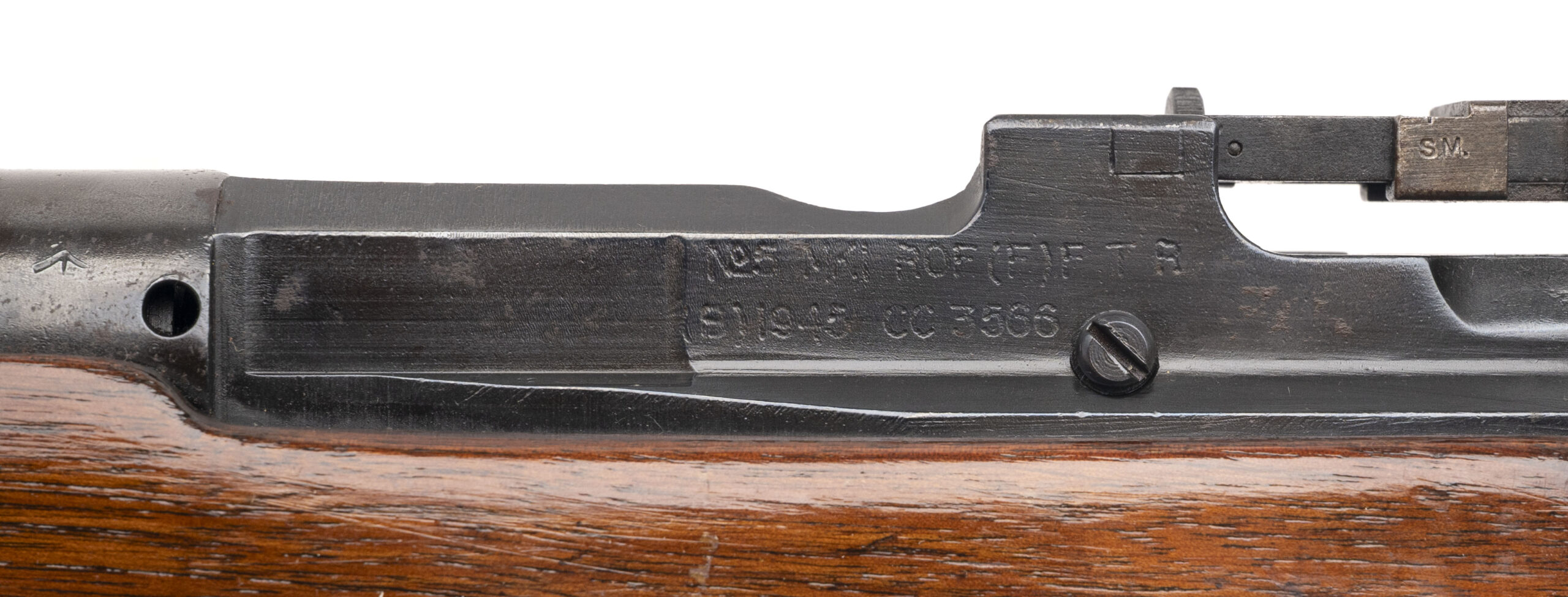 Serial number CC3566. This legitimate Lee-Enfield No. 5 Mk. I Jungle Carbine was made at the Royal Ordnance Factory (Fazakerley) in 1945 with an 18.75-inch barrel that has a bright bore with strong visible rifling. It is "FTR" marked (for "Factory Thorough Repair"), so it has undergone a comprehensive Repair/Recondition refurbishment & that is why it has been refinished. Condition overall is excellent with black enamel finish across the metallic parts that has thinned & oxidized on the flash hider/bayonet lug. The varnished walnut furniture has been refinished, but the handguard & stock are matching in color & condition. Comes with an original 10-round detachable box magazine.
