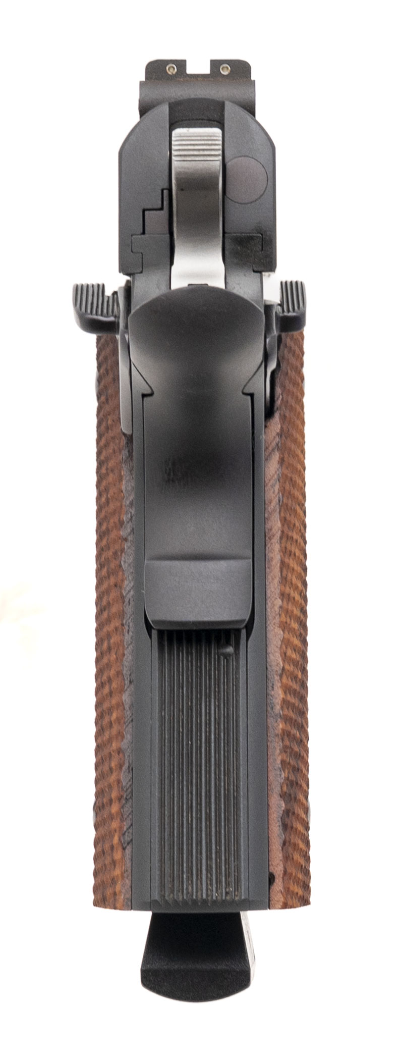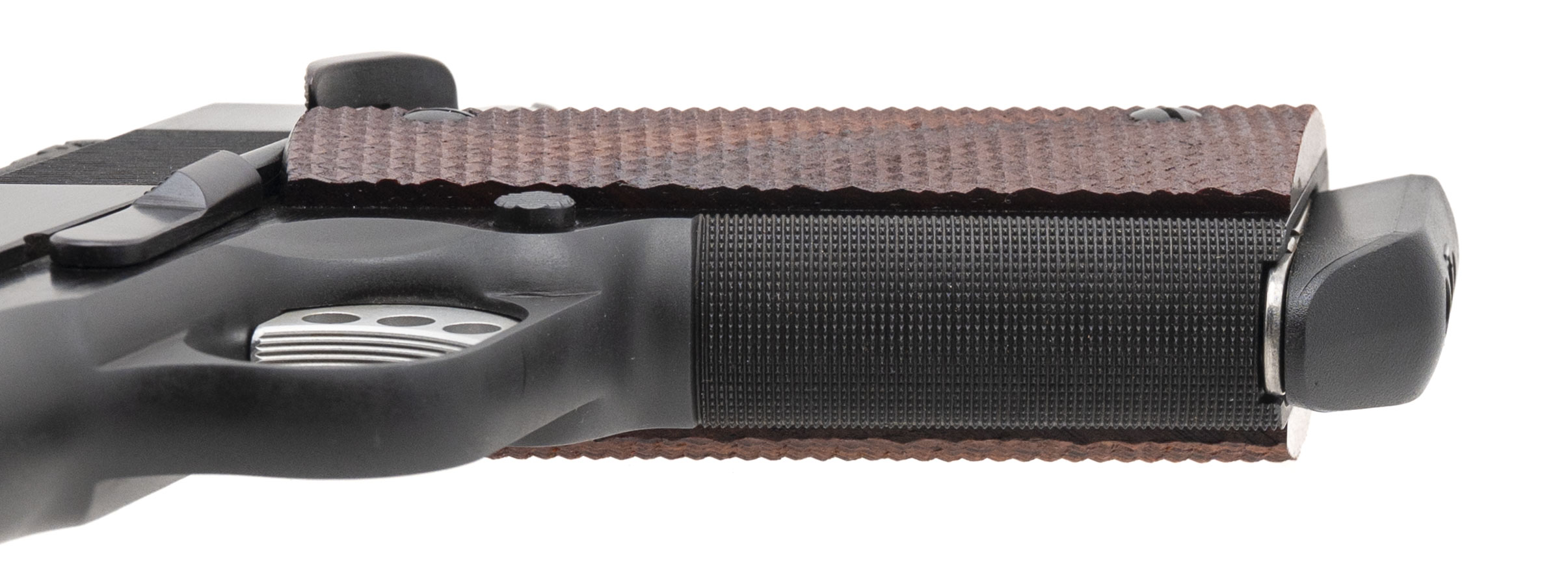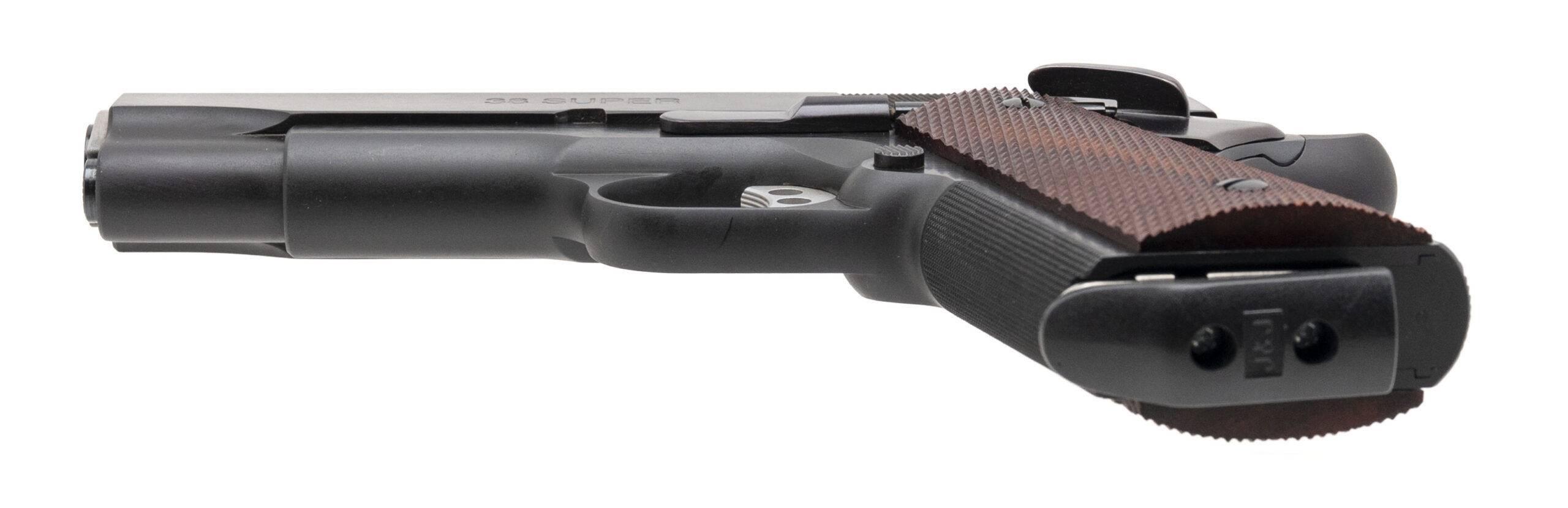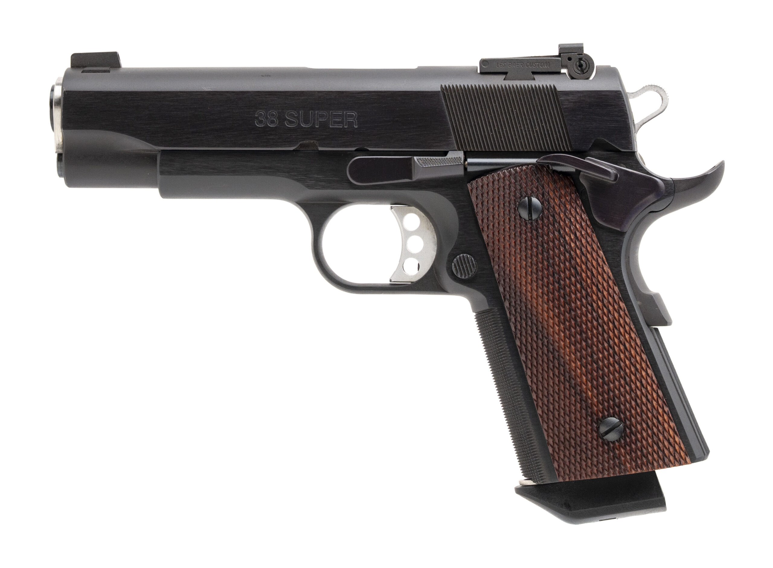 SN: LB33692. Modern production .38 Super with a 4.25" barrel. Custom grade 1911 with a Commander size barrel and Compact grip frame. Has a blue finish and adjustable sights. Excellent condition overall.