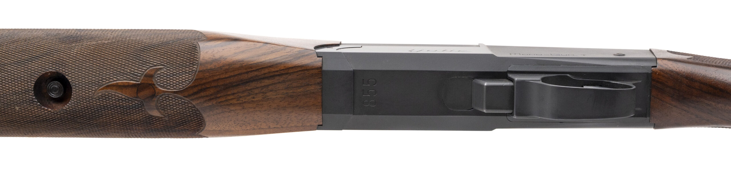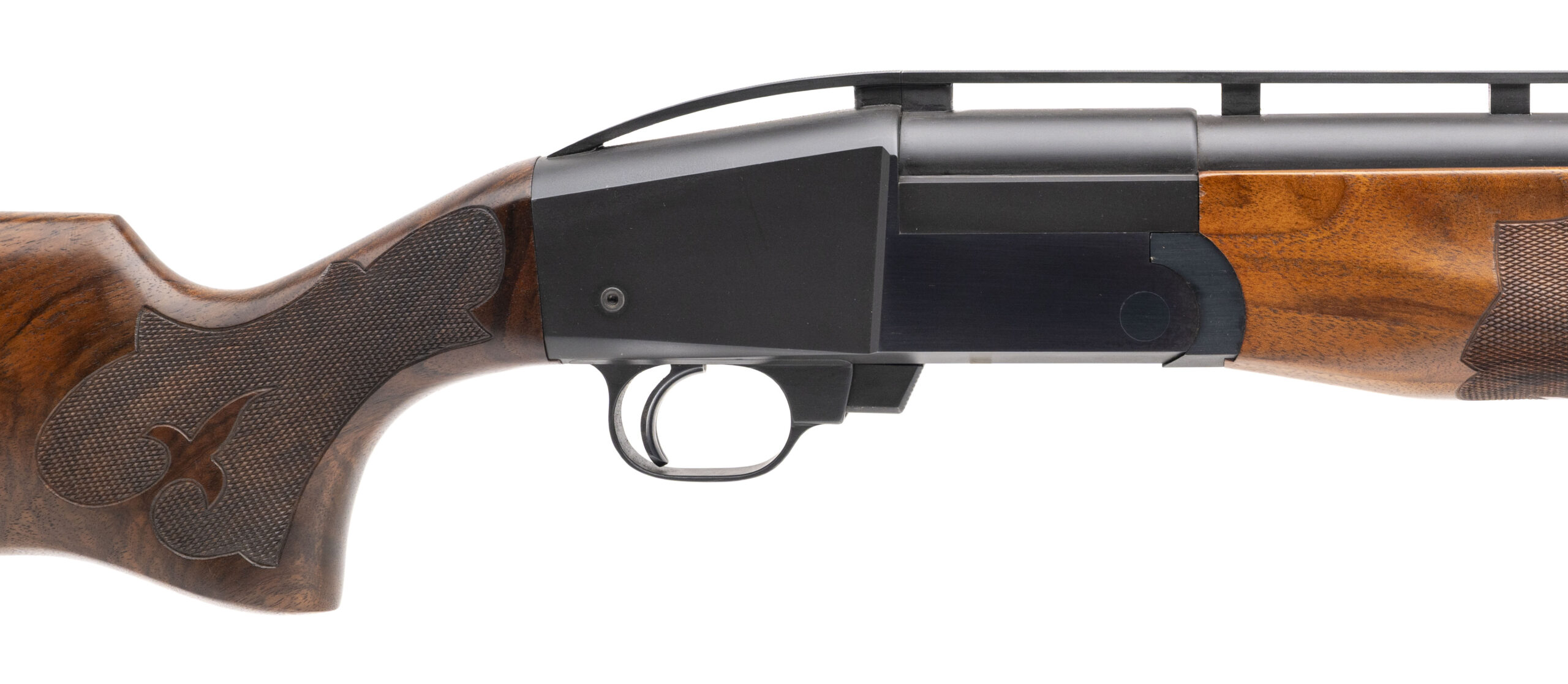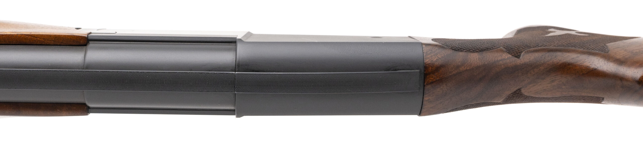 SN: 855. Single barrel trap shotgun with a 34” vent rib barrel with a 2 ¾” chamber and fixed choke measuring .039 (Extra Full). Highly figured checkered walnut futniture with fluer de lis checkering and a 14 ¾” LOP to the adjustable butt plate with trap pad. Overall very tight gun with solid lockup in very good condition.