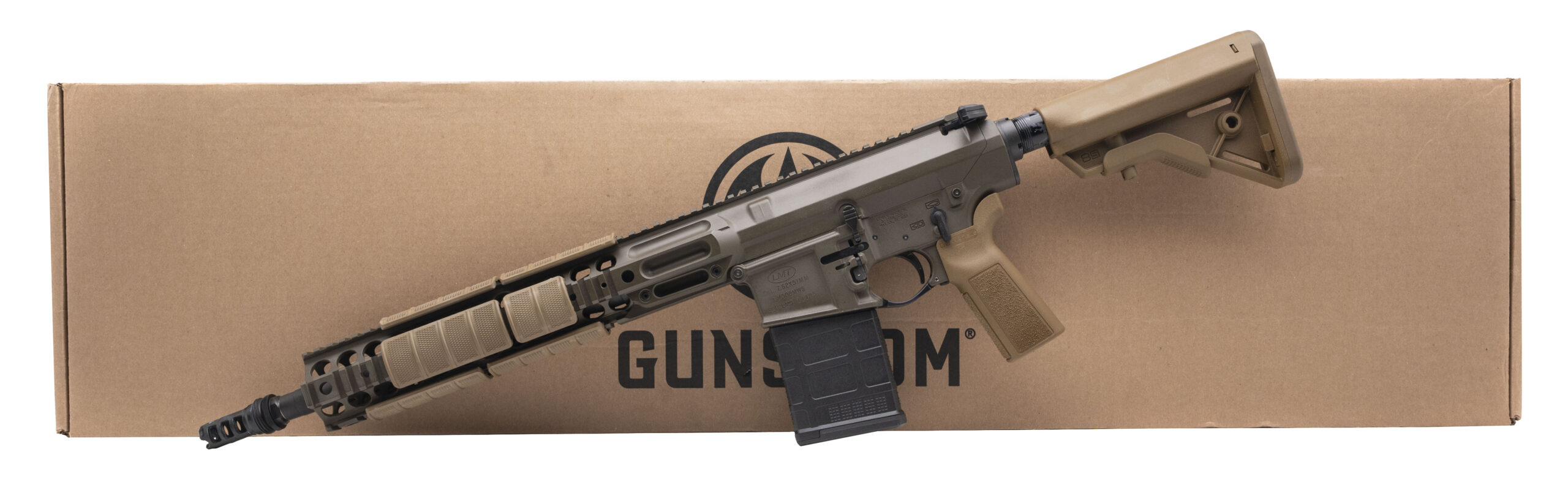 SN: LMS11185. Modern production, 7.62 NATO with a 13.7" barrel w/pinned & welded suppressor ready Lantac muzzle device. Bore is bright with strong rifling. Semi-auto tactical rifle with ODG cerakote finish, quad rail w/FDE covers, and coyote tan B5 furniture. Very good condition overall. Comes with a box and 3 extra magazines.