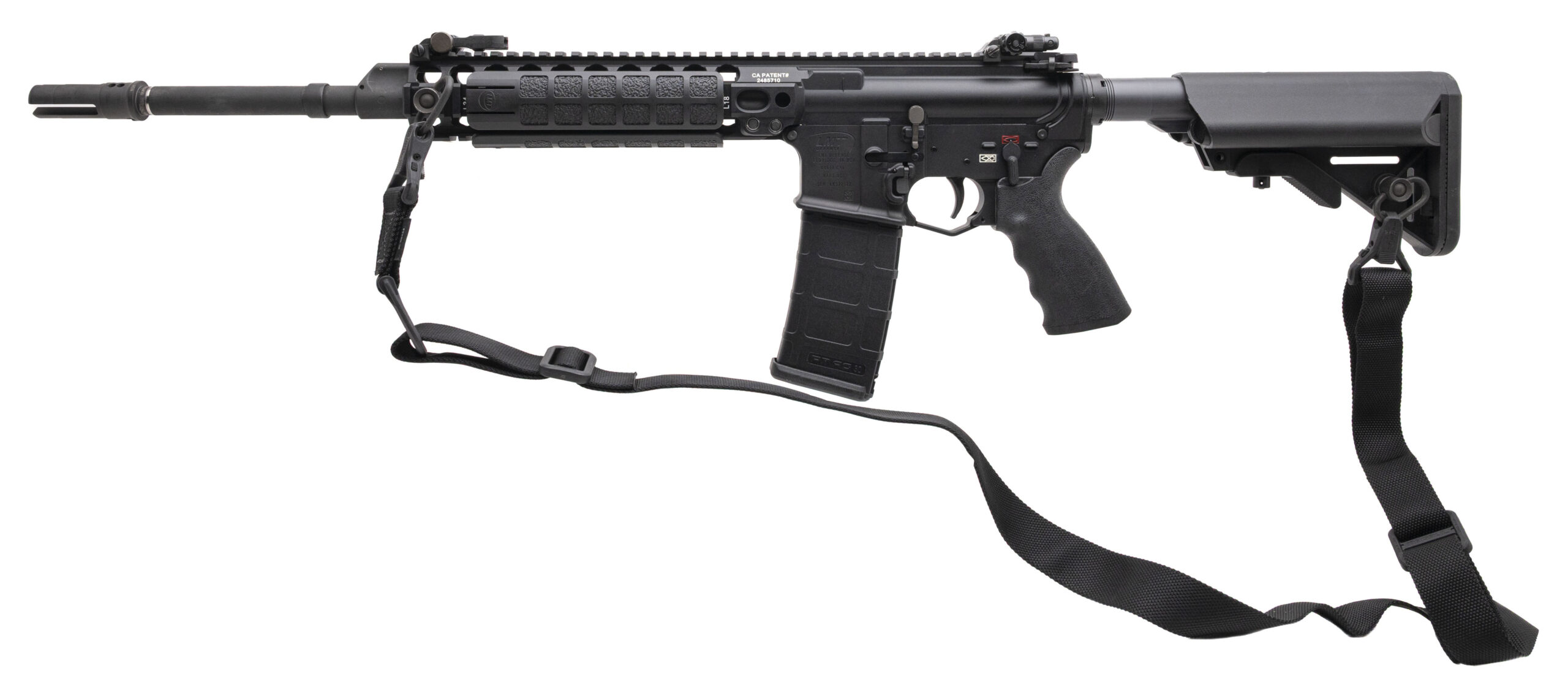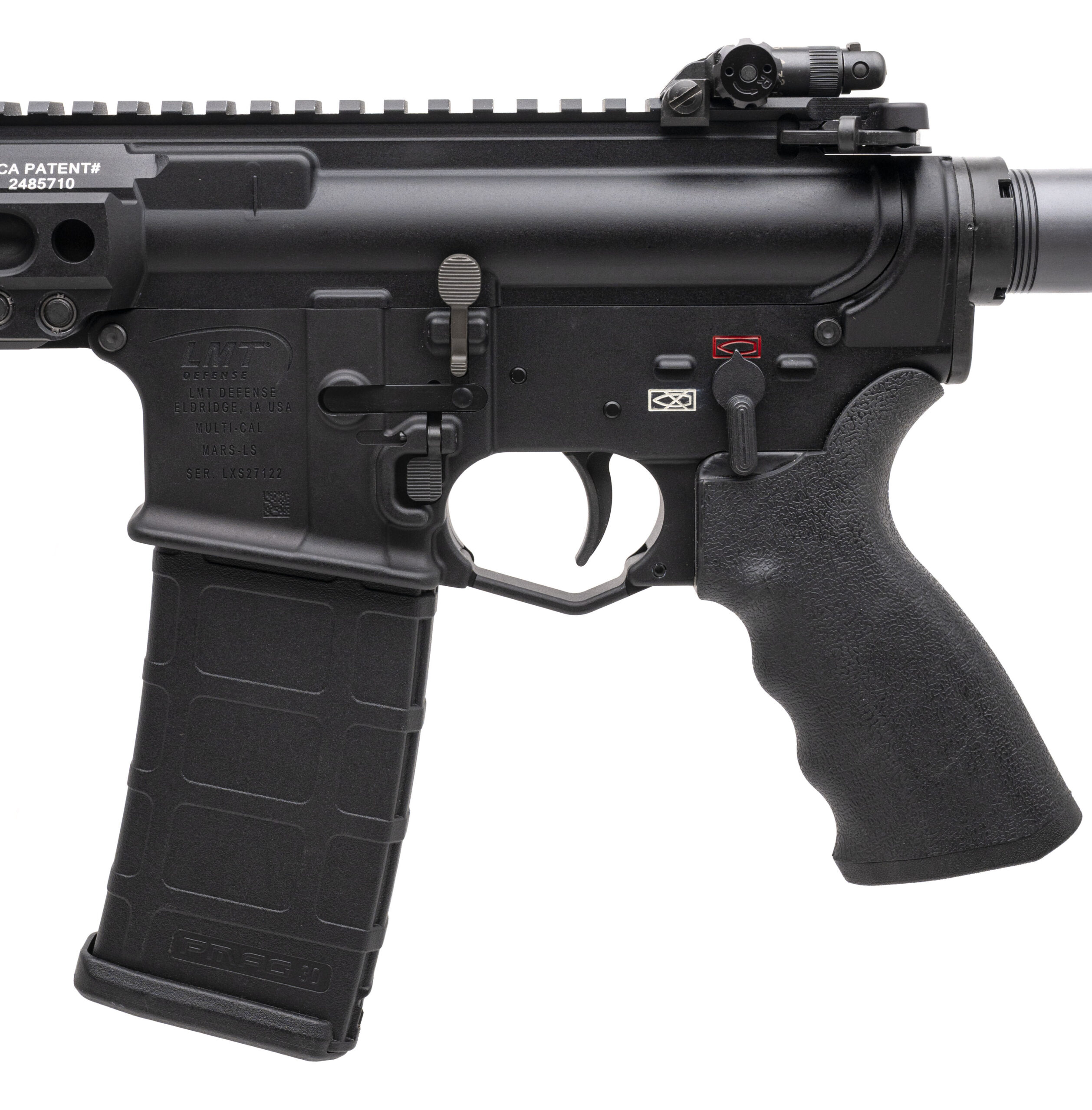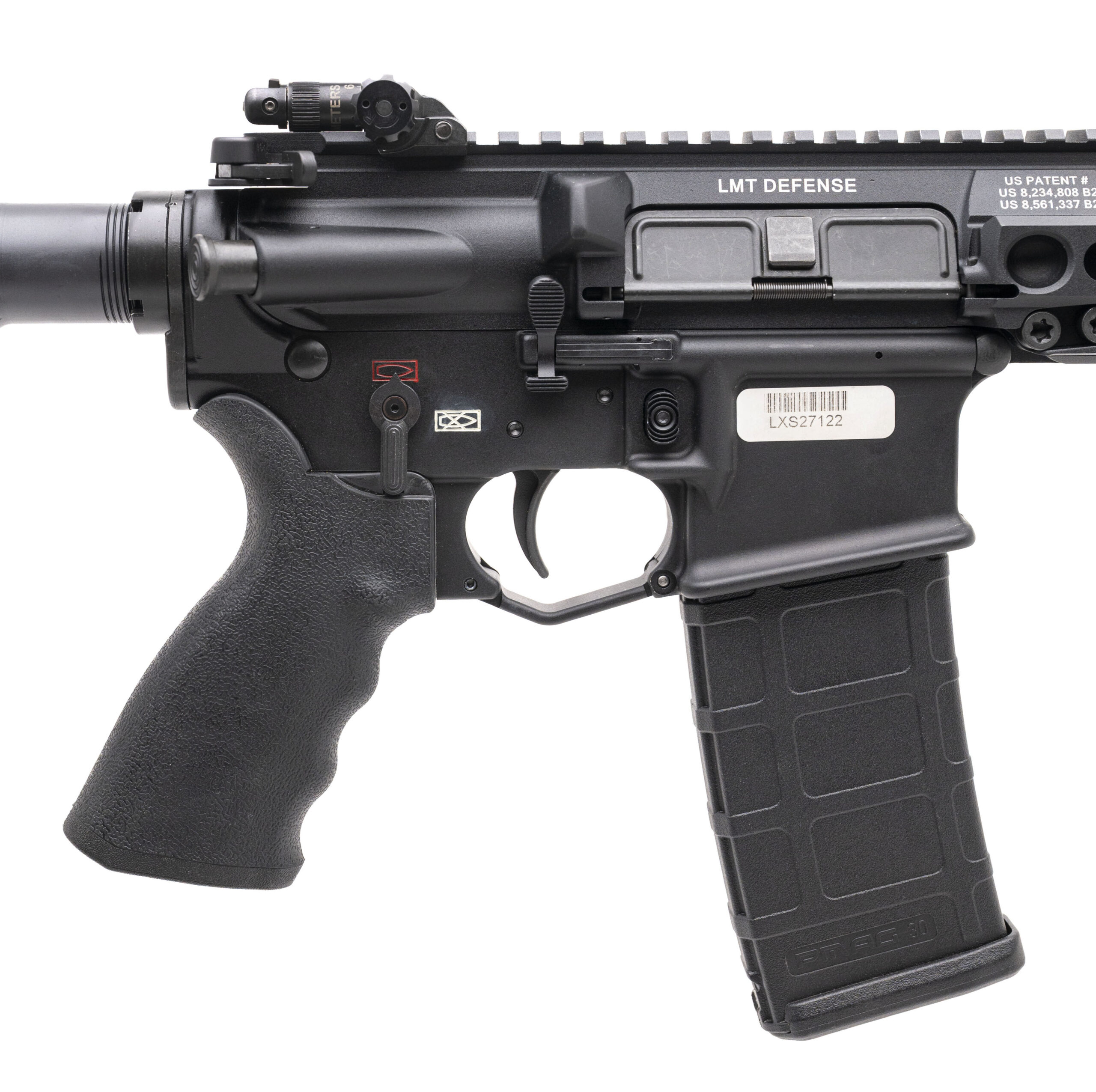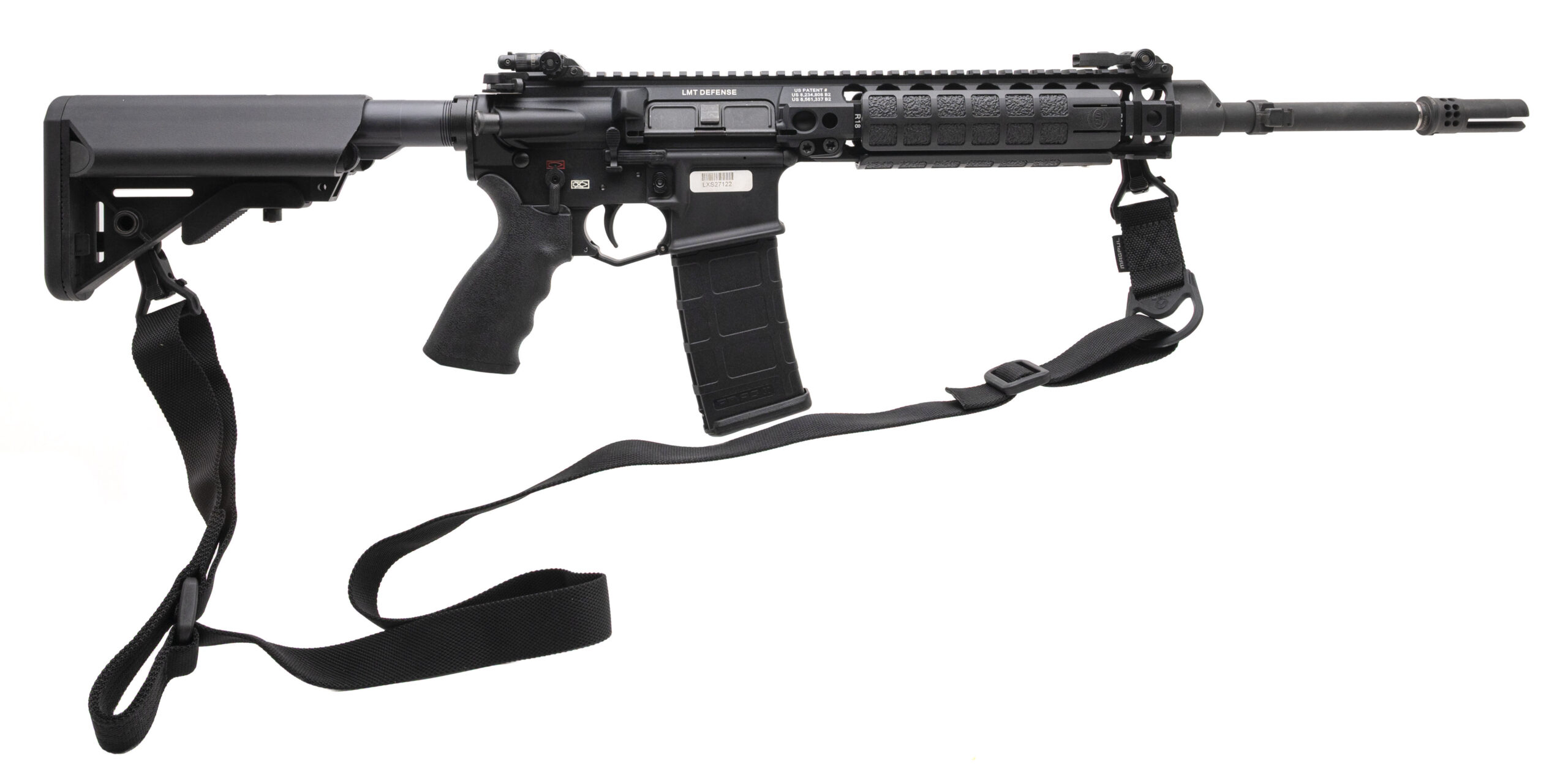 SN: LXS27122. Modern production, 5.56mm with a 16" barrel w/SF Warcomp flash hider. Bore is bright with strong rifling. New Zealand Reference model, semi-auto tactical rifle with LMT flip-up iron sights, side-mounted bayonet lug adaptor, full ambidextrous controls, and a Magpul sling. Near excellent condition overall.