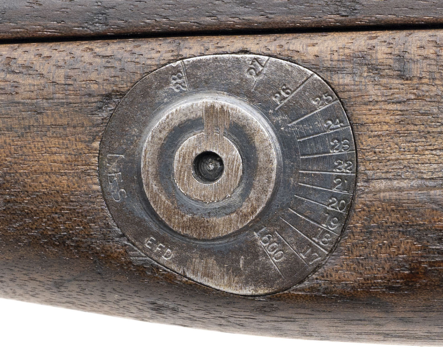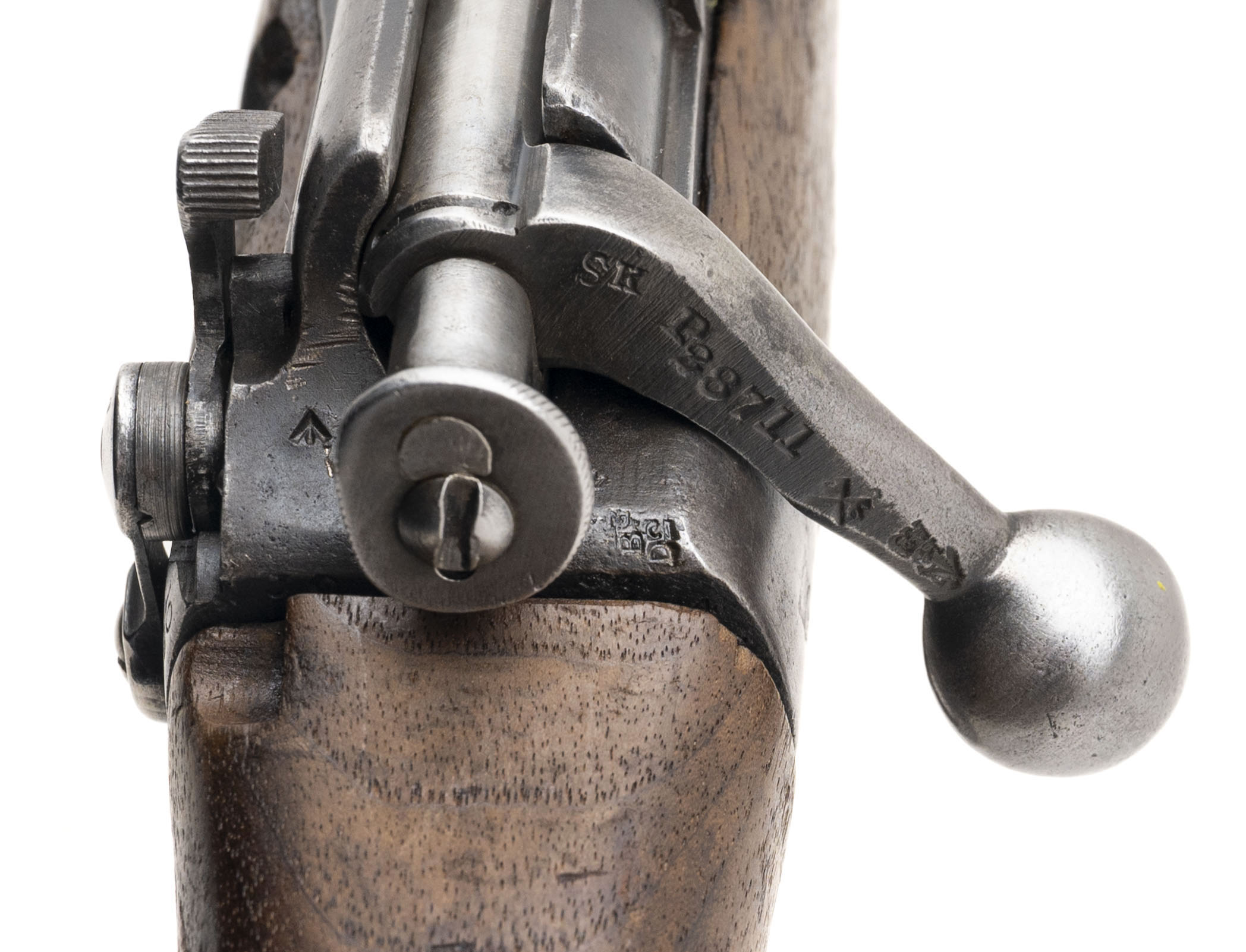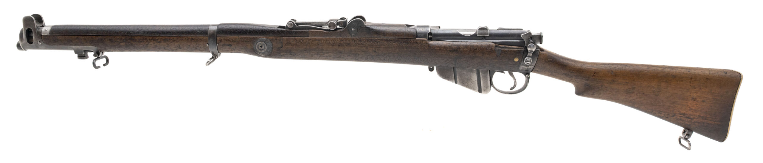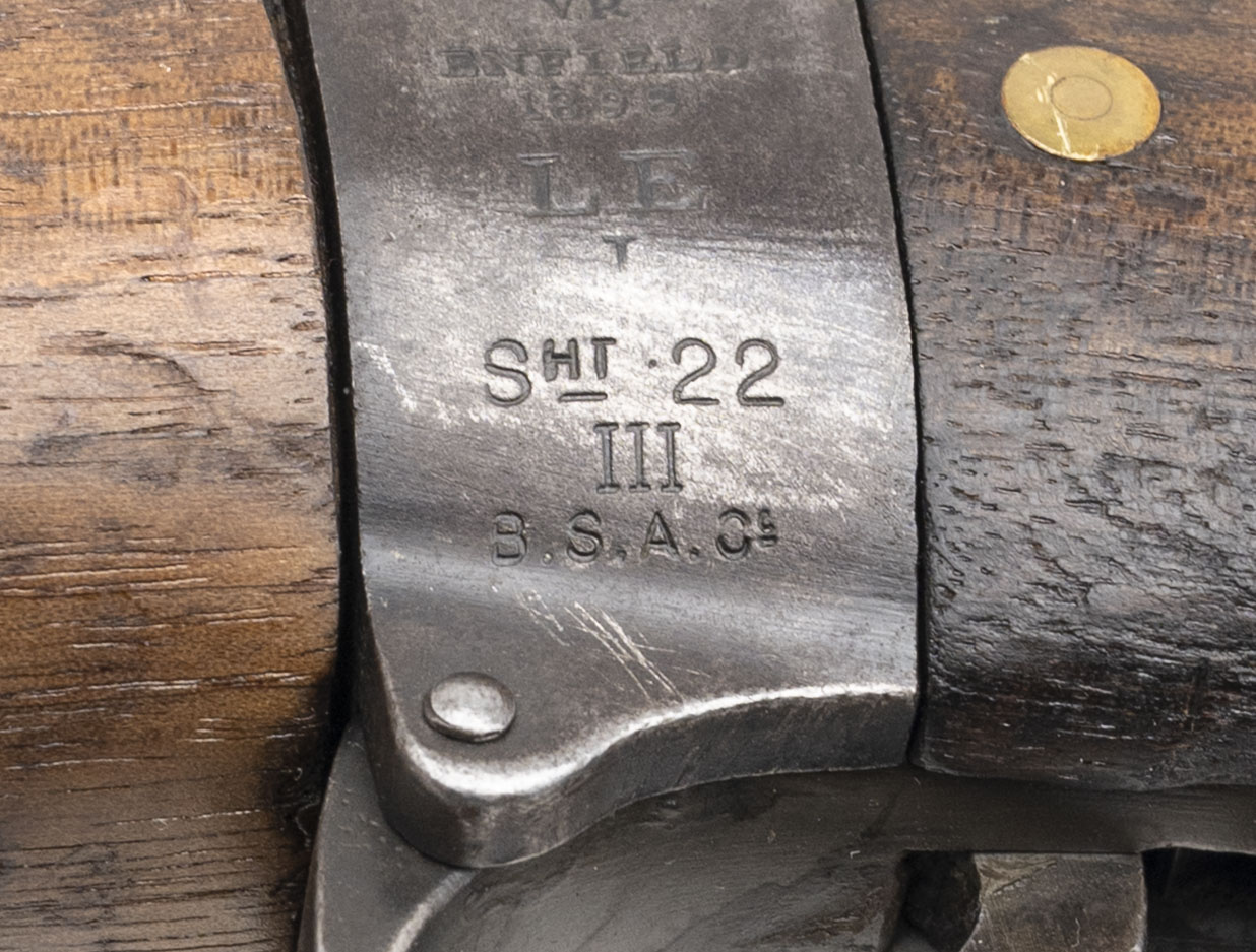 Serial No. P28711, originally manufactured in 1898 and later converted by Sparkbrook in 1905 to the Short Magazine Lee-Enfield configuration before undergoing its final transformation into a .22 caliber training rifle. Serial numbers are matching, and the magazine—correct for these conversions—is unmarked with its spring and follower removed. Metal surfaces have thinned to a light grey patina Consistent with age and service. The socket cup is marked "Crown/V.R./Enfield/1898/L.E./I/SHT.22/III/B.S.A. Co.,” with the opposite side stamped “Sparkbrook/1905/SHT. L.E./COND II,” clearly documenting its conversion lineage. The bolt head is properly marked “.22 No.2.” Stock remains in overall good condition with light handling impressions and visible arsenal repairs. A faint cartouche is present on the butt, and the stock disk bears the marking “R.P/5.15/7” between “P–G,” indicating unit or rack assignment. Action is smooth and functions correctly.