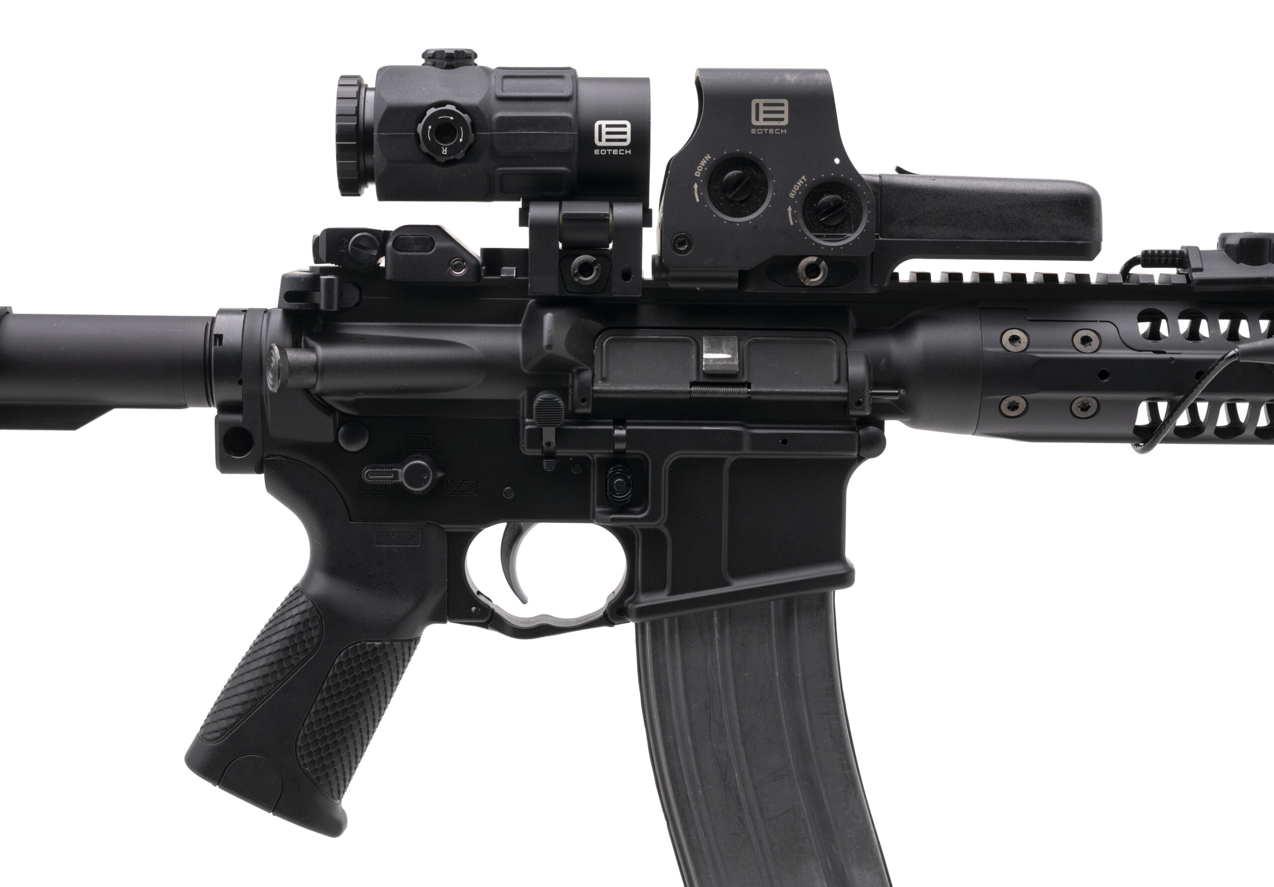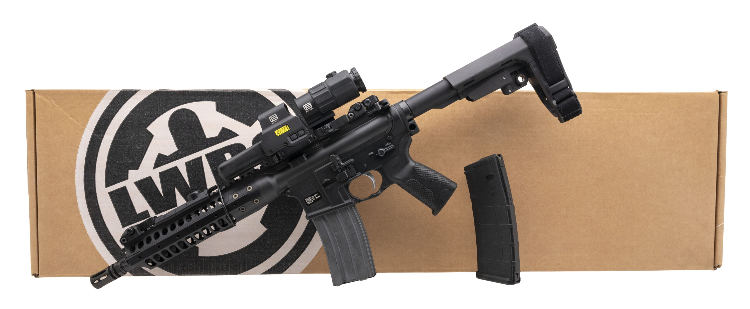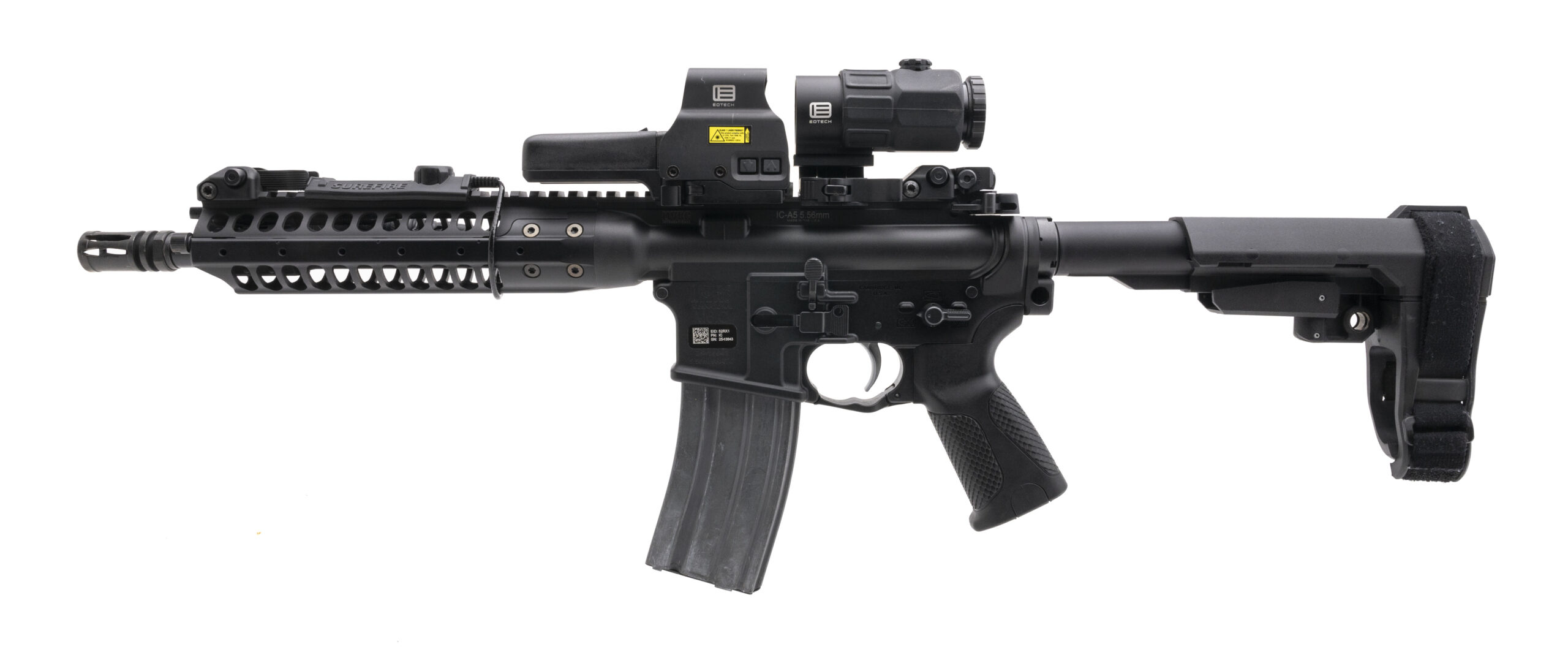 SN: 25-13643. Modern production 5.56 NATO with an 11" barrel with flash hider. Bore is bright with excellent rifling. Semi auto, piston operated tactical pistol with EOTECH G45 & 518 HWS combo and Surefire Turbo V3 light and pressure pad. Finish is in excellent condition. LWRC pistol grip is in excellent condition. Comes with box and extra magazine.