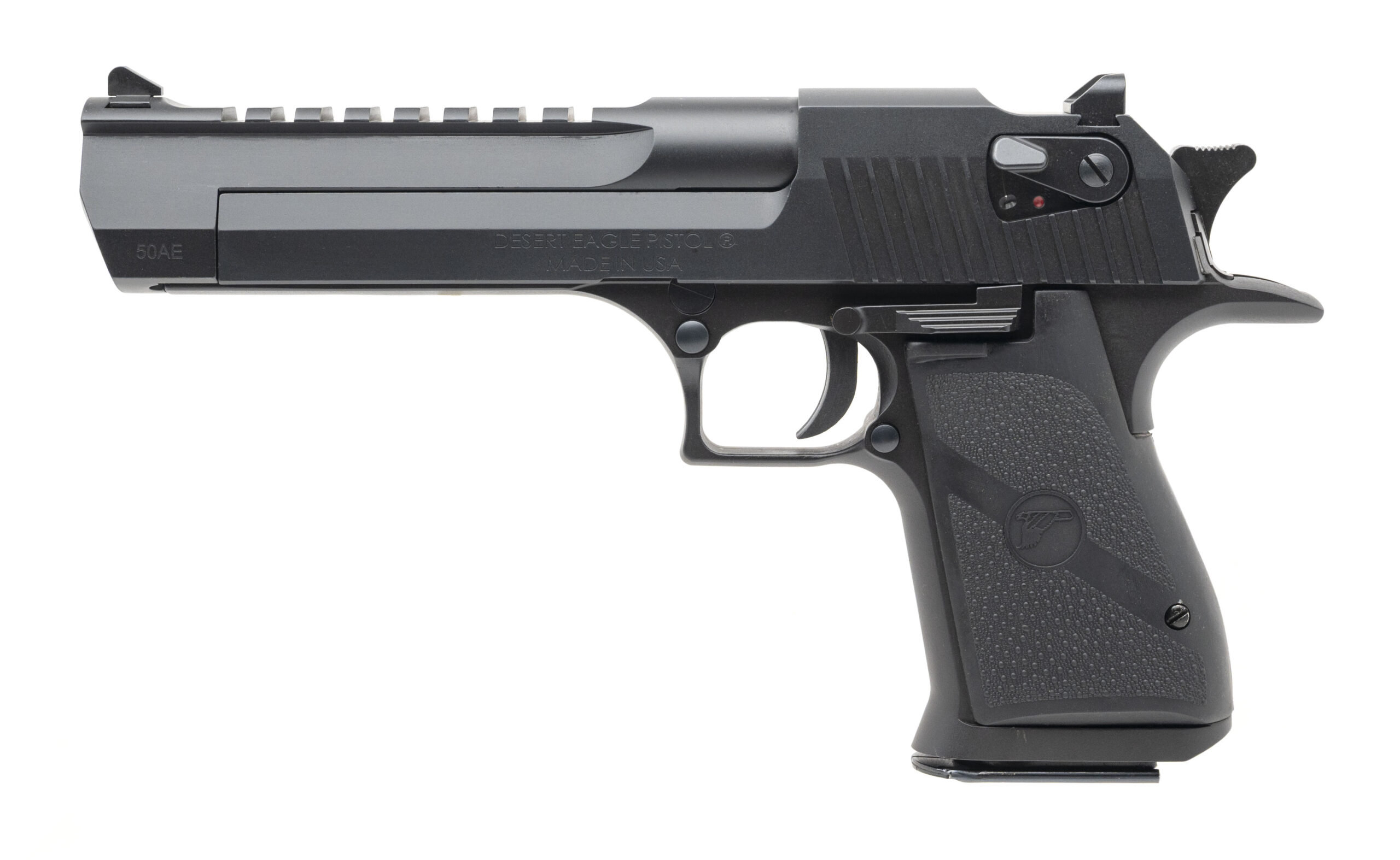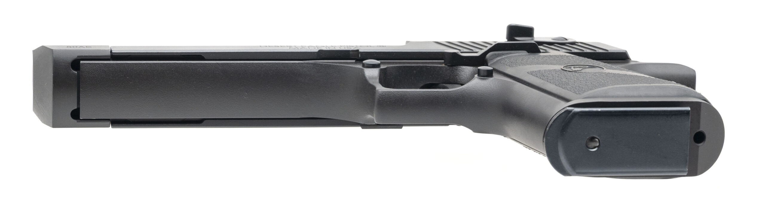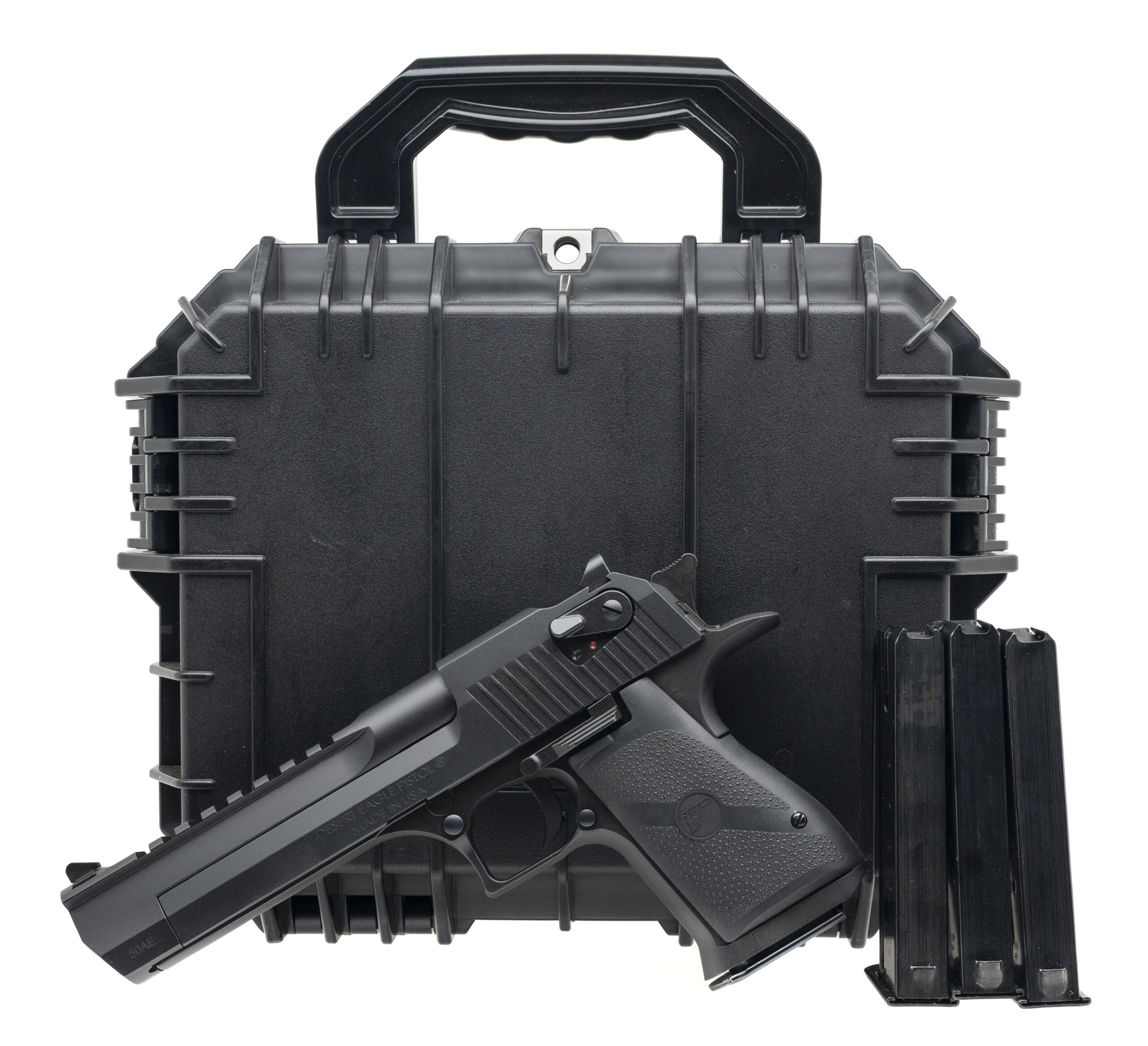 SN: DK0110053. Modern production, 50AE/.44MAG with a 6" barrel. Bore is bright with strong rifling. Full size single action semi-auto pistol with an optic rail. Very good condition overall. Comes with a Case Club custom fit hard case, .44 Mag barrel w/two magazines, and an extra 50AE magazine.
