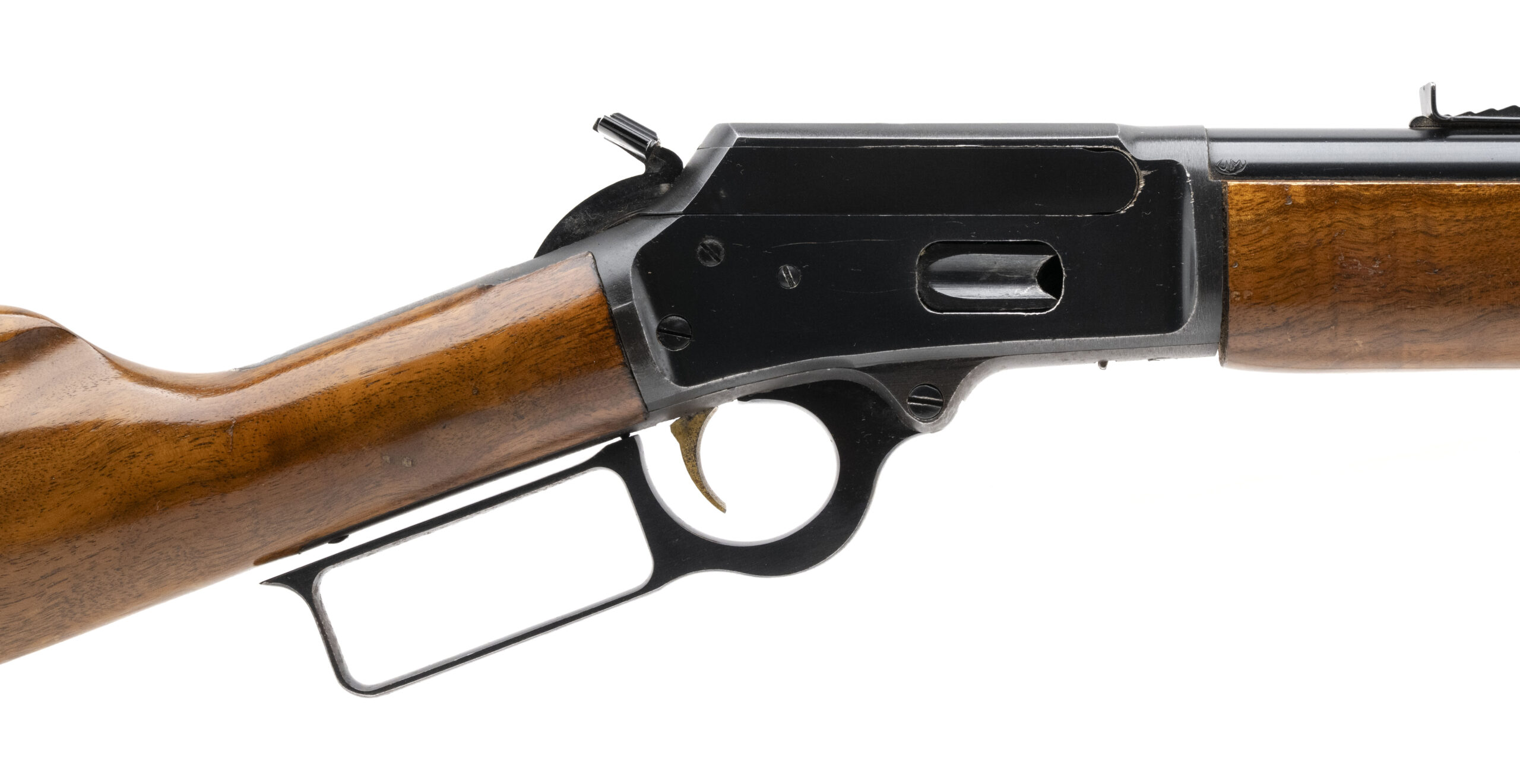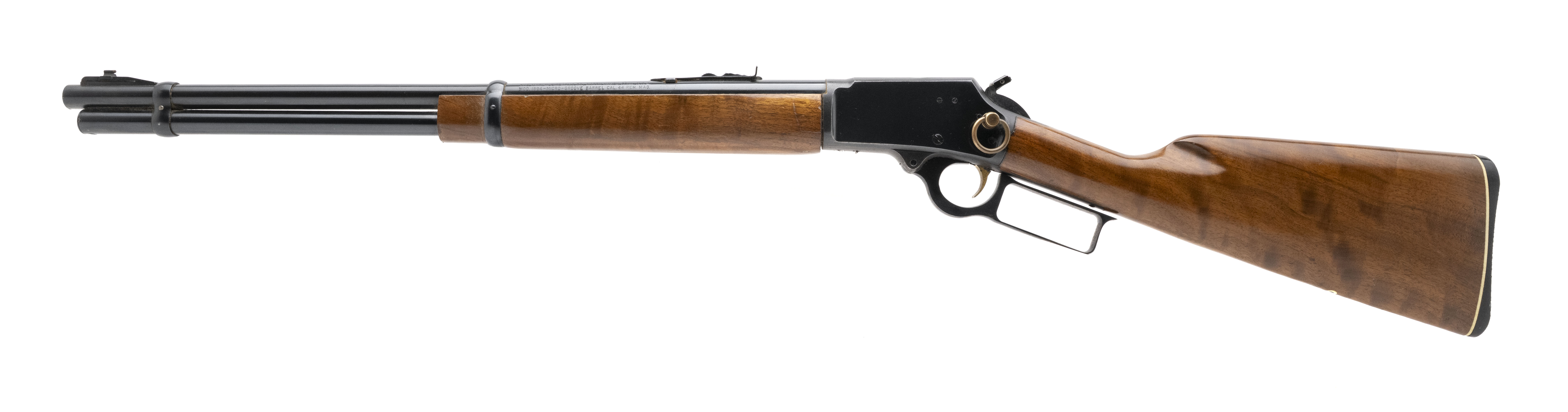 SN: 70352180. Made circa 1970s, .44 Magnum with a 20" barrel. Bore is bright with strong rifling. JM stamped lever action rifle with side gate, saddle ring, and medallion inlay in the buttstock. Very good overall condition.