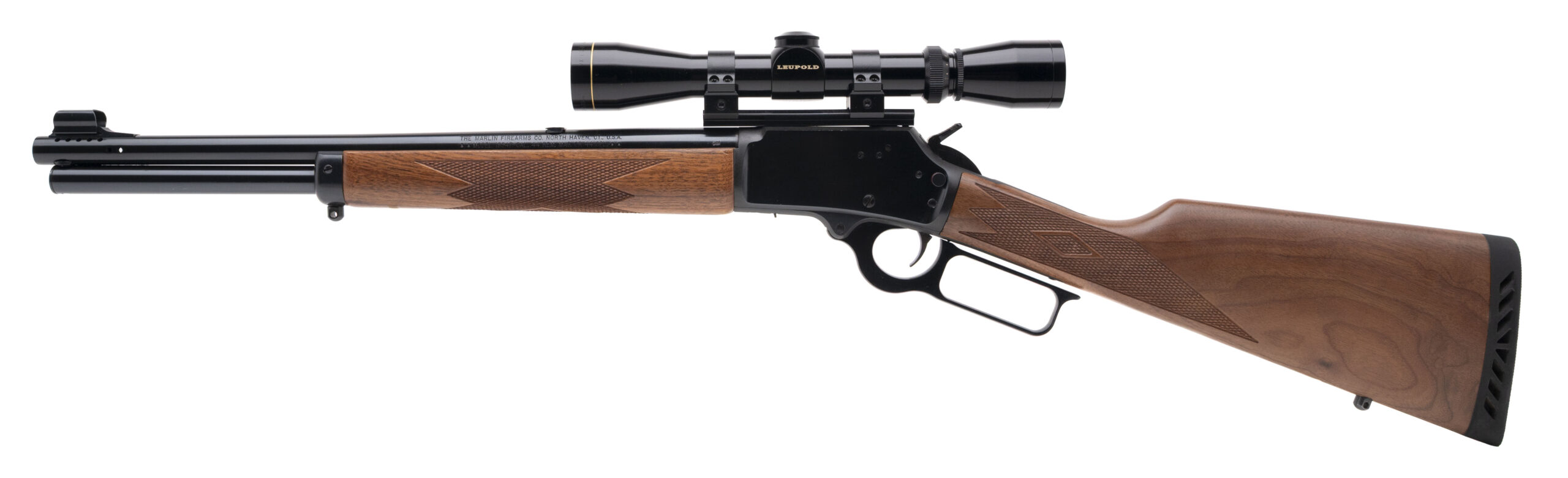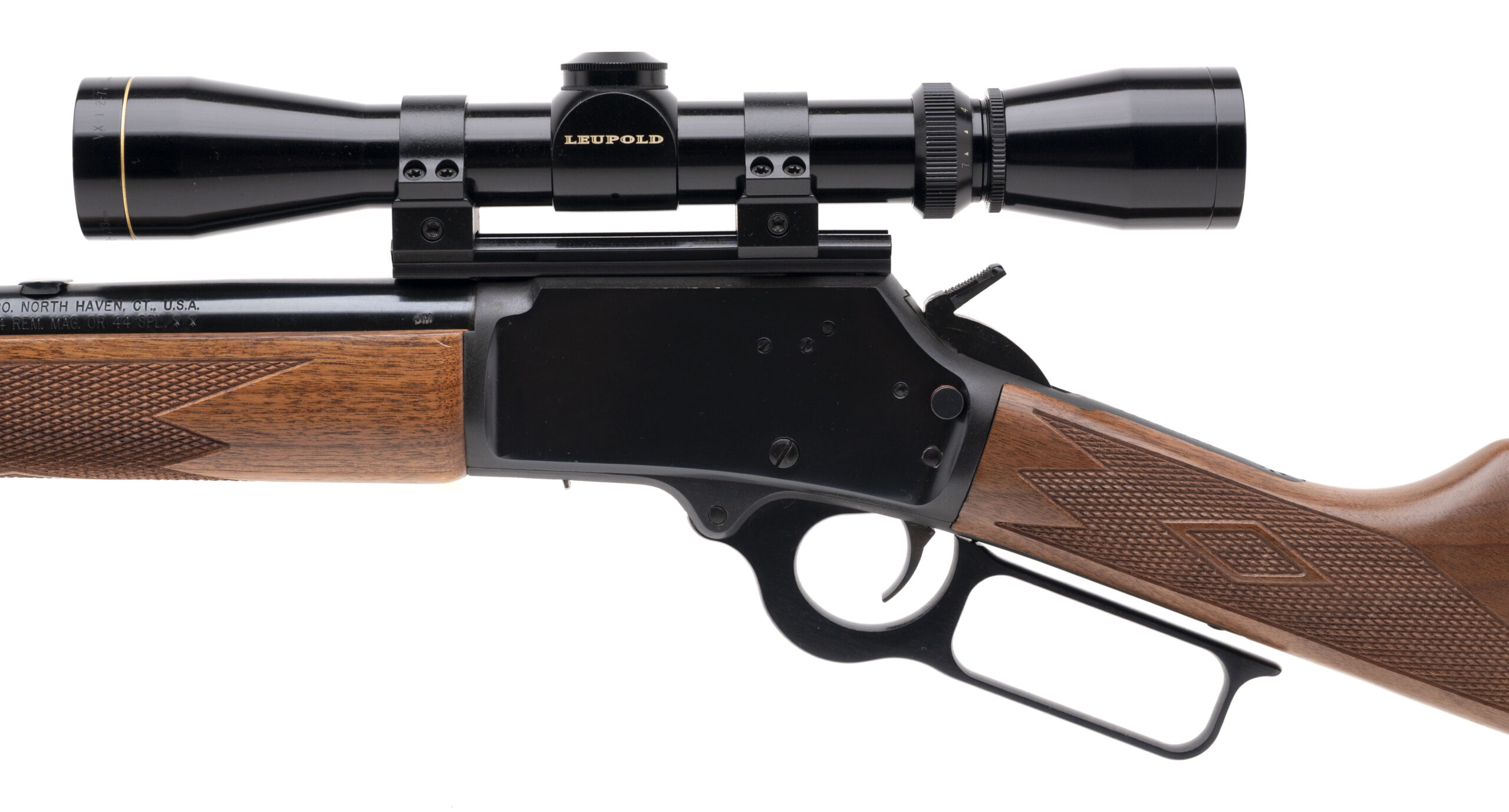 SN: 99050535. Modern production, .44 MAG./.44 SPL. with a 16.25" ported barrel. Bore is very good. JM stamped lever-action rifle with a Leupold VX-I 2-7X33MM scope, blued finish, and checkered wood stock & forend. Finish shows minor handling marks. Overall condition is near excellent.