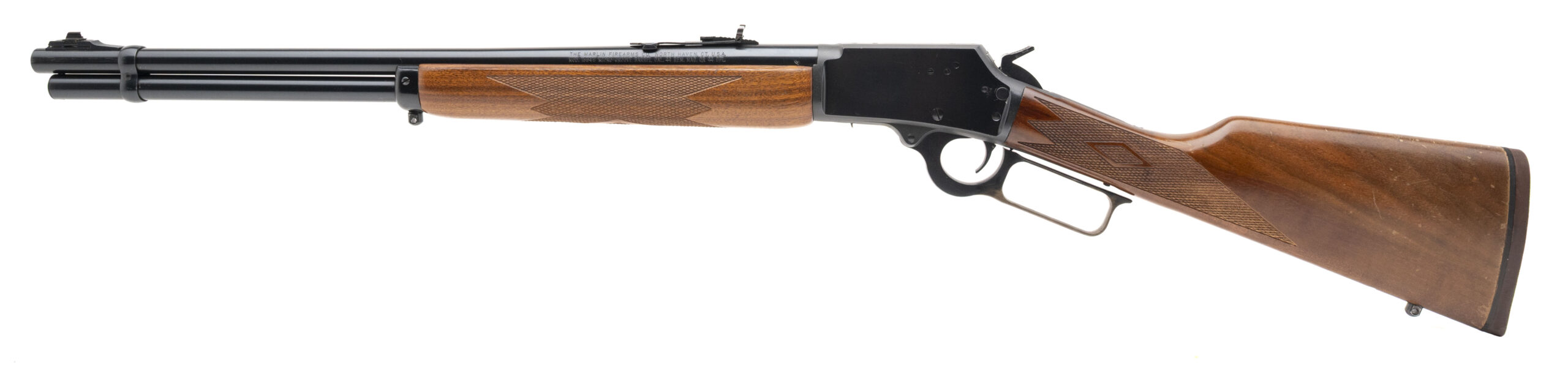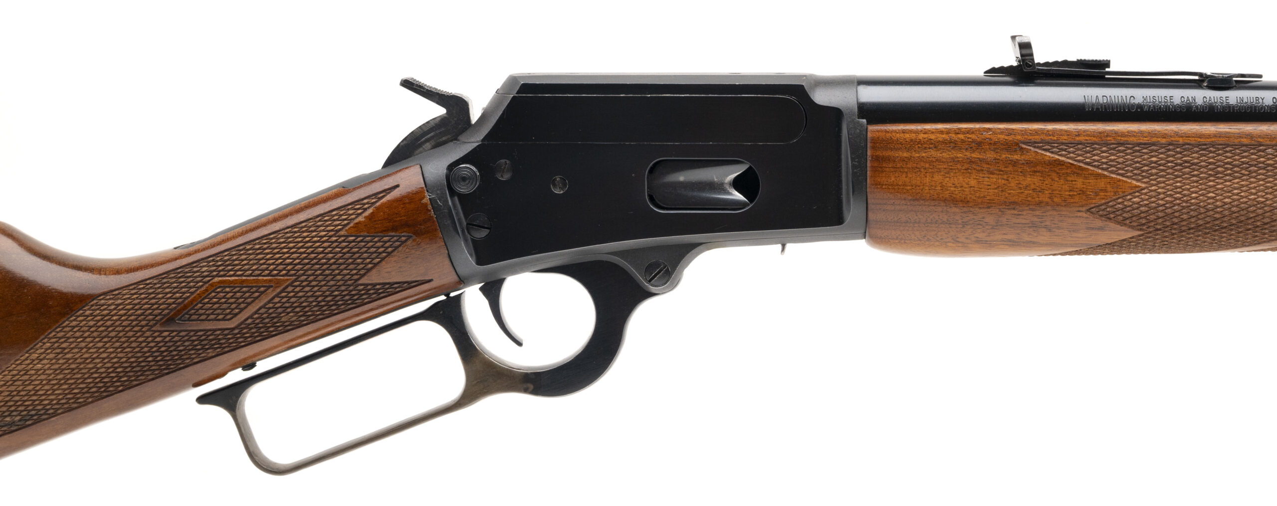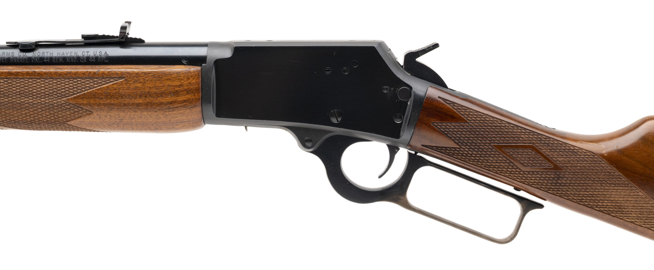 SN: 04090800. Modern production, .44 MAG./.44 SPL. with a 20" micro-groove barrel. Bore is very good. JM stamped lever-action rifle with a beaded front sight, adjustable semi-buckhorn rear sight, blued finish, and checkered wood stock & forend. Finish shows minor handling marks & loss throughout. Stock shows minor marks. Overall condition is very good.