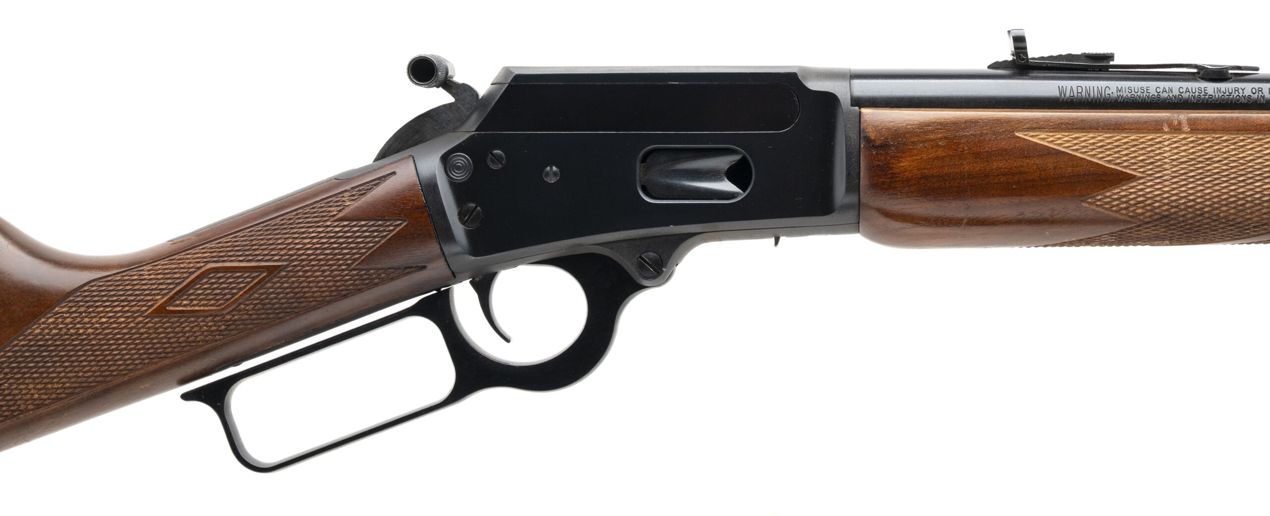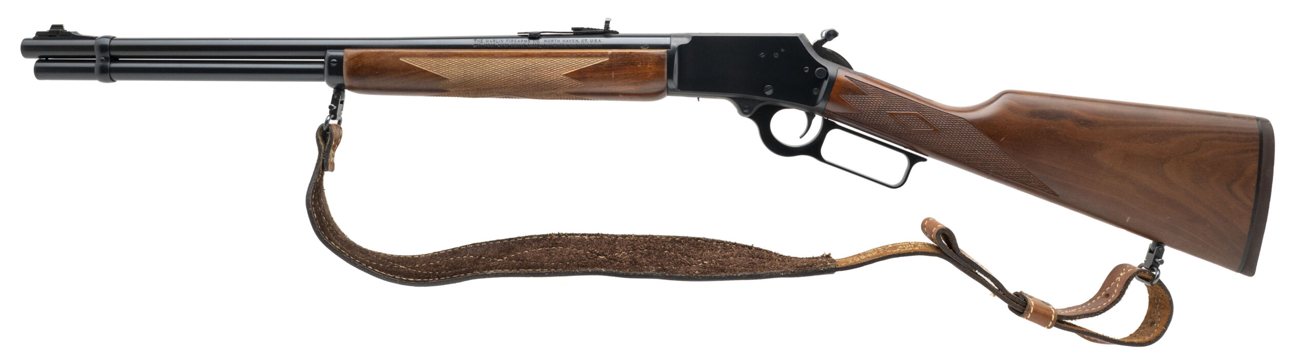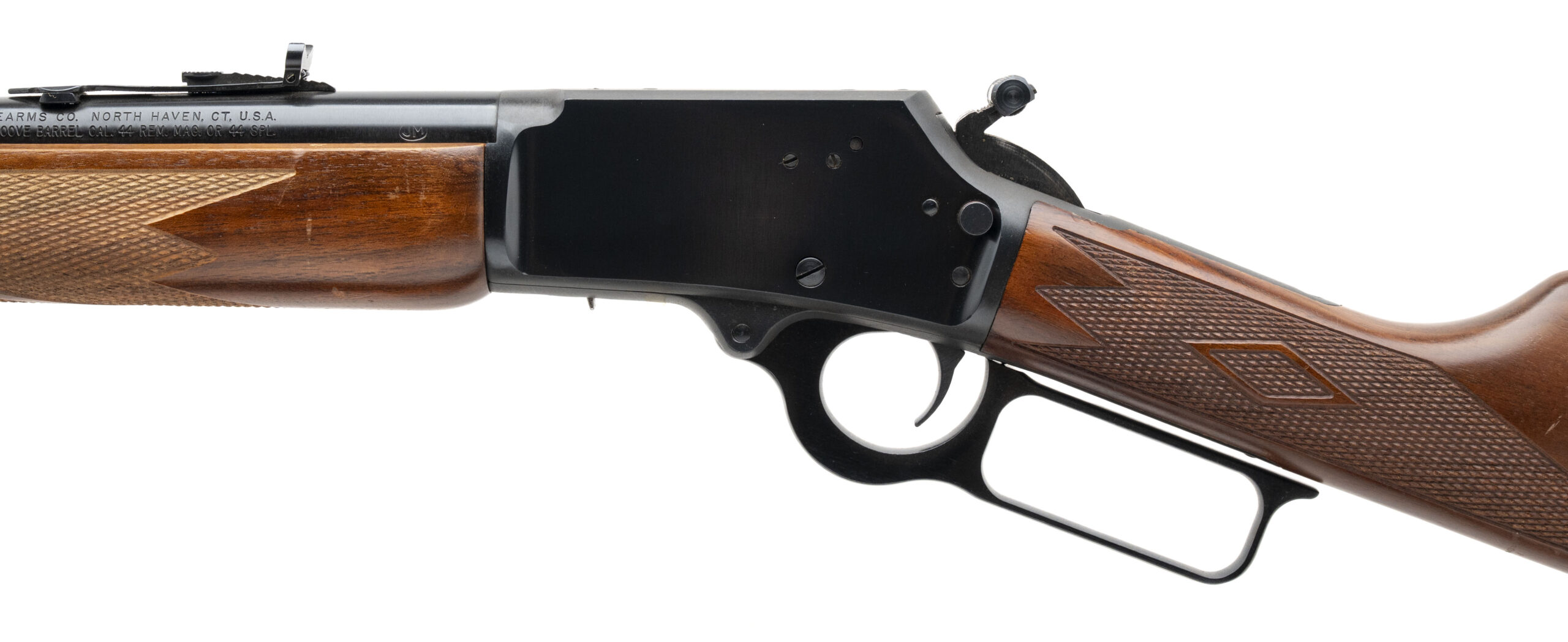 SN: 05049897. Modern production, .44 with a 20" barrel. JM stamped lever action hunting rifle with cross-bar safety, diamond checkered wood furniture, and a sling. Overall condition is very good.