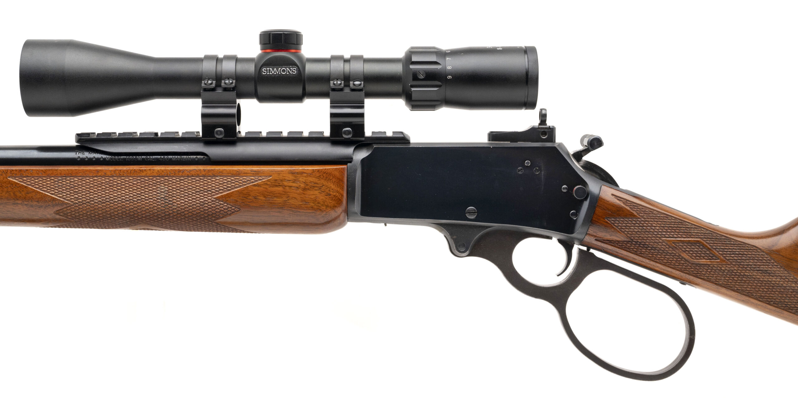 SN: 99009007. Modern production, .450 Marlin with an 18.5" ported barrel. Bore is very good. JM stamped lever-action rifle with a Simmons 8-Point 3-9X40 scope, large loop lever, blued finish, and checkered wood stock & forend. Finish has been professionally re-blued with some minor pitting visible underneath with minor marks, and stock shows minor marks, too. Includes sling. Overall condition is very good.