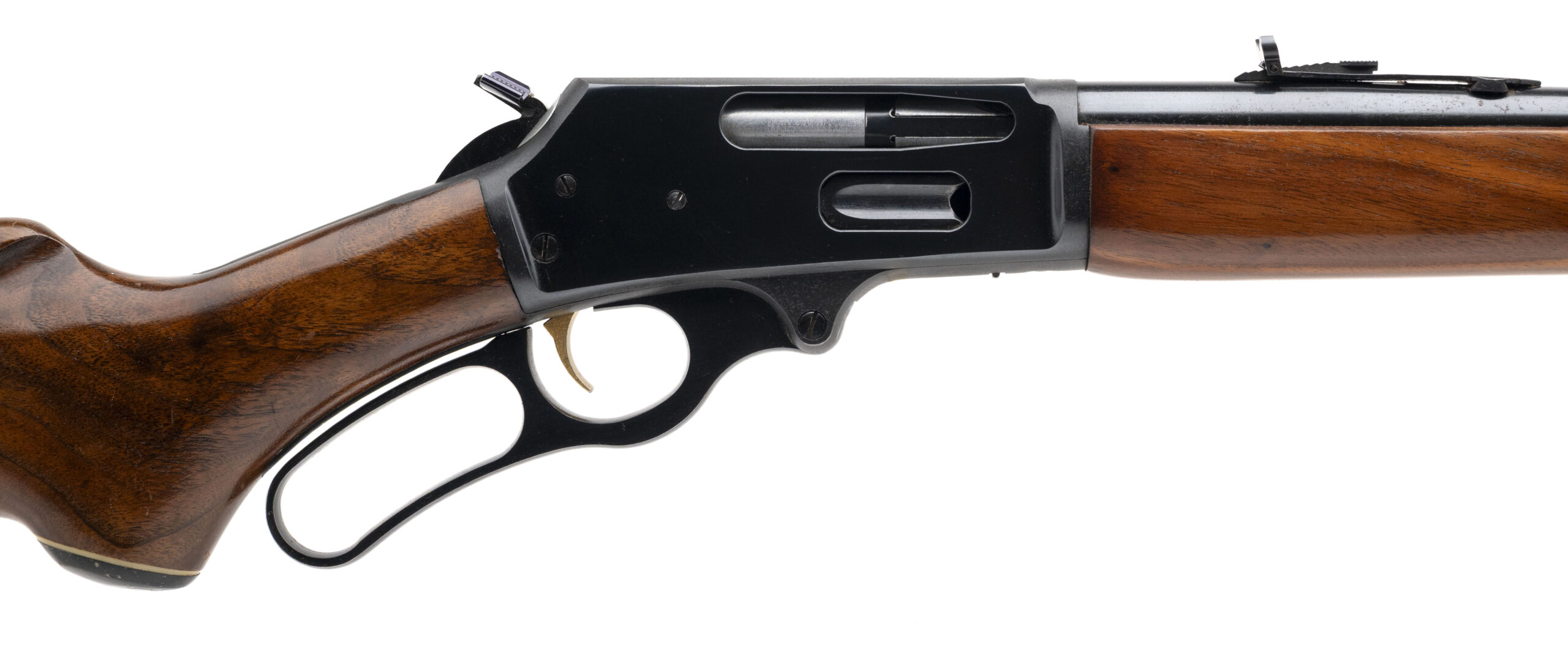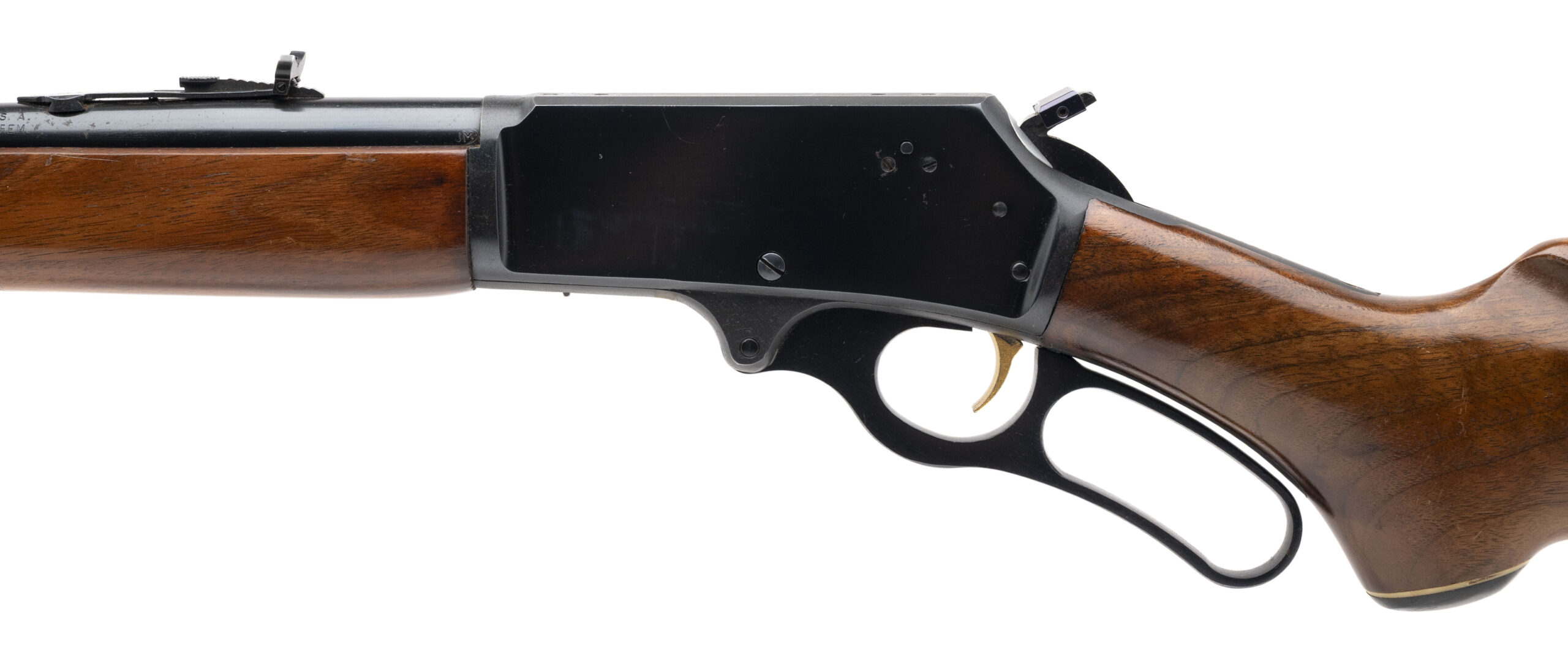 SN: 25141819 made circa 1975. Lever action rifle in 35 Rem. with a 20" JM stamped micro-groove round barrel with ramped front sight, semi-buckhorn rear sight, hammer spur extension with walnut furniture, capped pistol grip and original butt plate. Some light handling marks and 2 empty holes for rear sling swivel but overall in very good condition with an excellent bore.