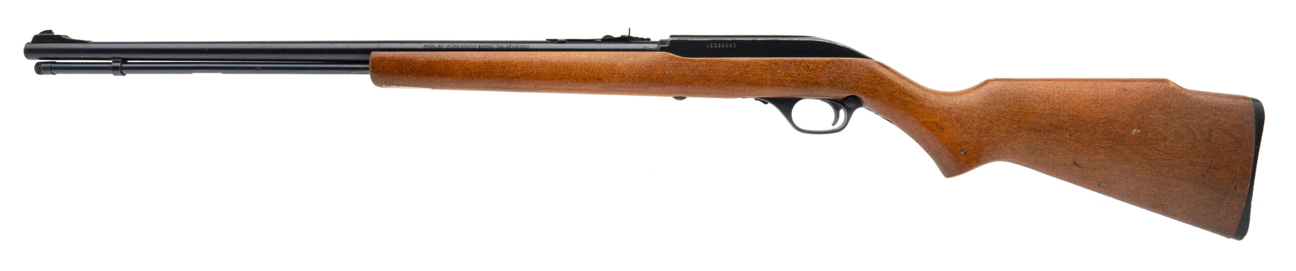 SN: 15338093 made circa 1970's. Tube fed semi-auto 22lr rifle with a 22" round JM stamped micro-groove barrel with banded front ramp sight, dovetailed rear sight, aluminum receiver and wood stock with original butt plate. Some light wear on the stock and speckling throughout the bluing and a good bore with strong rifling, overall in good condition for the age.