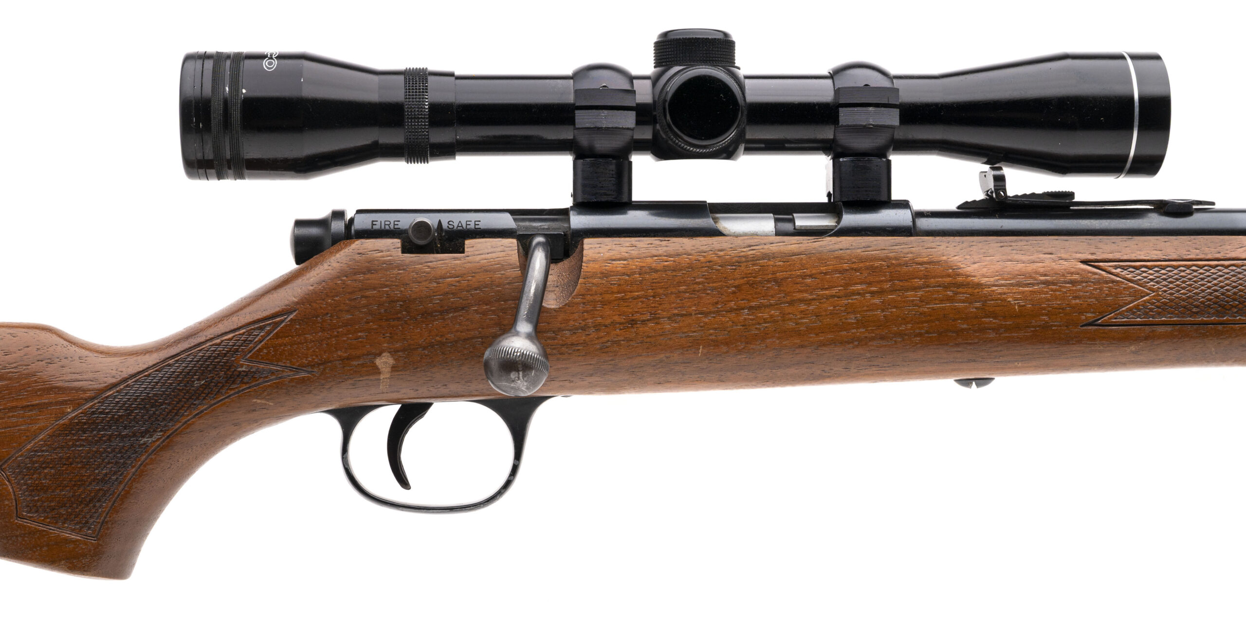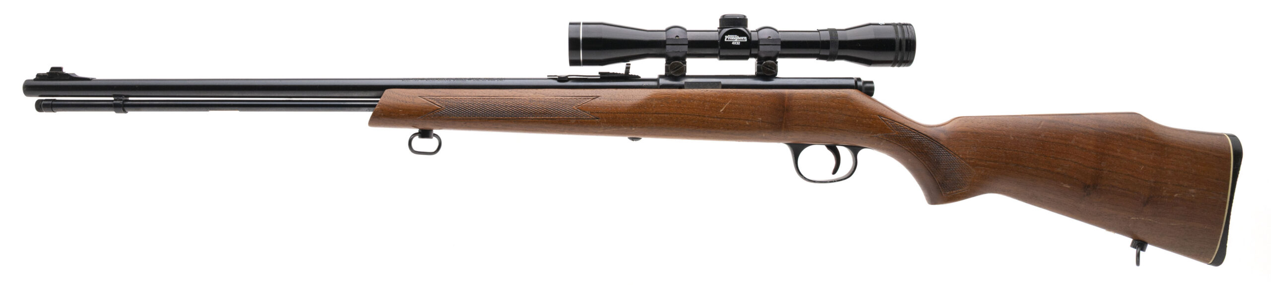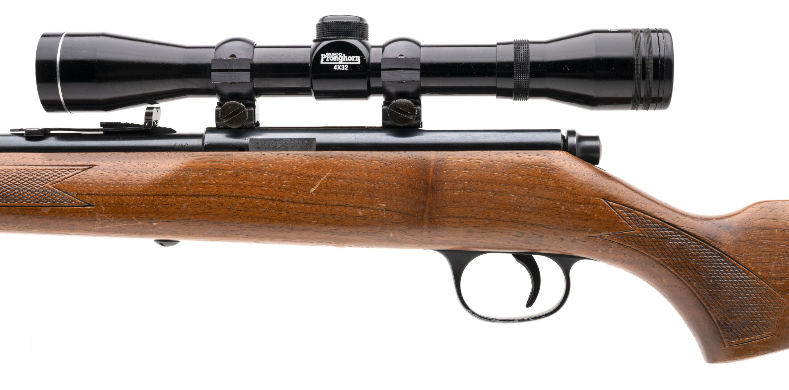 SN: 18658407. Made circa 1970's. Tube fed bolt action rifle chambered in 22 magnum with a 22" JM stamped Micro-Groove round barrel with iron sights and a Tasco Pronghorn 4x39 scope in a checkered wood stock with the original butt plate and sling swivels. Some handling marks on the stock, bluing is very good with some small areas of light speckling and bore is good with strong rifling.