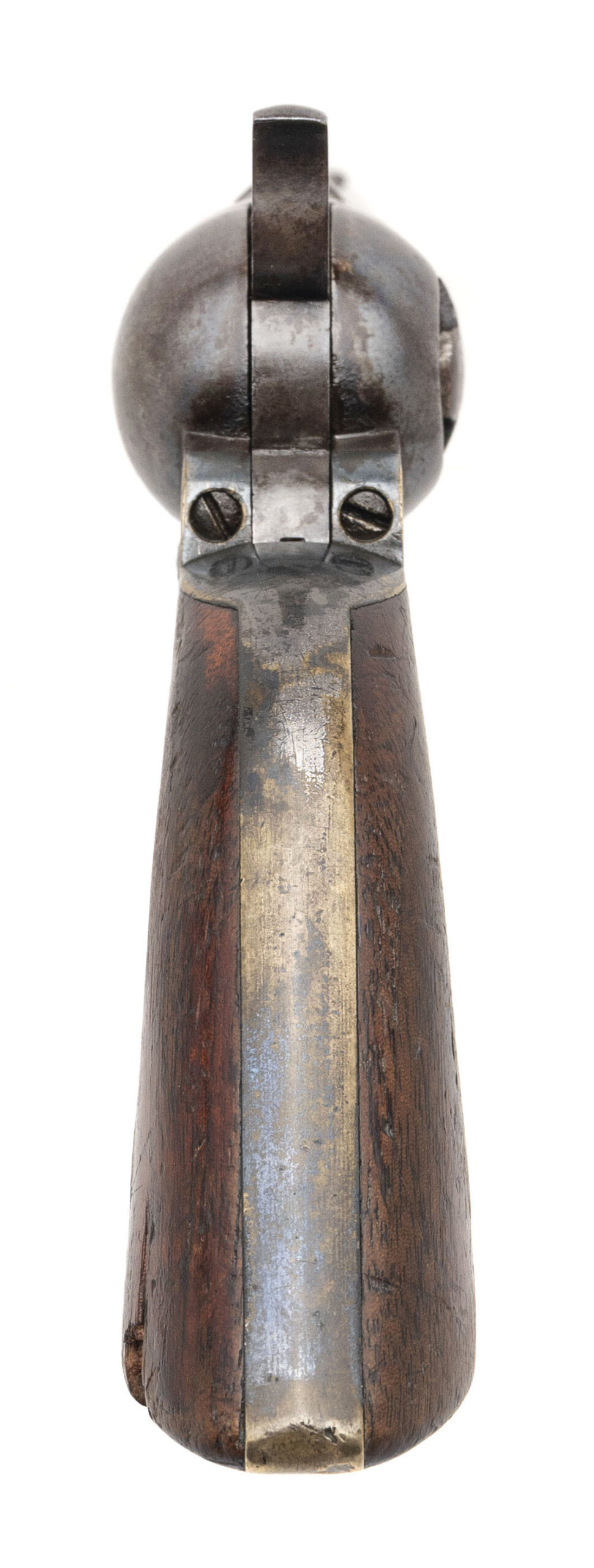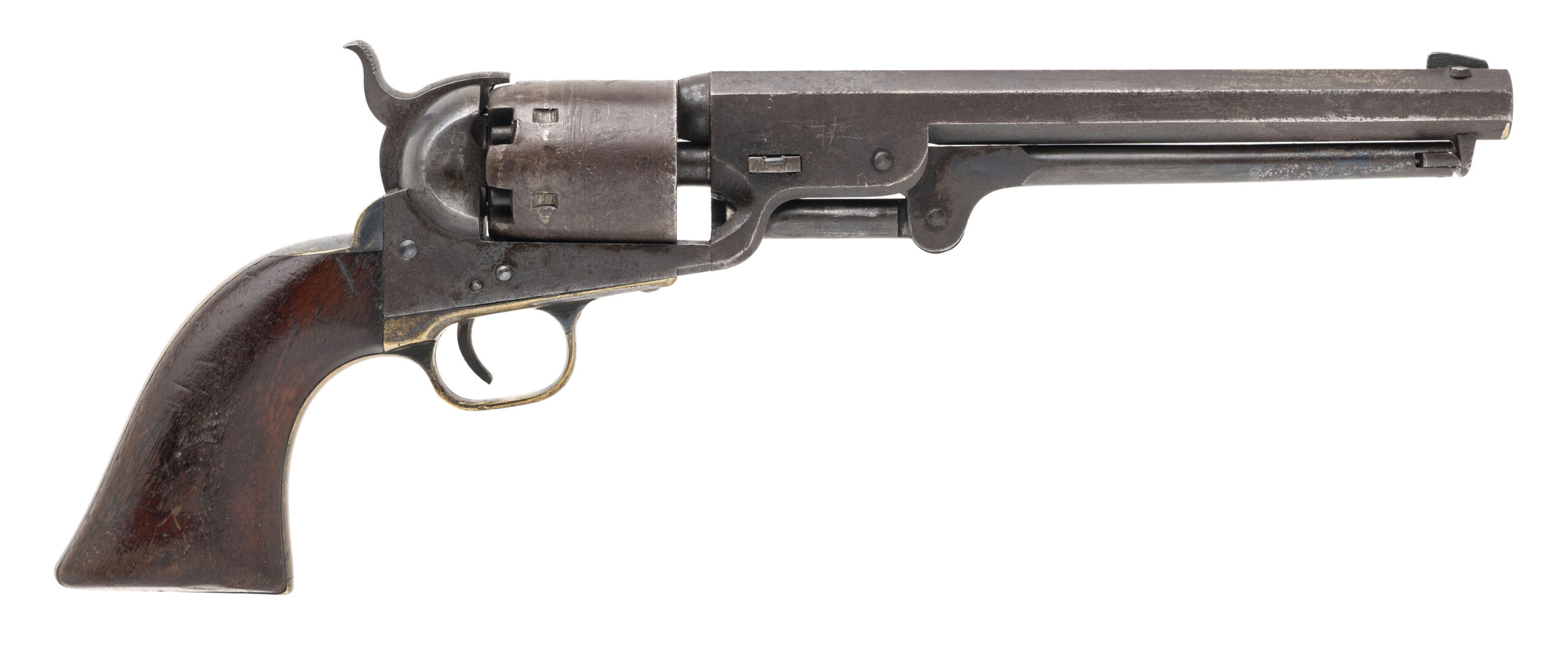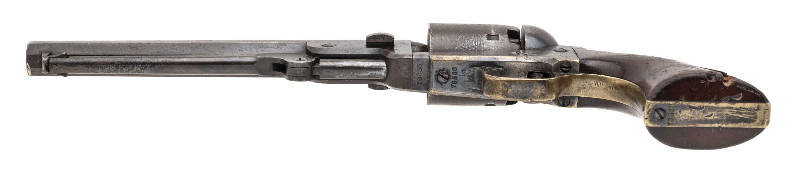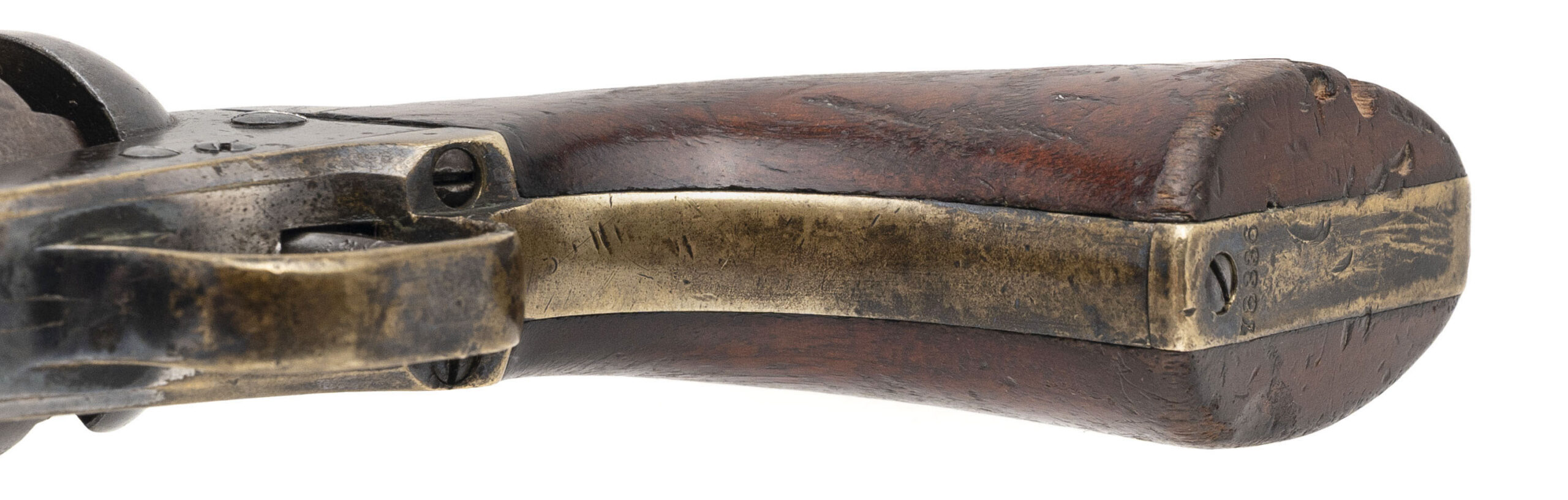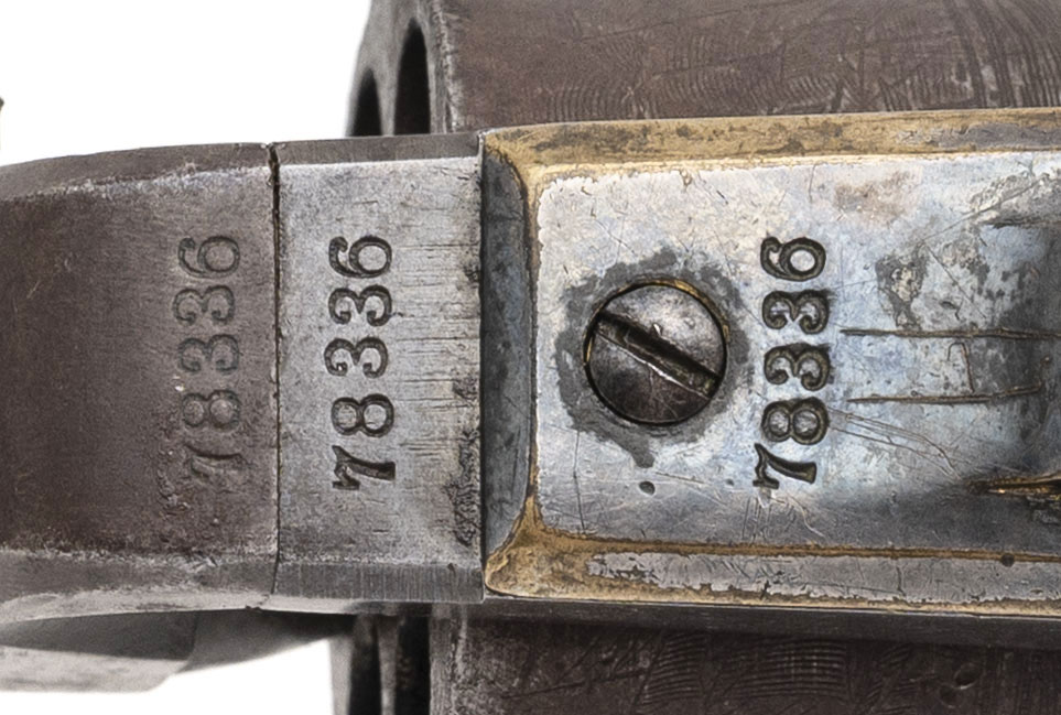 Serial number 78336. Made in 1857. 36 caliber with a 7.5” barrel. This is a very fine small trigger guard Colt 1851 Navy. This gun has approximately 15% of the original blue. The barrel has a mostly plumb patinas. The grips are very good with about half of the original varnish. There is some damage to the left hand side of the grips along the bottom edge. This gun is US marked. The cylinder is non matching, but is in a Martial range. The grips are also non matching and should be oil stained instead of varnished.