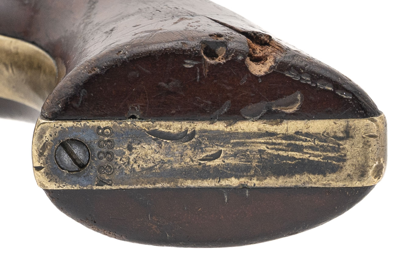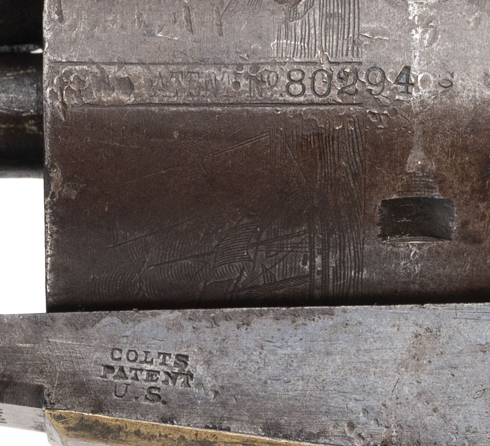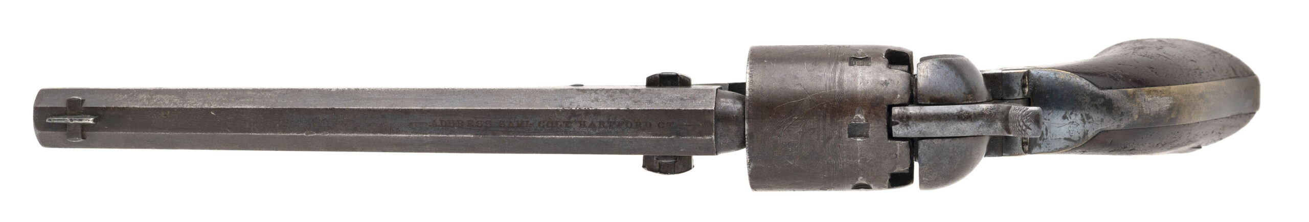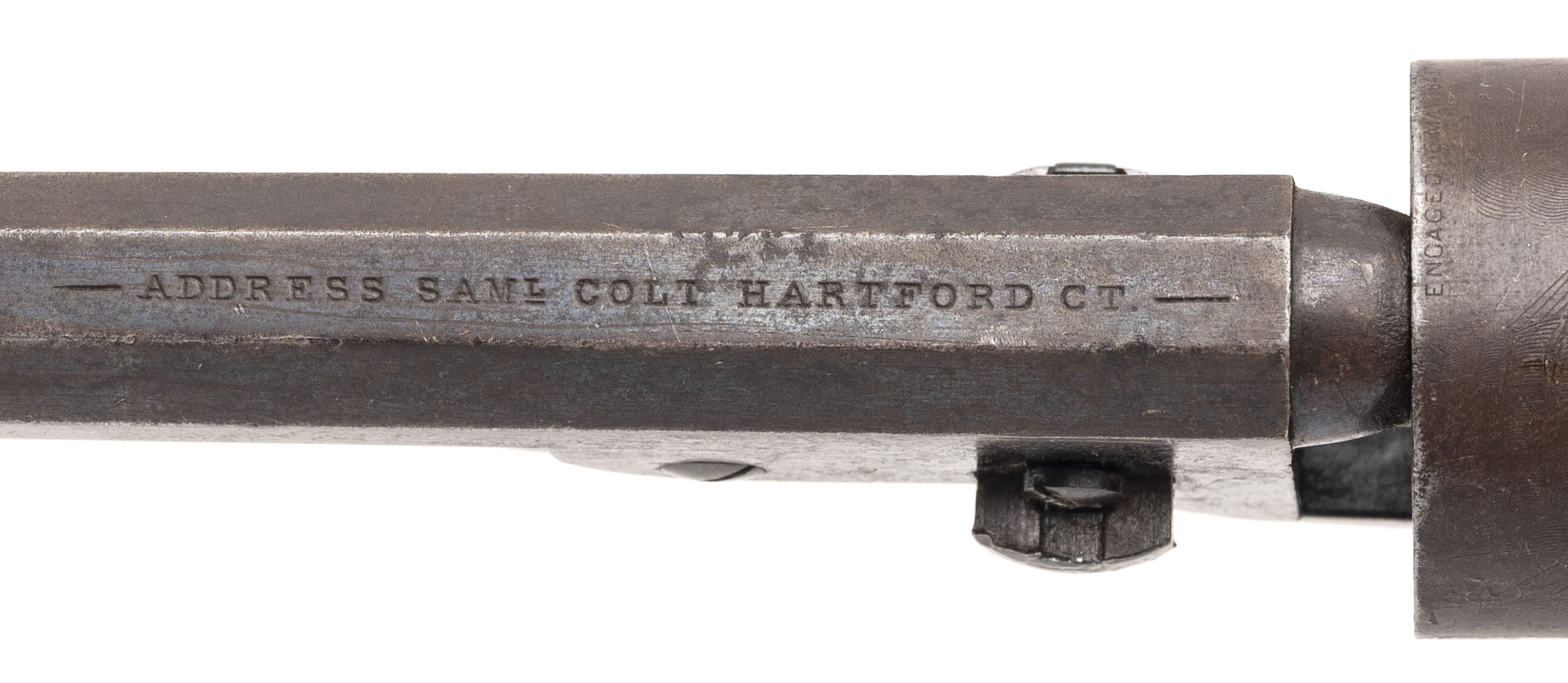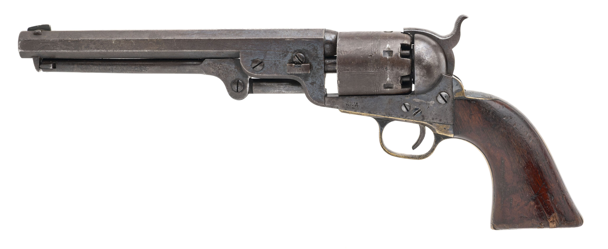 Serial number 78336. Made in 1857. 36 caliber with a 7.5” barrel. This is a very fine small trigger guard Colt 1851 Navy. This gun has approximately 15% of the original blue. The barrel has a mostly plumb patinas. The grips are very good with about half of the original varnish. There is some damage to the left hand side of the grips along the bottom edge. This gun is US marked. The cylinder is non matching, but is in a Martial range. The grips are also non matching and should be oil stained instead of varnished.