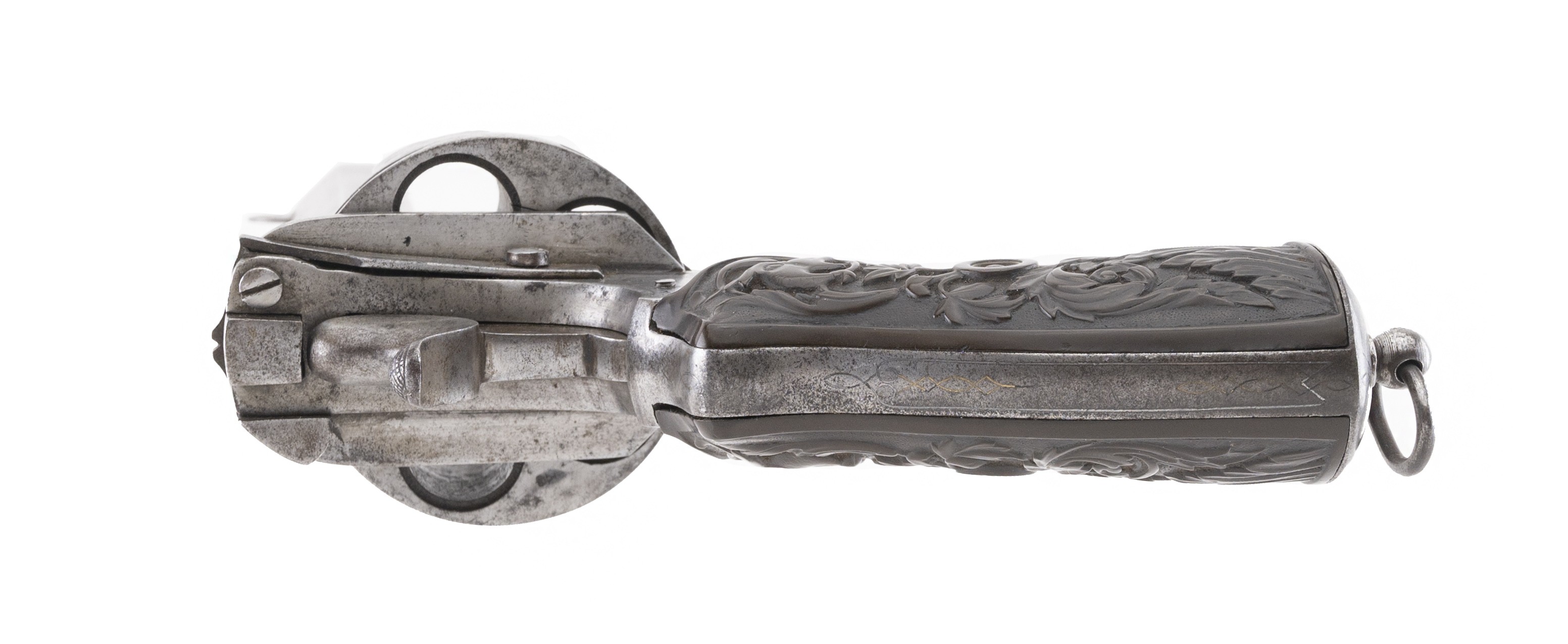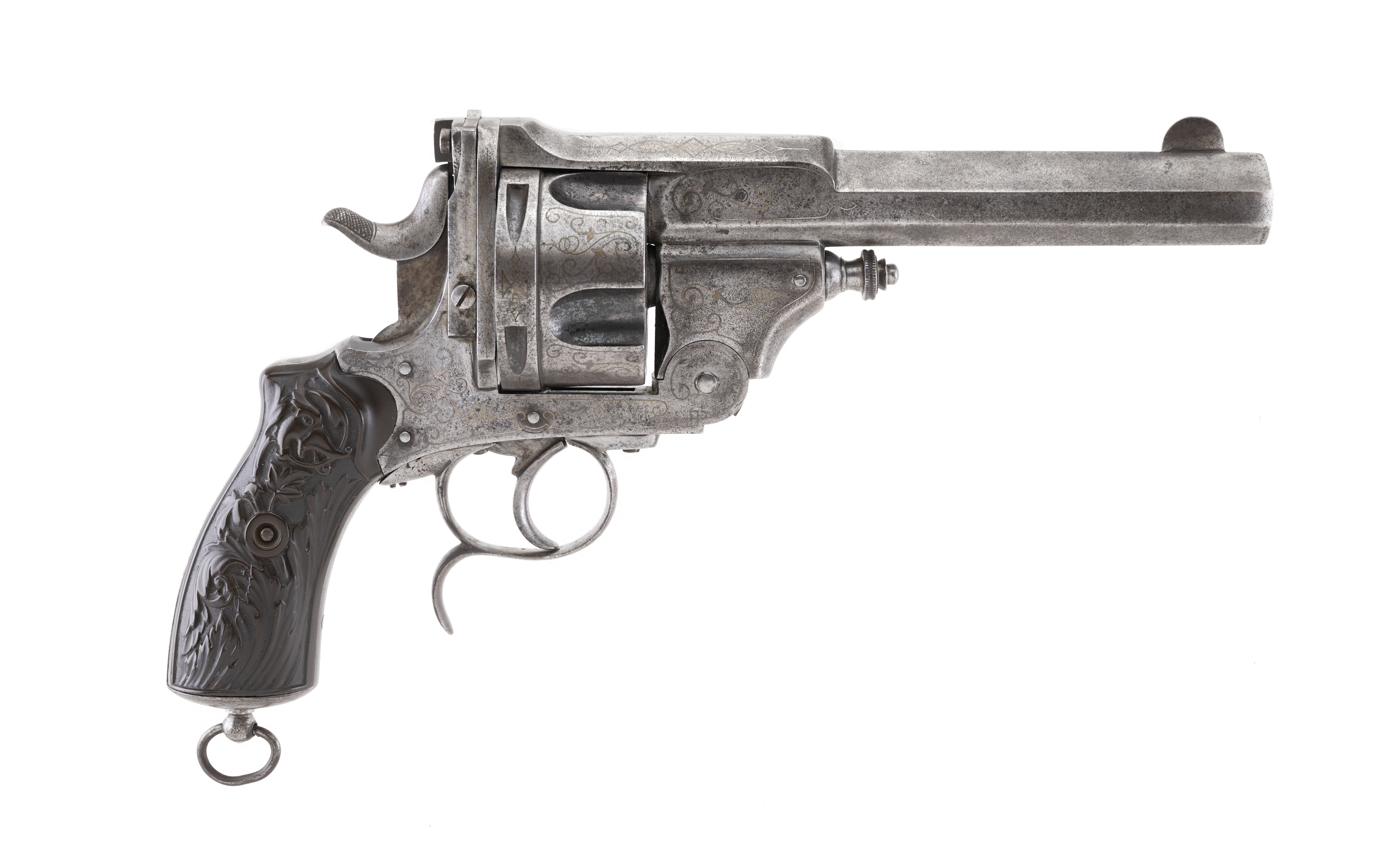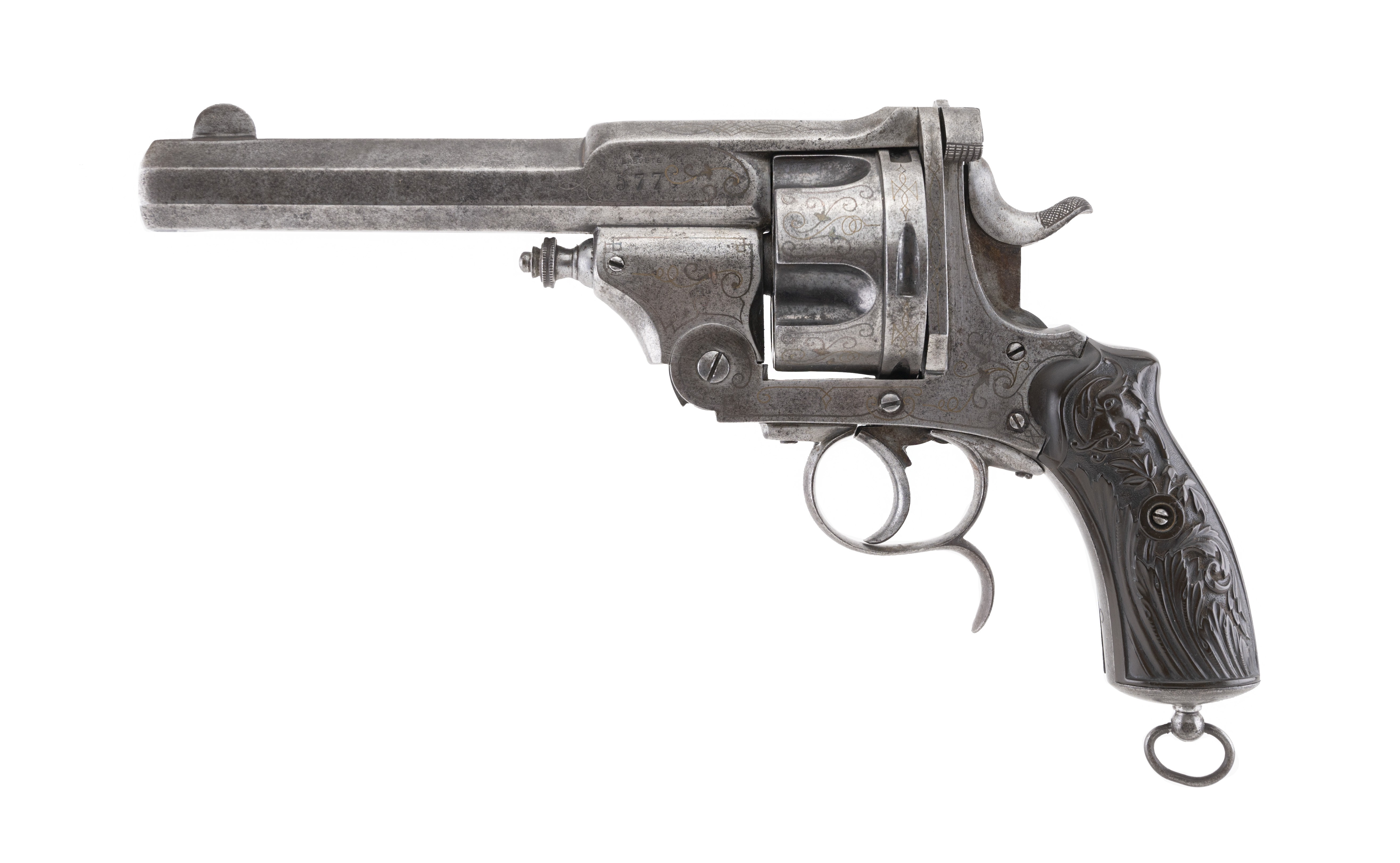 This unusual 5-shot 577 centerfire caliber "manstopper" Belgian revolver puts the S&W 500 to shame! The overall length from muzzle to grip is approx. 12.25". The 6" octagon with top solid "rib" barrel has a very good bore with strong rifling and some erosion toward the chamber. The revolver is a pleasing mix of gray an brown patina. The barrel is marked in an arc on the left side "WAR... CREON" (the in between letters are unreadable) over "BREVETE" over a large 577. The rear face of the cylinder is marked with the oval Belgian ELG proof mark. The revolver features brass wire inlay scroll work on the action and cylinder. The double action mechanism works perfectly. The action swings open when the latch at the top rear is swung to the right. There is a central extractor for the five 577 cartridges. The grip features a lanyard ring. The highly figured gutta percha grips are excellent. This great revolver would be the centerpiece of any early revolver collection.