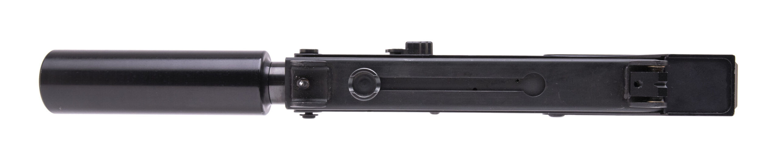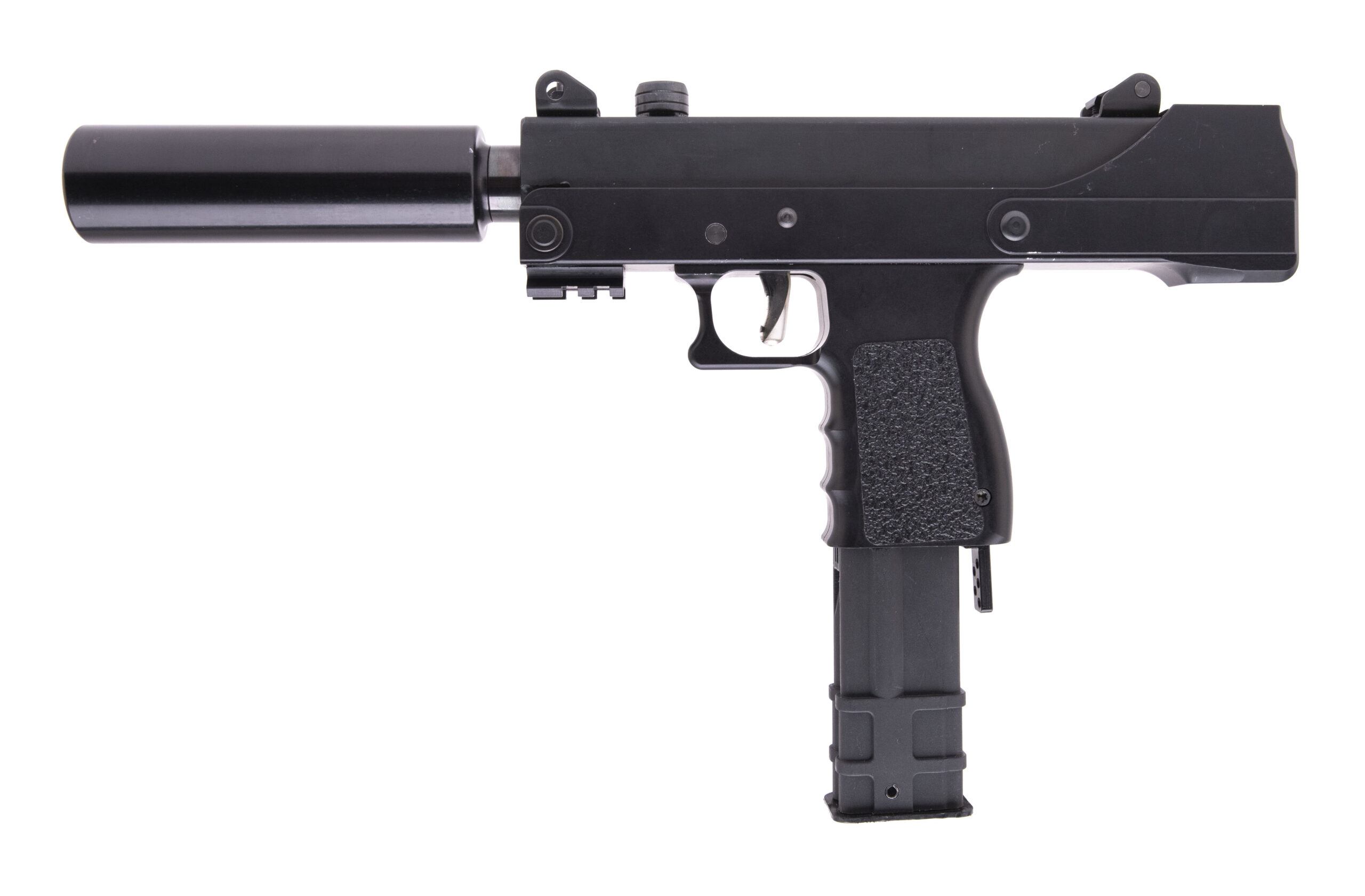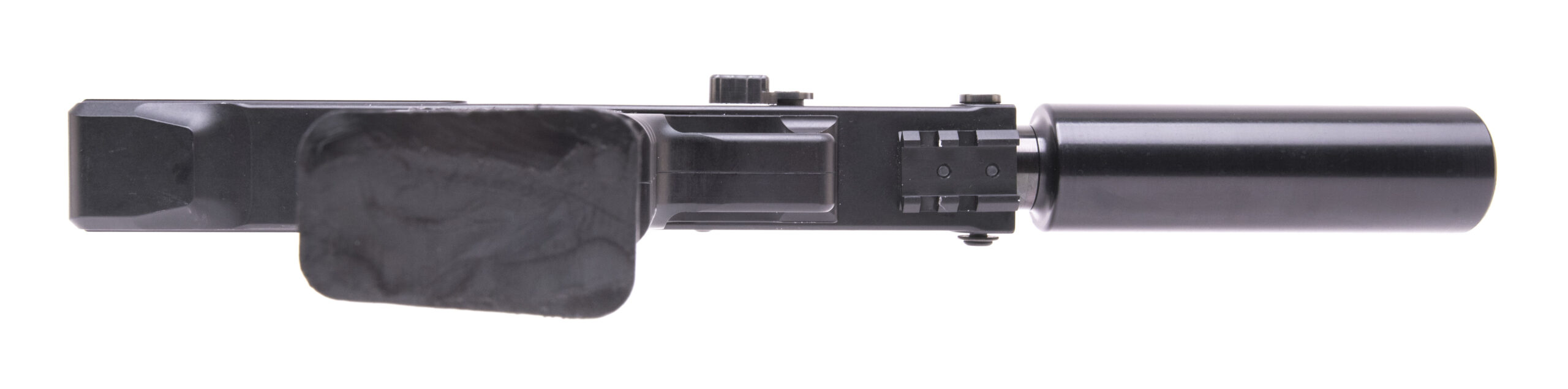 SN: FX47355. Modern production. Large-format pistol made by Masterpiece Arms. 4.5" threaded barrel chambered for 9x19mm. Great condition with light handling marks in the black finish. Features underbarrel accessory rail, rear taps in the receiver for a rail mount, and 5" faux suppressor counterweight. Comes with original box and spare magazine.