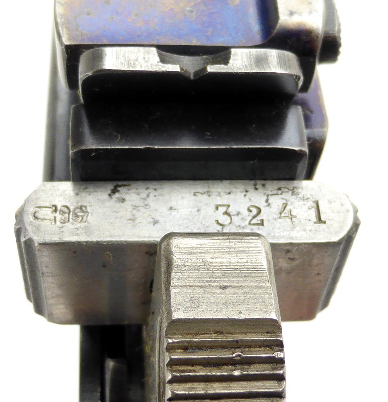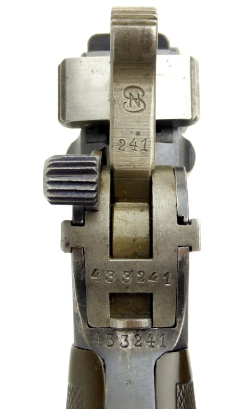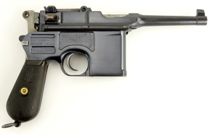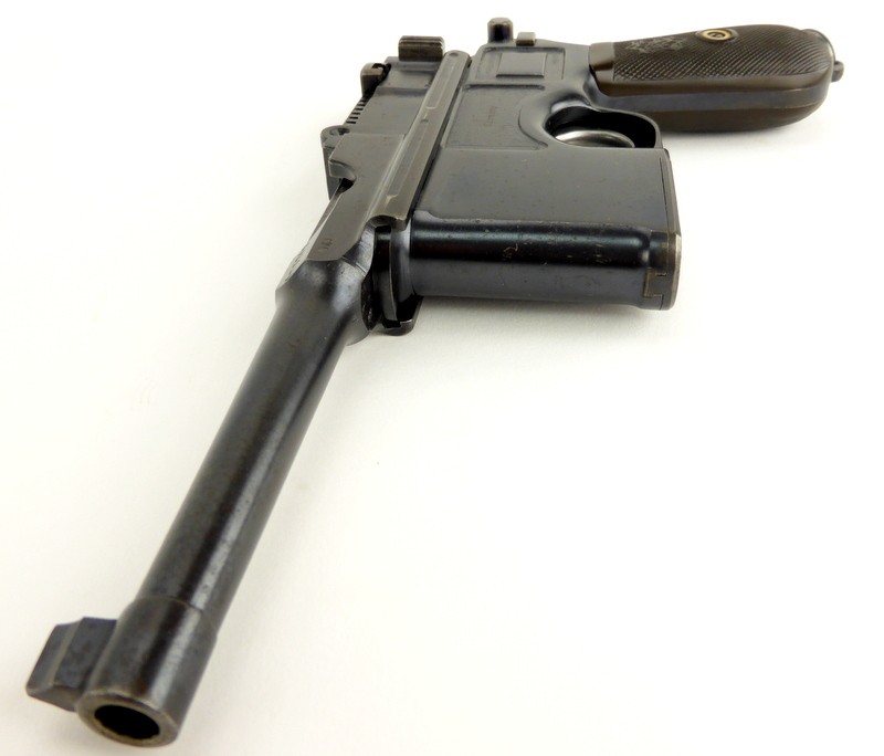 Mauser 1896 .30 Mauser caliber pistol. Rare Gendarme model. Has 3.9" barrel, and 50-500 sight. All matching including the stock, Germany stamped on the side of the receiver. Gun has 97% blue. Bore shows strong rifling. Stock has no damage. This is a high condition gun. Used in the 1920's in France.