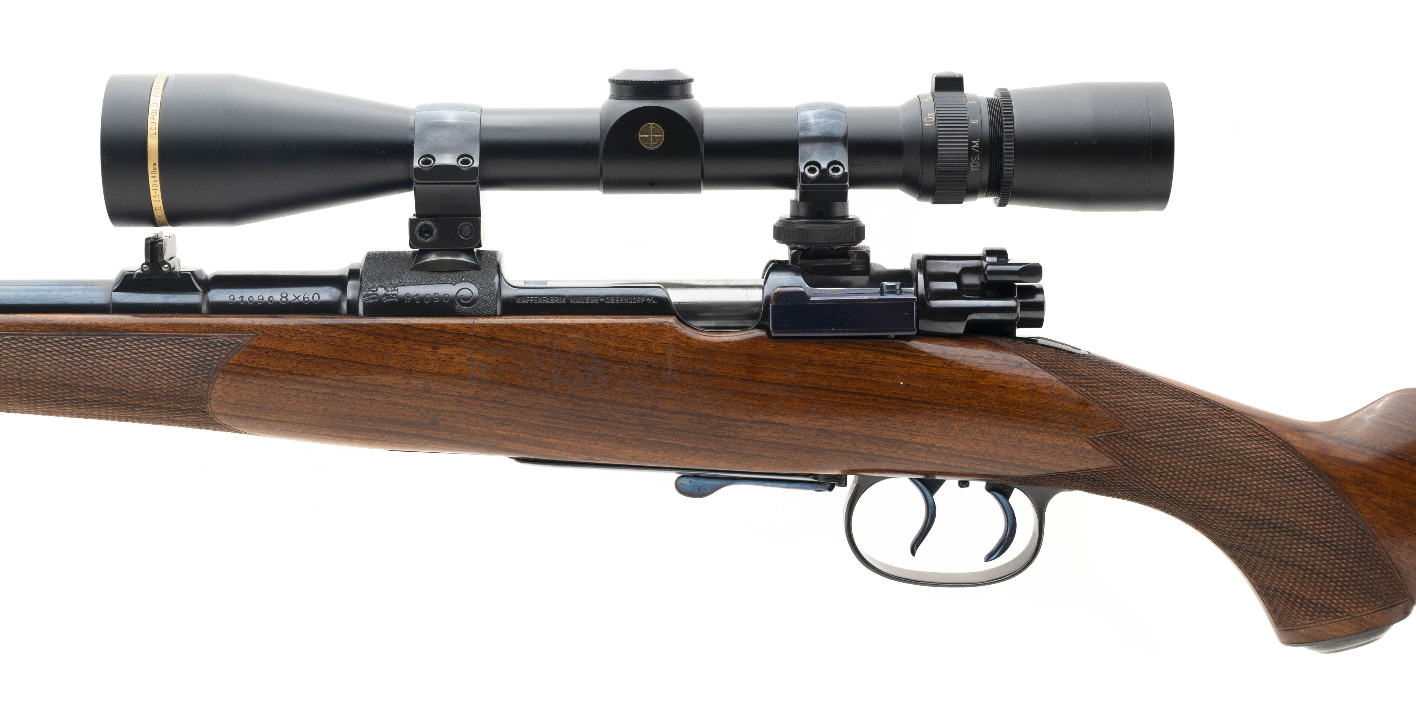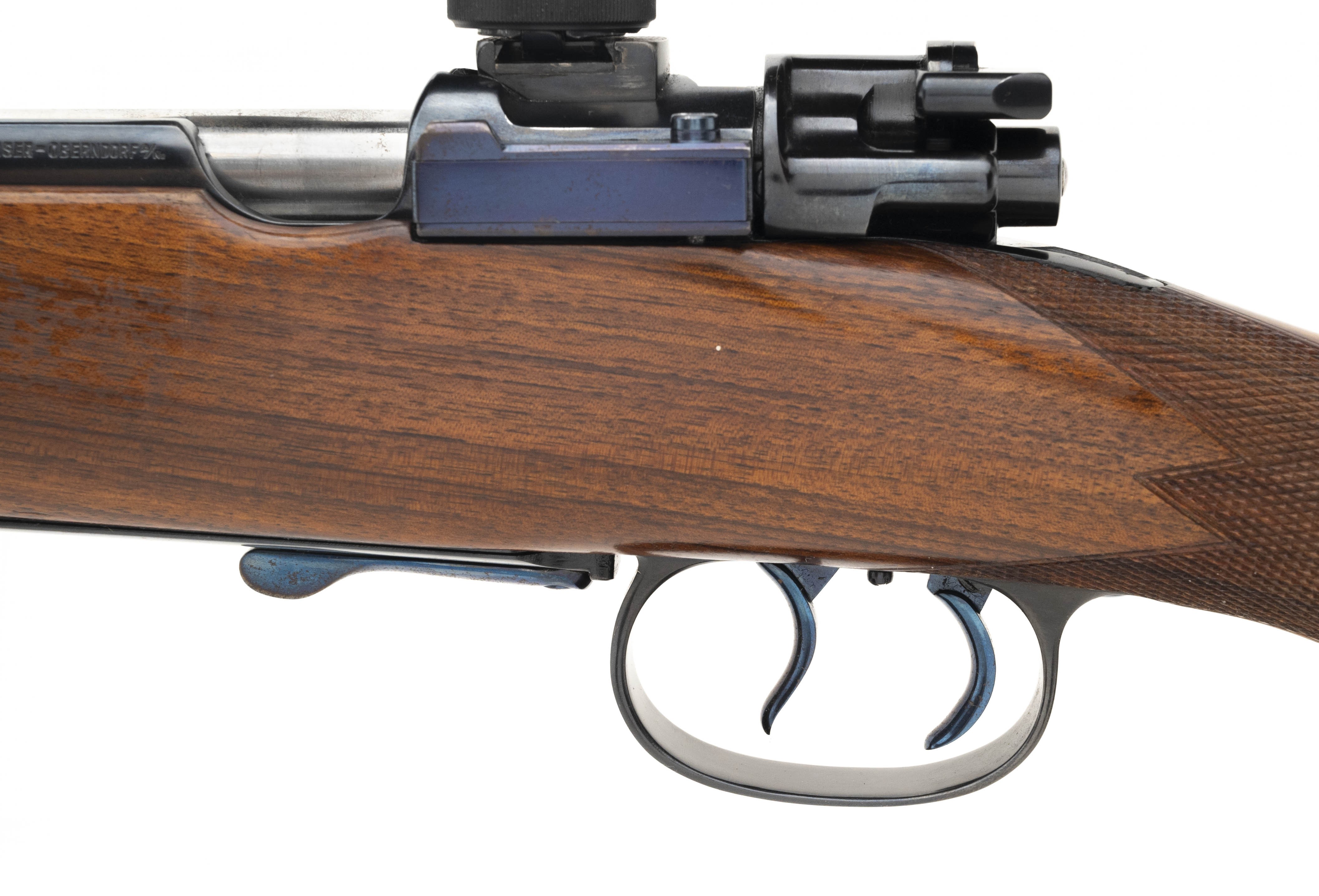 Mauser Custom Sporter 8x60 caliber rifle. Beautiful full length stock Mauser carbine. Made during the 1930’s. Carbine has double set adjustable trigger, detachable floor plate and Leupold 3.5-10x scope. Excellent condition. A fantastic set up!