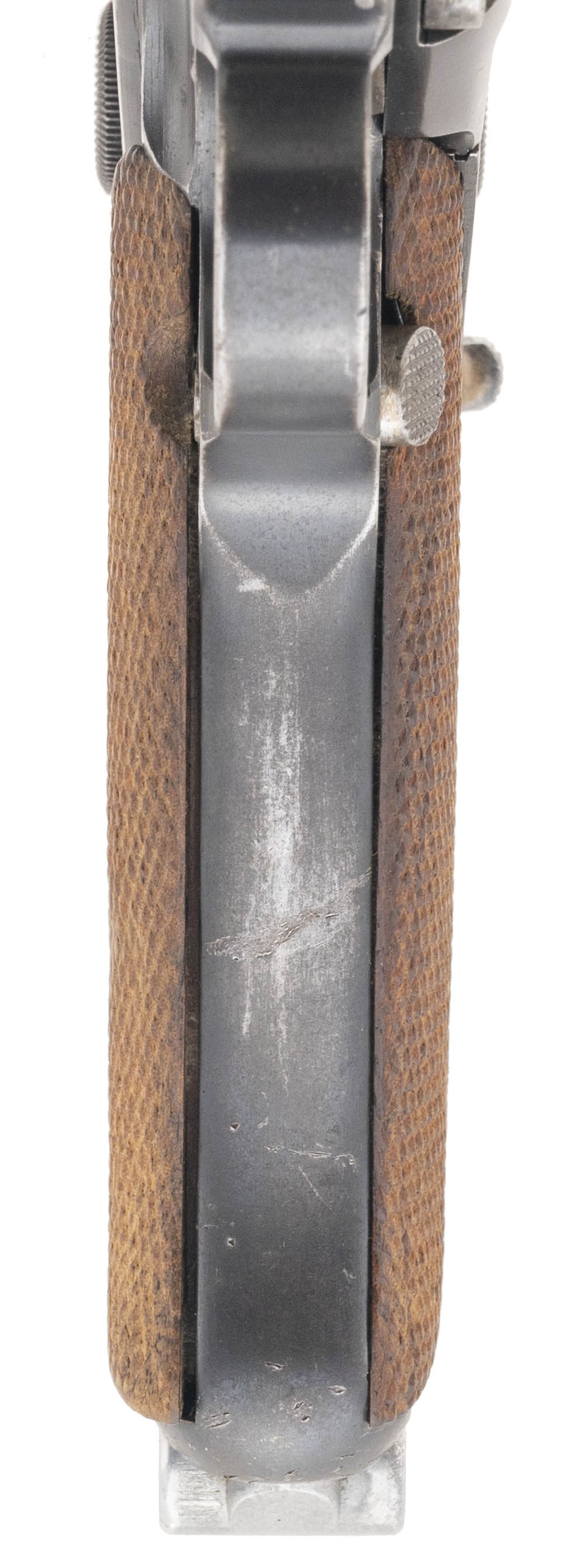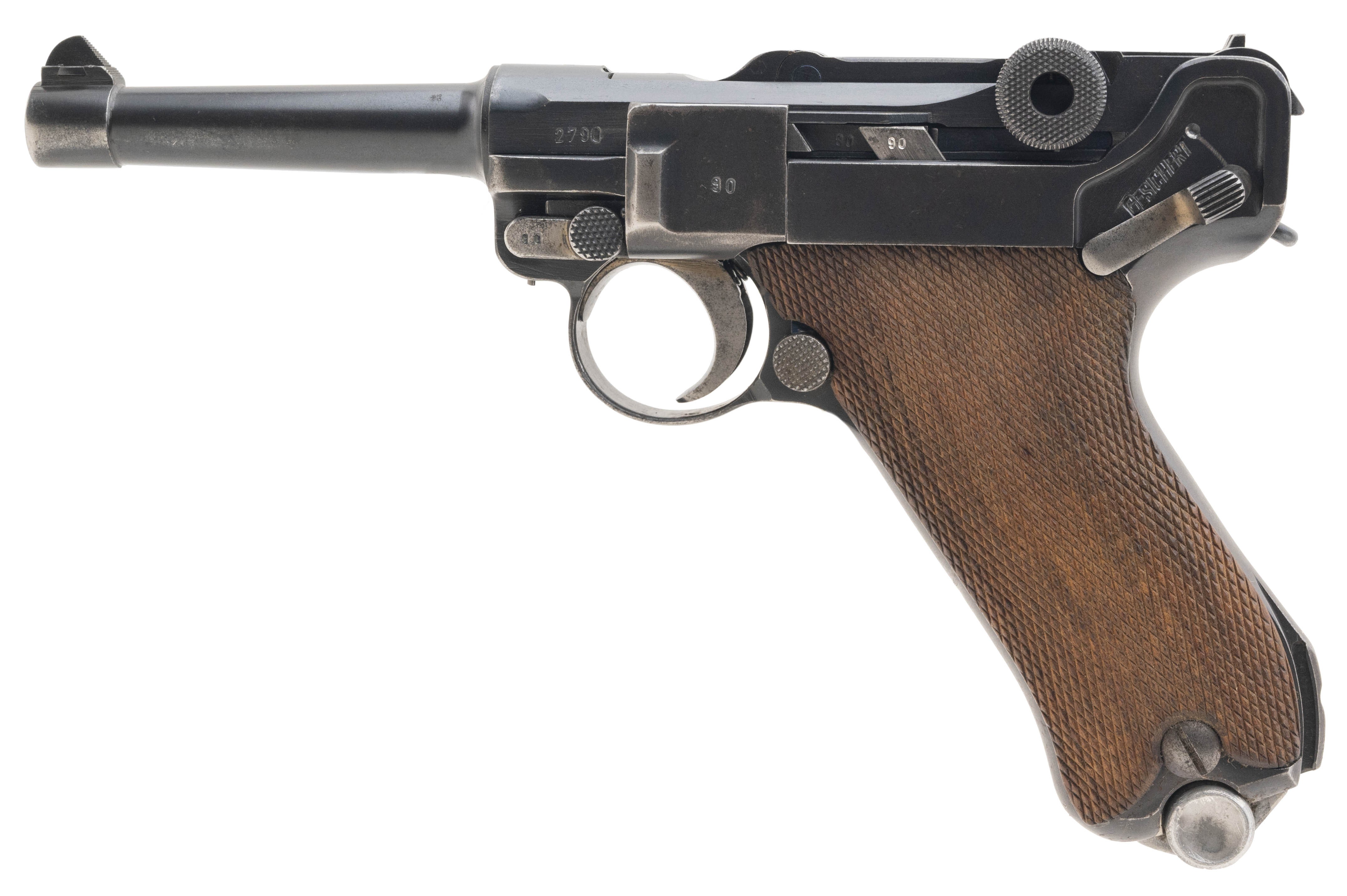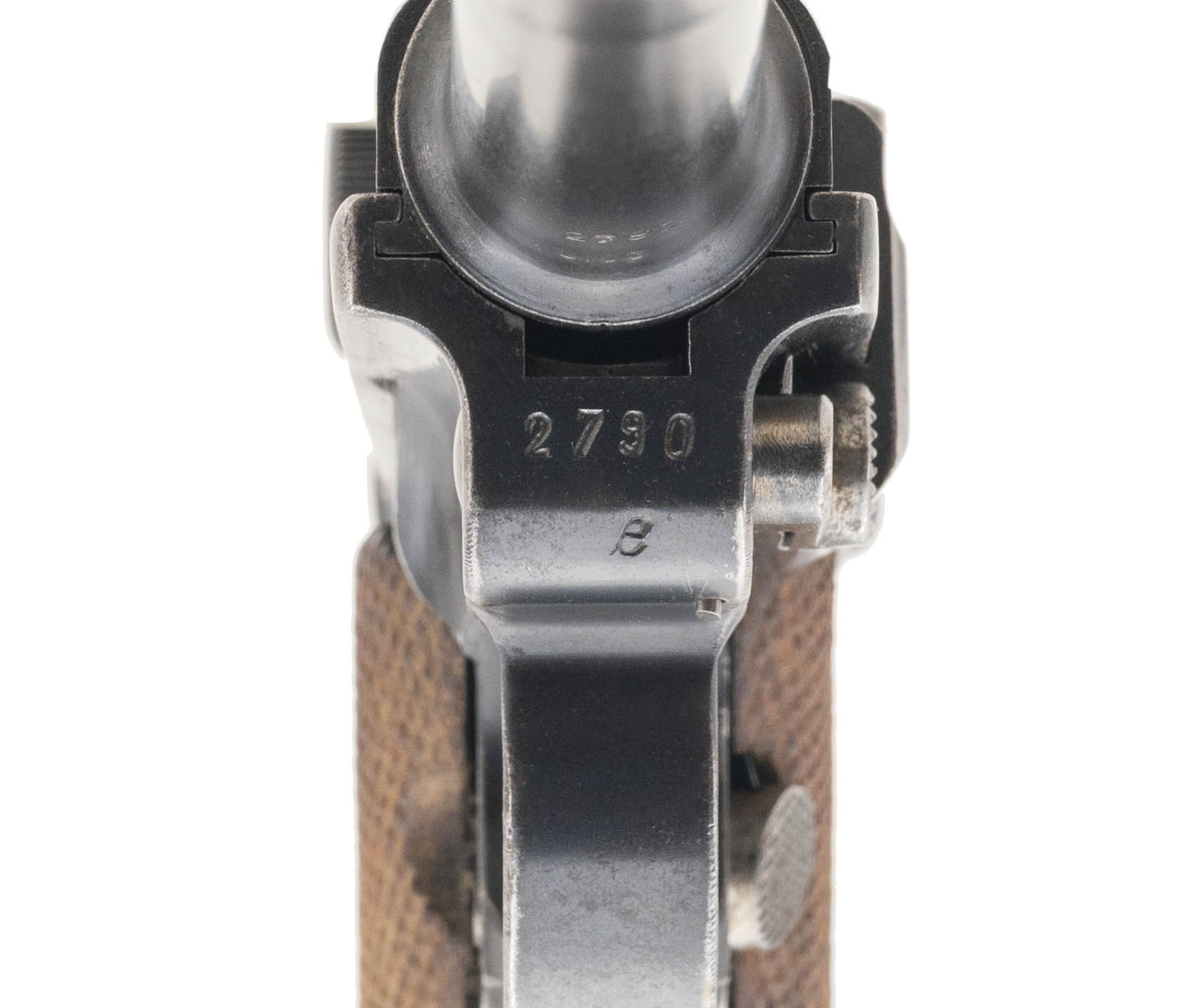 SN:2790e. Scarce "G" date luger. Serial numbers are matching, except for the magazine. Magazine is a correct era magazine. Bore has strong rifling with some minor frosting. Metal has some holster wear, and is very good overall.