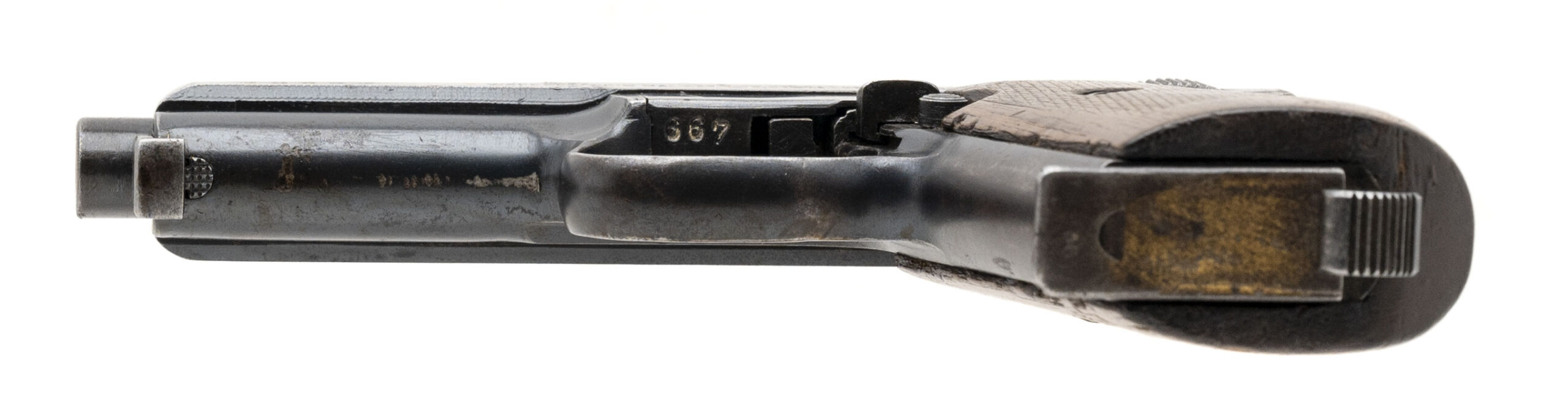 SN: 68667. Made in 1917, .32 ACP with a 3.4-inch round barrel. This all-matching wartime commercial Mauser Model 1914 is in fair condition with original factory blued finish across the metal parts that has matured into a dull brownish patina. There are heavy scratches on the slide SN and the frame SN, but the markings remain otherwise intact. Bright bore with strong rifling. Comes with an 8-round magazine and original wood wraparound grip in good condition.