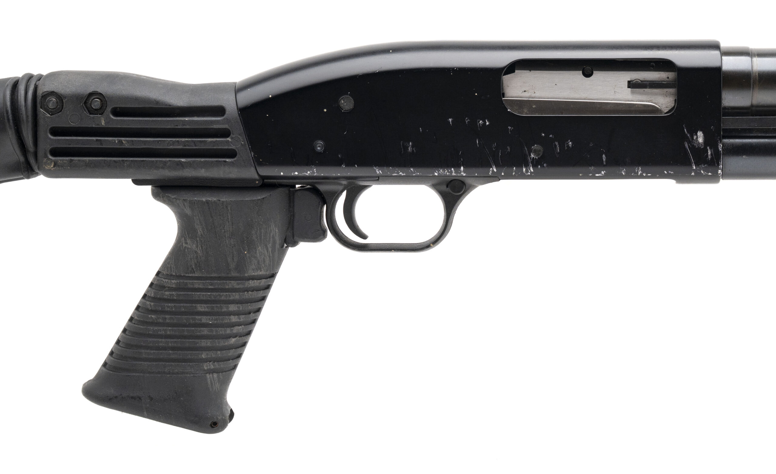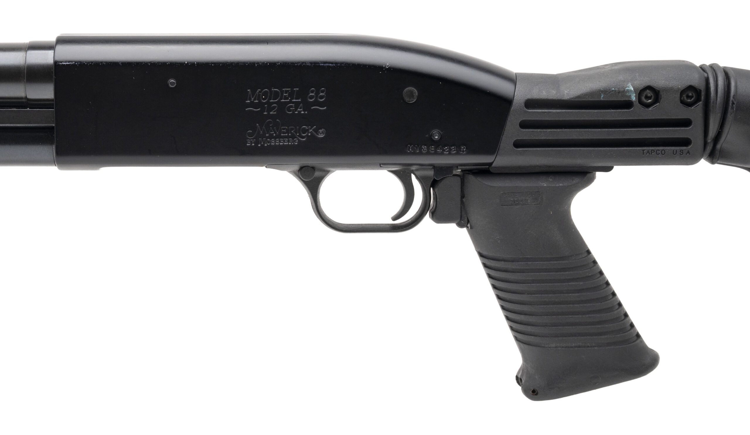 SN: MV38423R. Modern production, 12 gauge with a 20" cylinder bore barrel chambered for 2 3/4" & 3" shells. Bore is very good. Pump-action defense shotgun with a Tapco collapsible stock & pistol grip, and blued finish. Finish and stock are heavily marked, most notably to the right side of the receiver and stock. Overall condition is good.