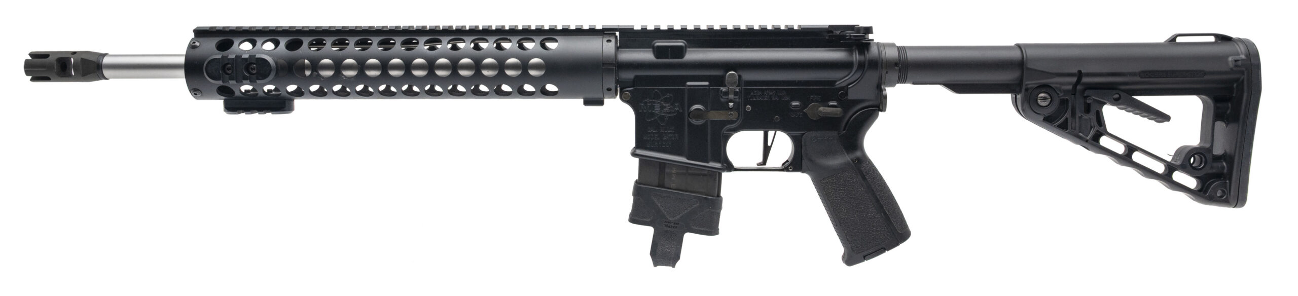 SN: MUR7027. Modern production. AR-15 pattern rifle made by Mega Arms. 16" stainless heavy barrel by Wilson Combat, chambered for 6.8 SPC. Very good condition with some handling marks in the black anodized finish. Bore is excellent. Features Midwest Industries skeletonized round handguard, Rogers Super-Stoc buttstock with lockdown lever, Ranier Arms XTreme Tactical compensator and CMC Single Stage trigger.