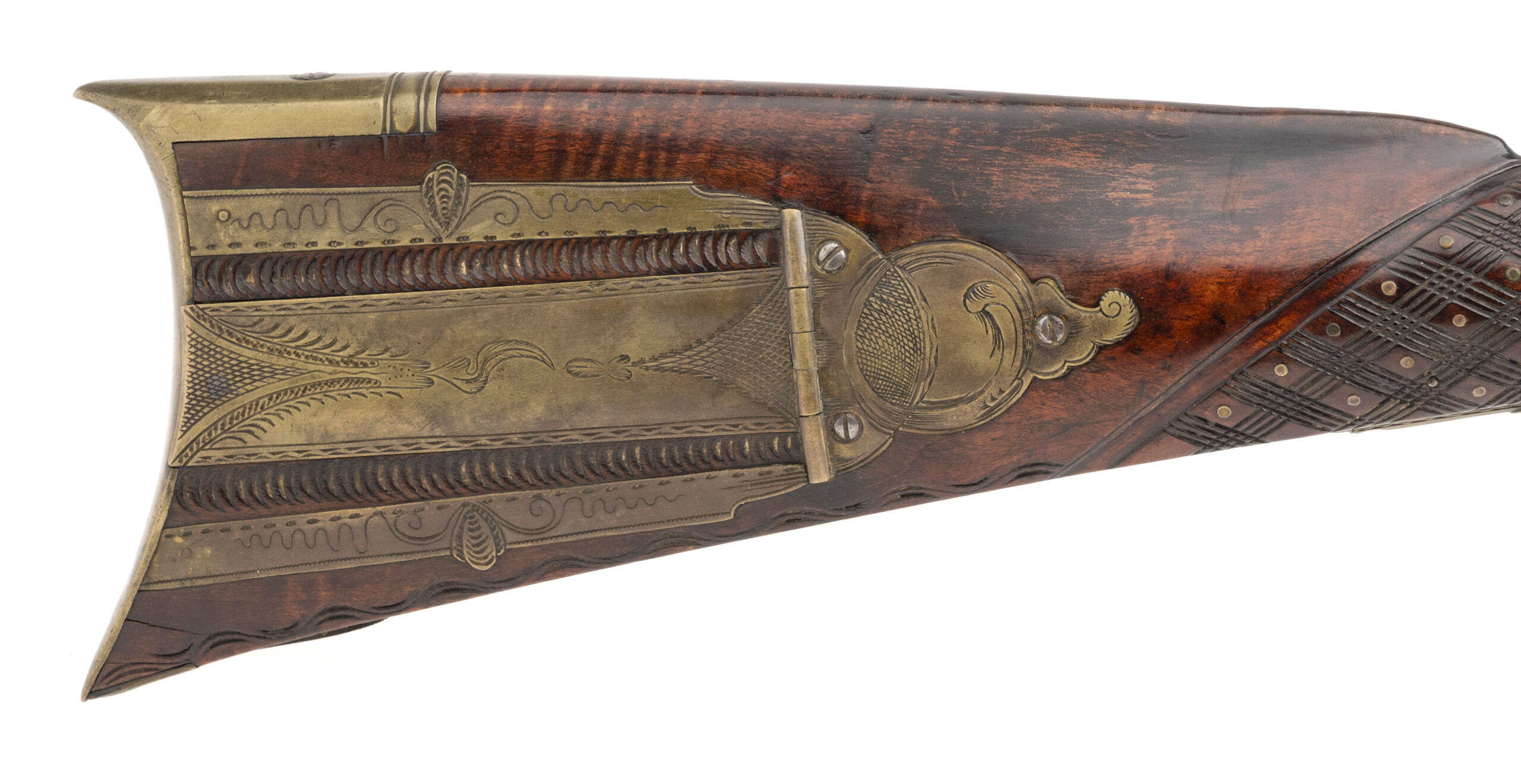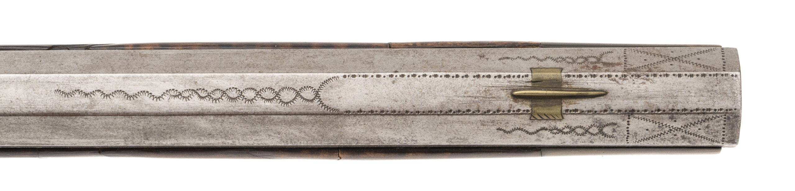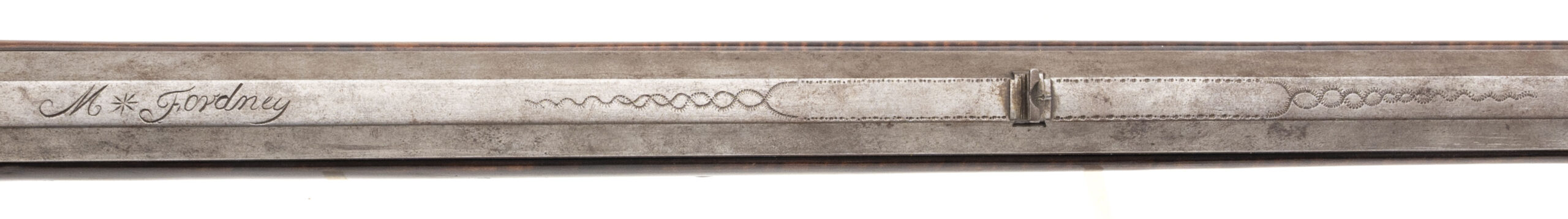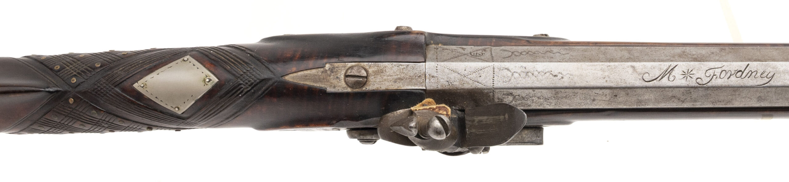 Made circa 1810-1820. 38 caliber with a 43.5” barrel. This is a very fine example by one of the most desirable makers. The barrel is nice and sharp with a gray patina. The barrel has been cleaned. The top of the barrel is marked “M* Fordney” The stock is fantastic with cross hatch checkering with silver studs on the wrist. The patch box is exquisitely engraved. The stock along the barrel has been repaired, but it is almost indetectable. This gun has also been reconverted. Melchoir Fordney is was a Lancaster gunmaker from 1811 till his death in 1847. Fordney lived with a common law wife. He was killed in 1847 by a religious fanatic with an Axe. The religious fanatic was trying to cleanse Fordney of his sins.