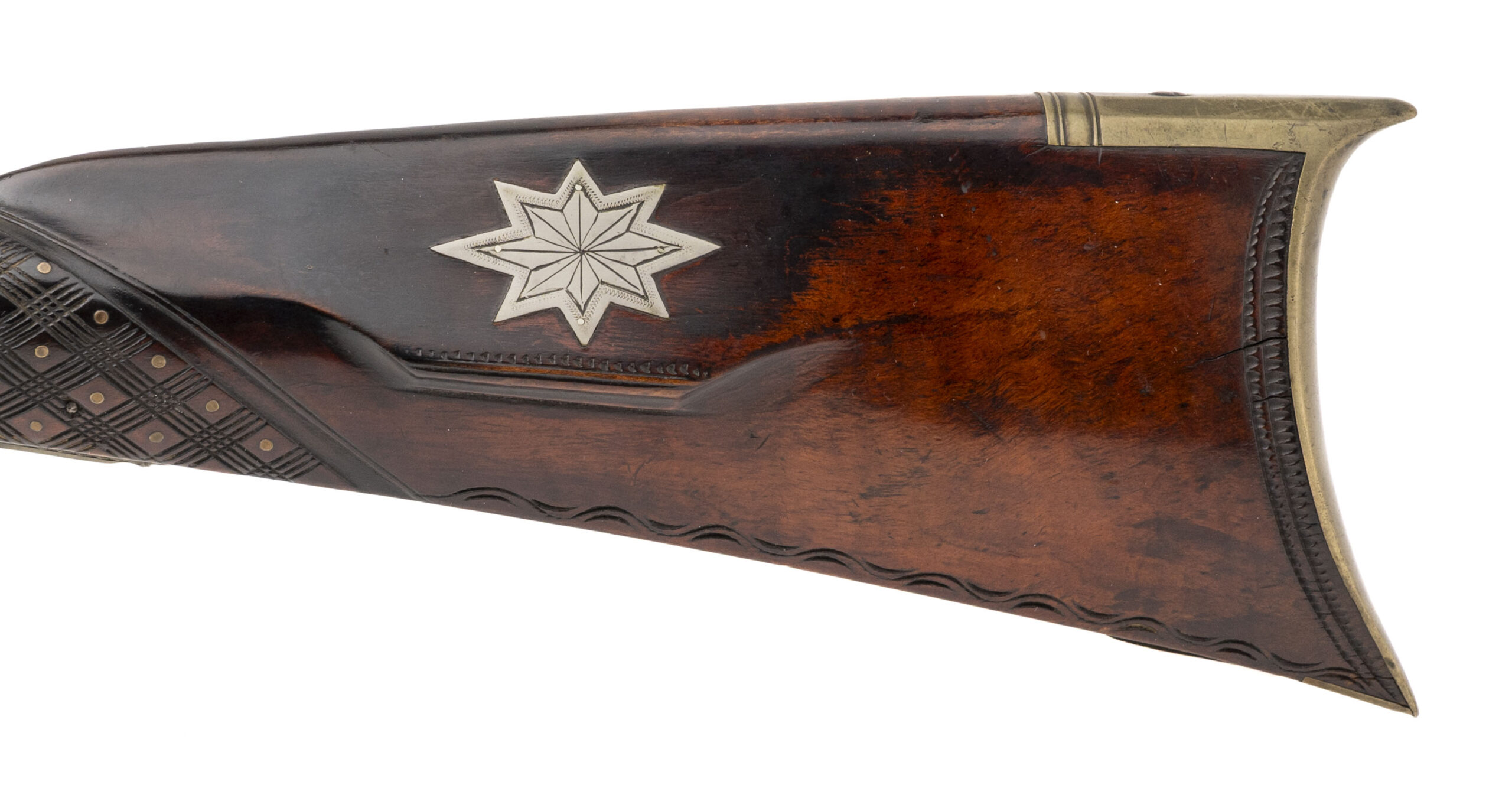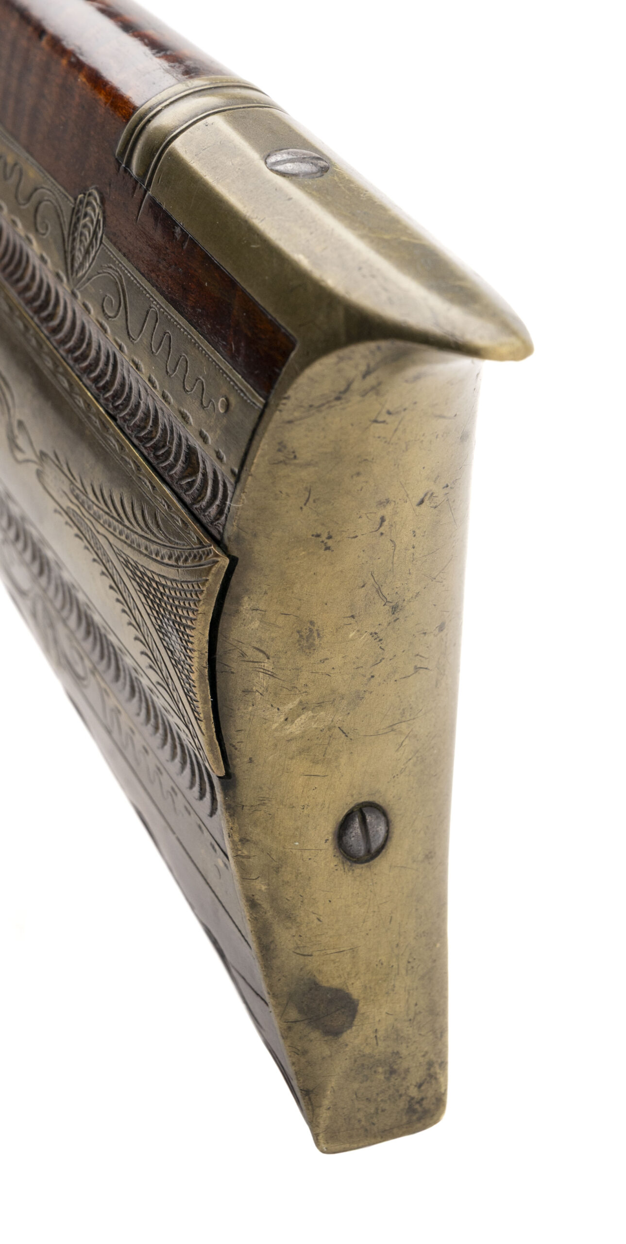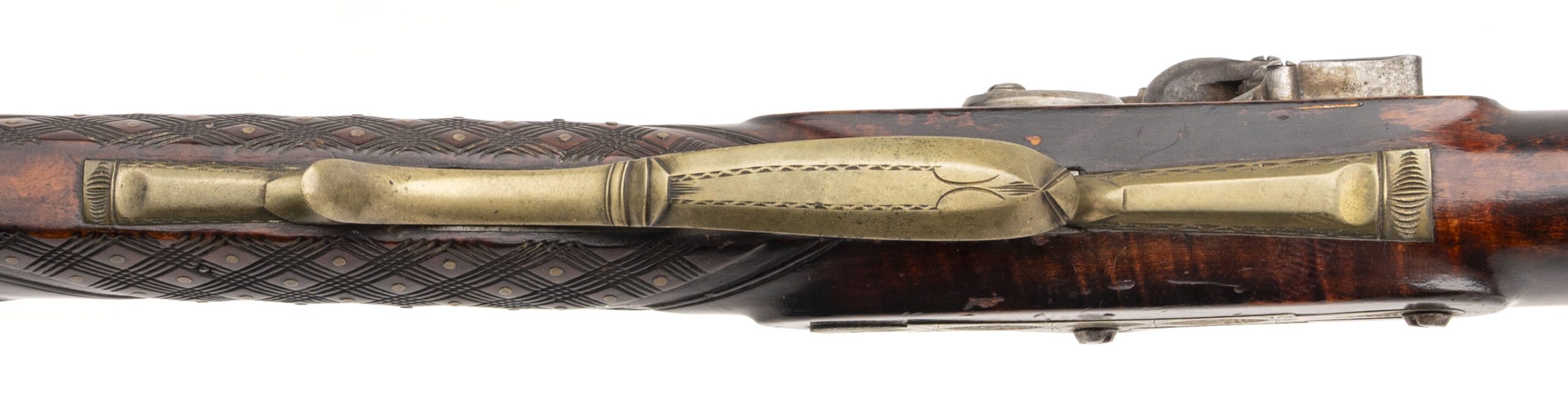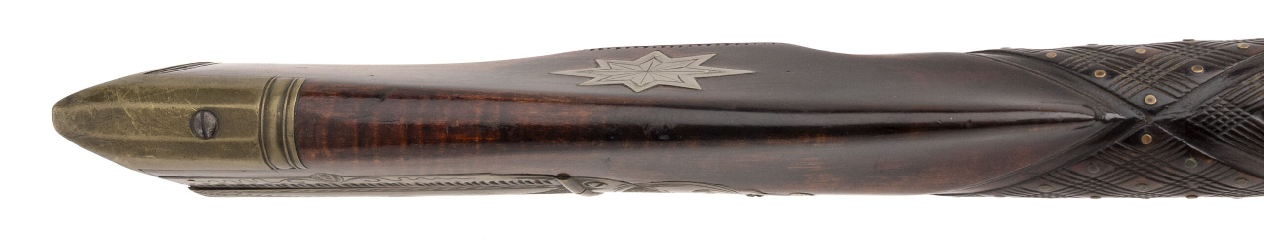Made circa 1810-1820. 38 caliber with a 43.5” barrel. This is a very fine example by one of the most desirable makers. The barrel is nice and sharp with a gray patina. The barrel has been cleaned. The top of the barrel is marked “M* Fordney” The stock is fantastic with cross hatch checkering with silver studs on the wrist. The patch box is exquisitely engraved. The stock along the barrel has been repaired, but it is almost indetectable. This gun has also been reconverted. Melchoir Fordney is was a Lancaster gunmaker from 1811 till his death in 1847. Fordney lived with a common law wife. He was killed in 1847 by a religious fanatic with an Axe. The religious fanatic was trying to cleanse Fordney of his sins.
