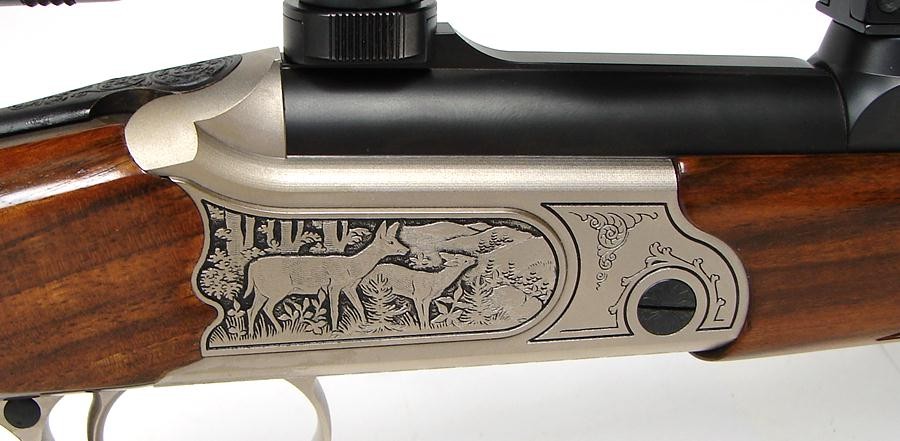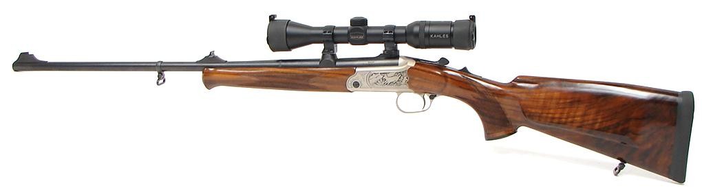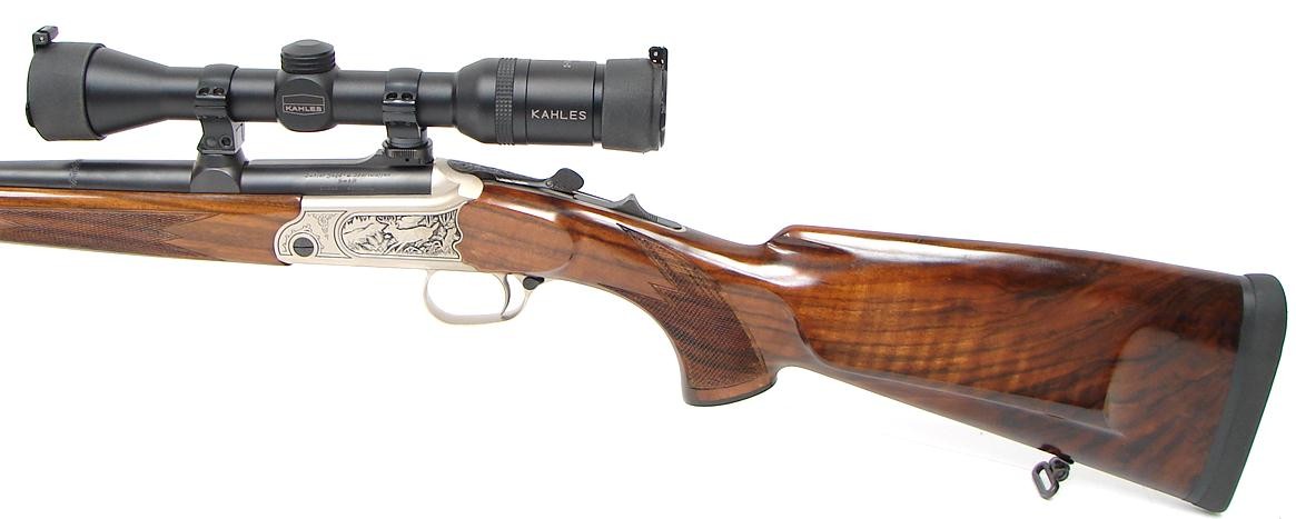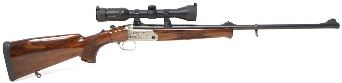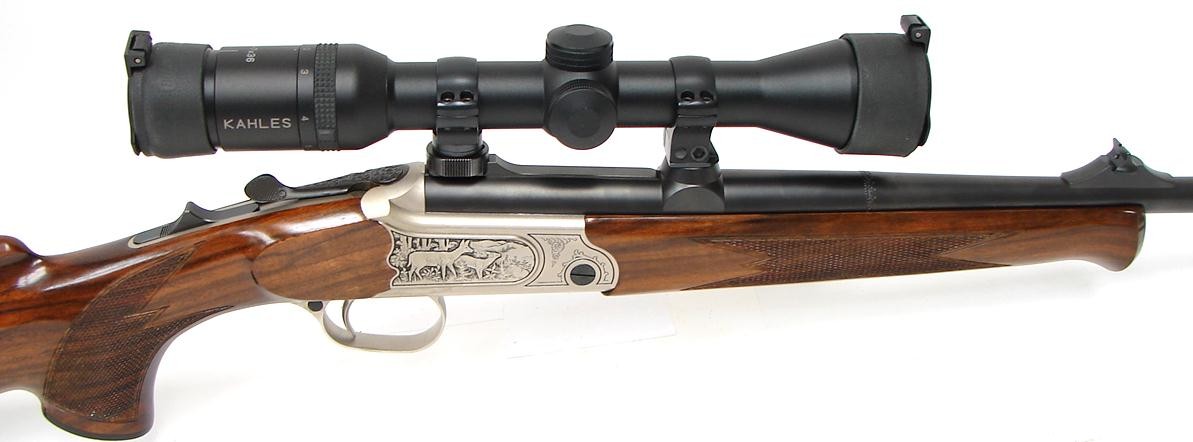 Merkel K1 7MM-08 Rem caliber rifle. Single shot stalking rifle with game scene engraved receiver, iron sights, fancy Walnut stock and Kahles 2X7 scope. Excellent condition.