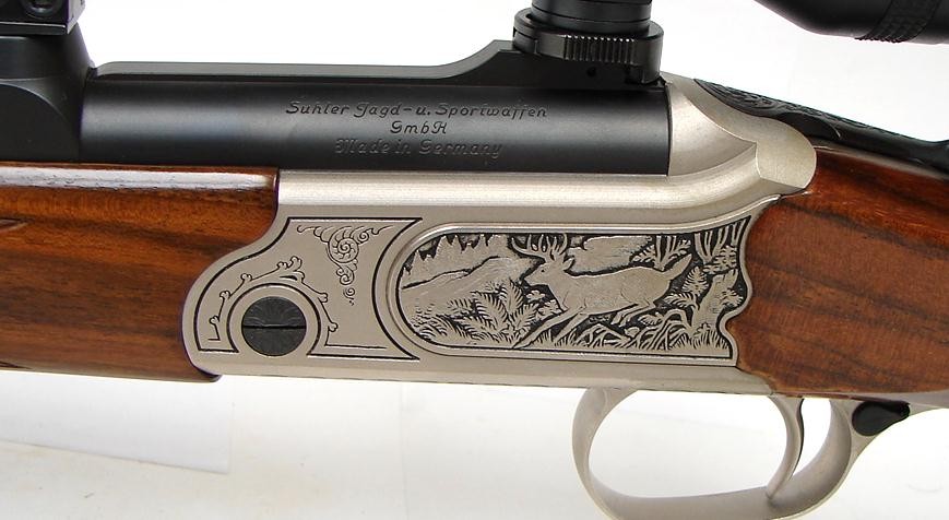 Merkel K1 7MM-08 Rem caliber rifle. Single shot stalking rifle with game scene engraved receiver, iron sights, fancy Walnut stoc (R10104)