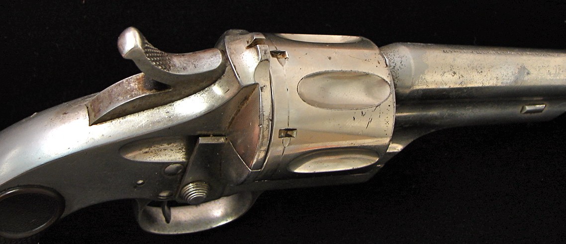 Merwin and Hulbert 1st Model Open Top .44-40 caliber revolver. Very fine condition. Gun has 85% original nickel but has the appearance of closer to 95% as the areas lacking finish have been cleaned in such a way that the bare metal blends well with the finish. This is the early model with the scooped cylinder, open top with the birds head butt. All numbers match. Bore has strong rifling and is on the dark side with areas of light pitting.