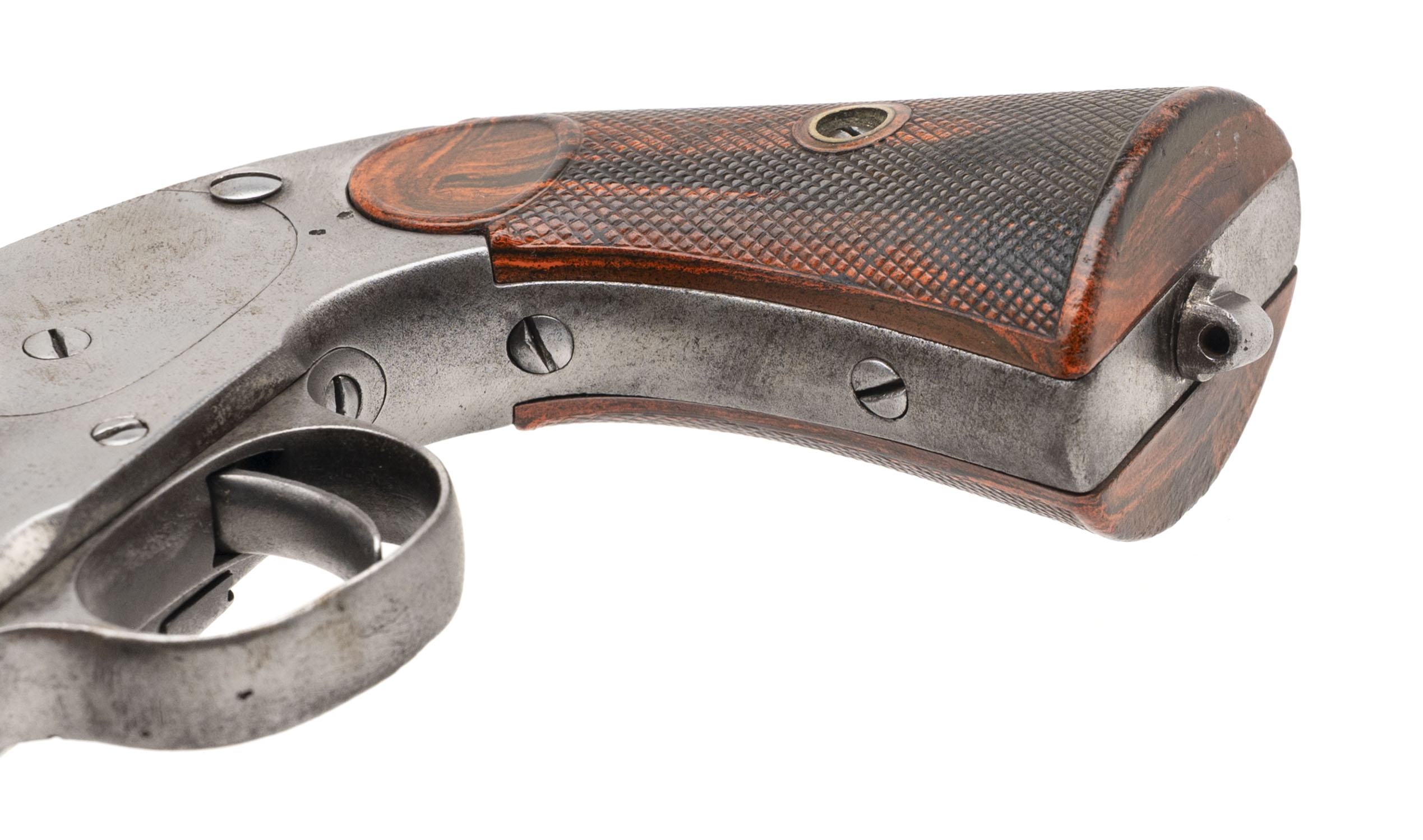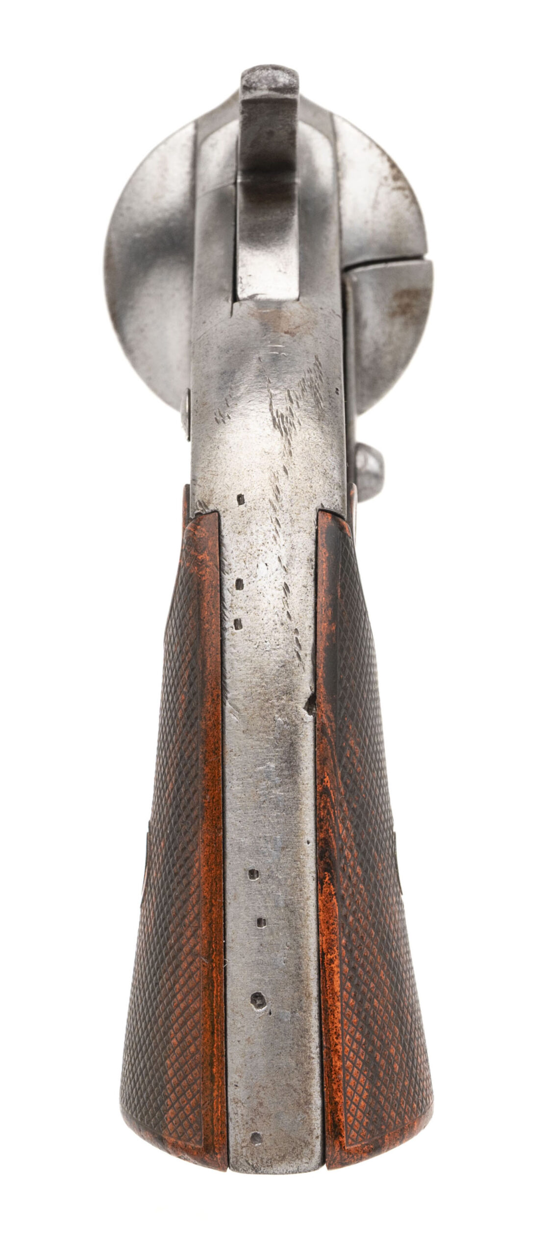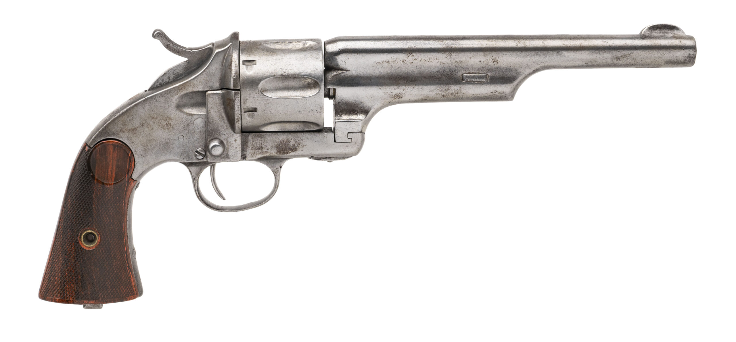 Serial number 3656. Made circa 1880s. 44 M&H caliber with a 7” barrel. This gun has been cleaned extensively and has polished bare metal with evidence of pitting. The grips are well made replacements. The action indexes and locks up.