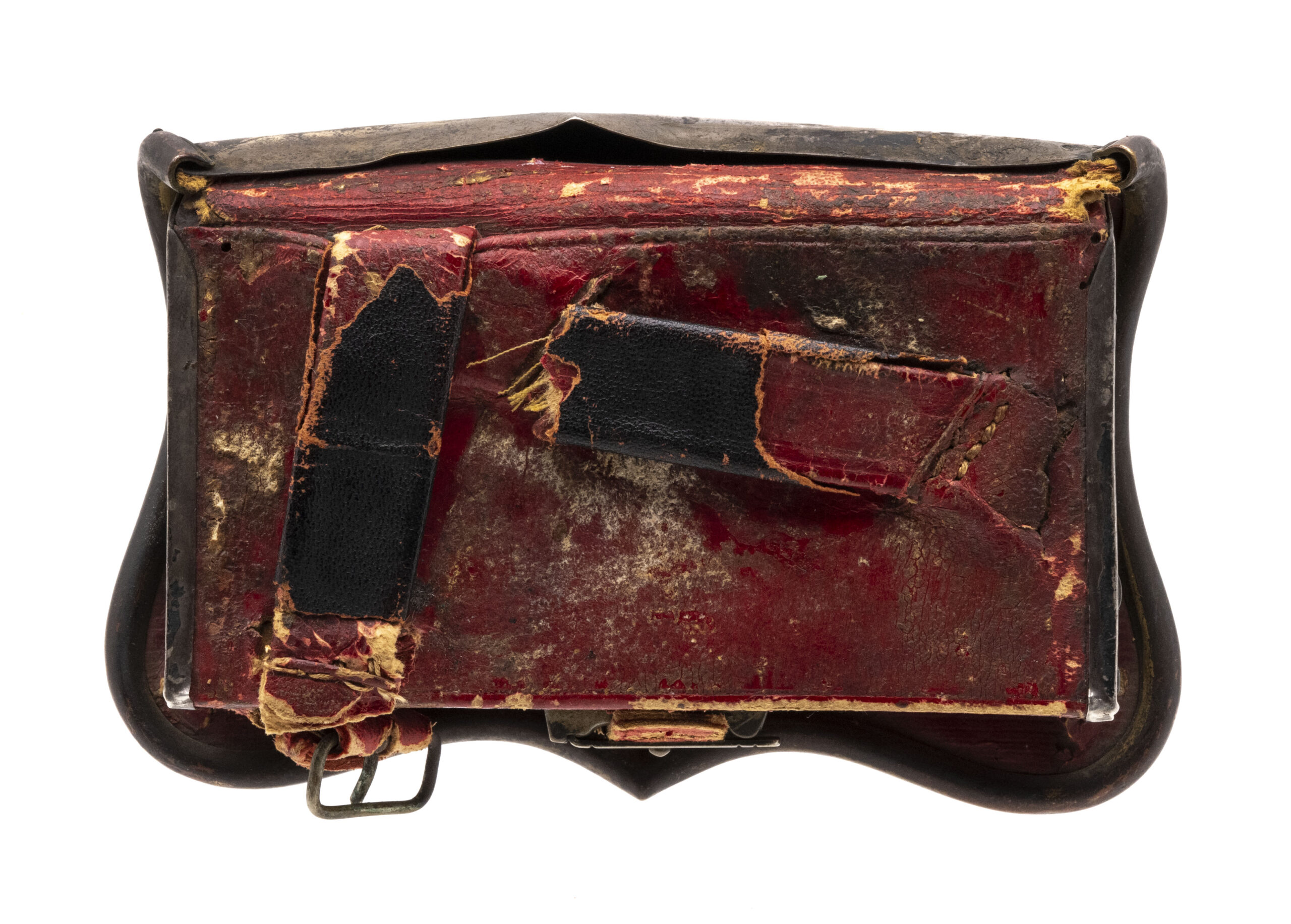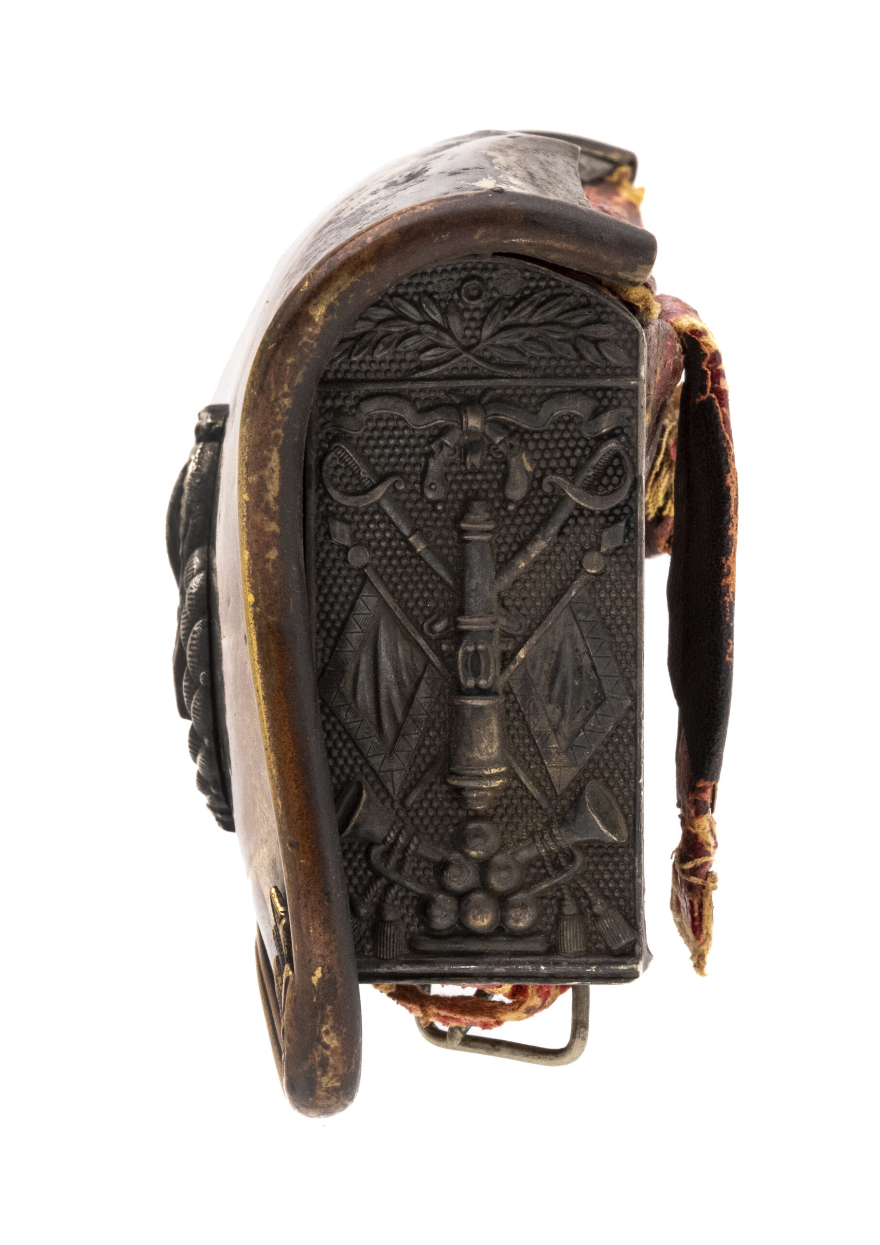 NSN. Made circa 1870s. This is very similar to an Austrian Cavalry Dress Cartridge Box, but has the Mexican eagle an snake surrounded by a wreath. This cartridge box is in excellent condition. This box is silver plated with most of the silver still remaining.