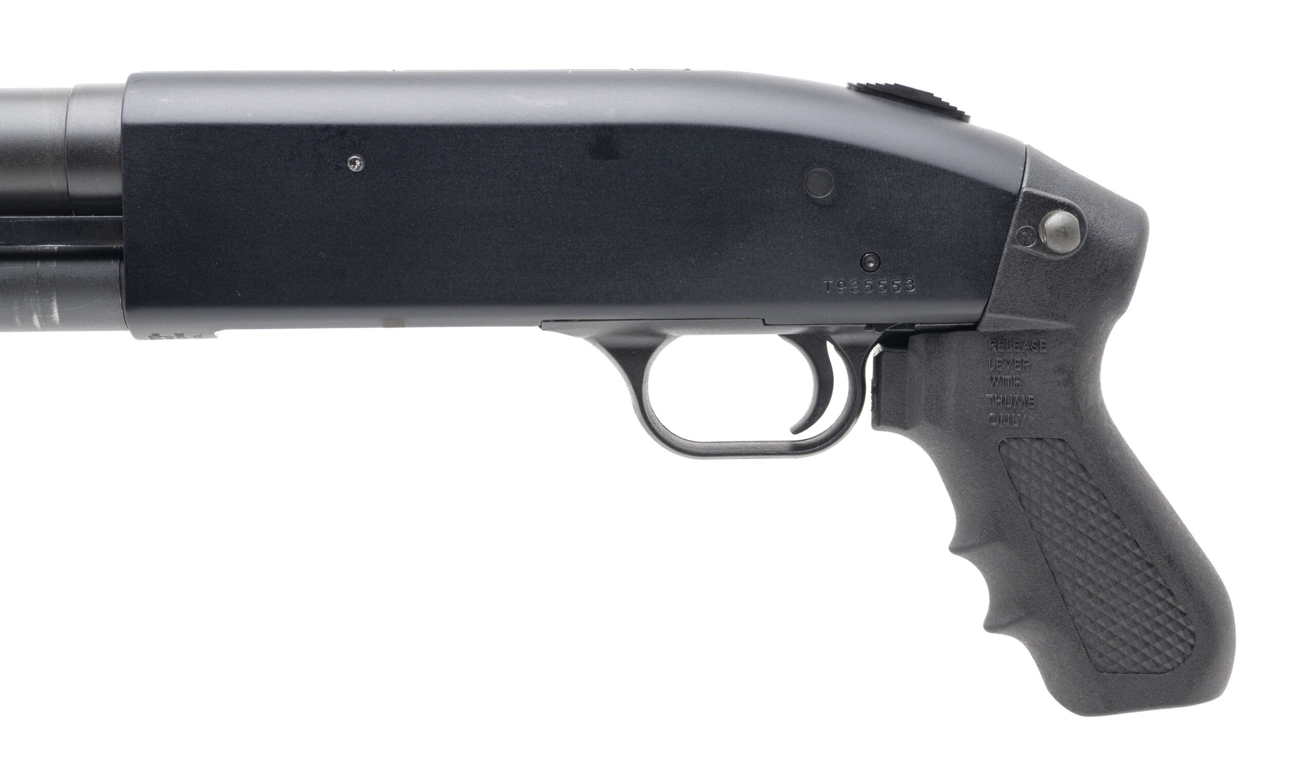 SN: T935553. Modern production, 12 gauge with a 18.5" standoff barrel chambered for 2 3/4" & 3" shells. Bore is excellent. Pump-action defense shotgun with matte blued finish, and black synthetic pistol grip & tri-rail forend w/chainsaw style grip. Overall condition is excellent. Includes original box.