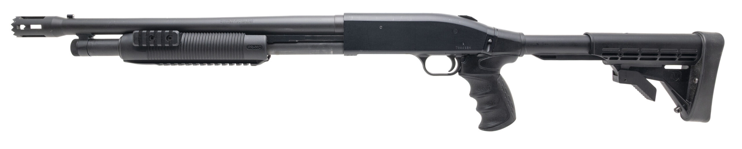 SN: T944924. Modern production, 12 gauge with a 18.5" standoff barrel chambered for 2 3/4" & 3" shells. Bore is excellent. Pump-action defense shotgun with collapsible stock, black synthetic tri-rail forend, and matte black finish. Finish shows light handling marks throughout. Overall condition is very good. Includes original box.