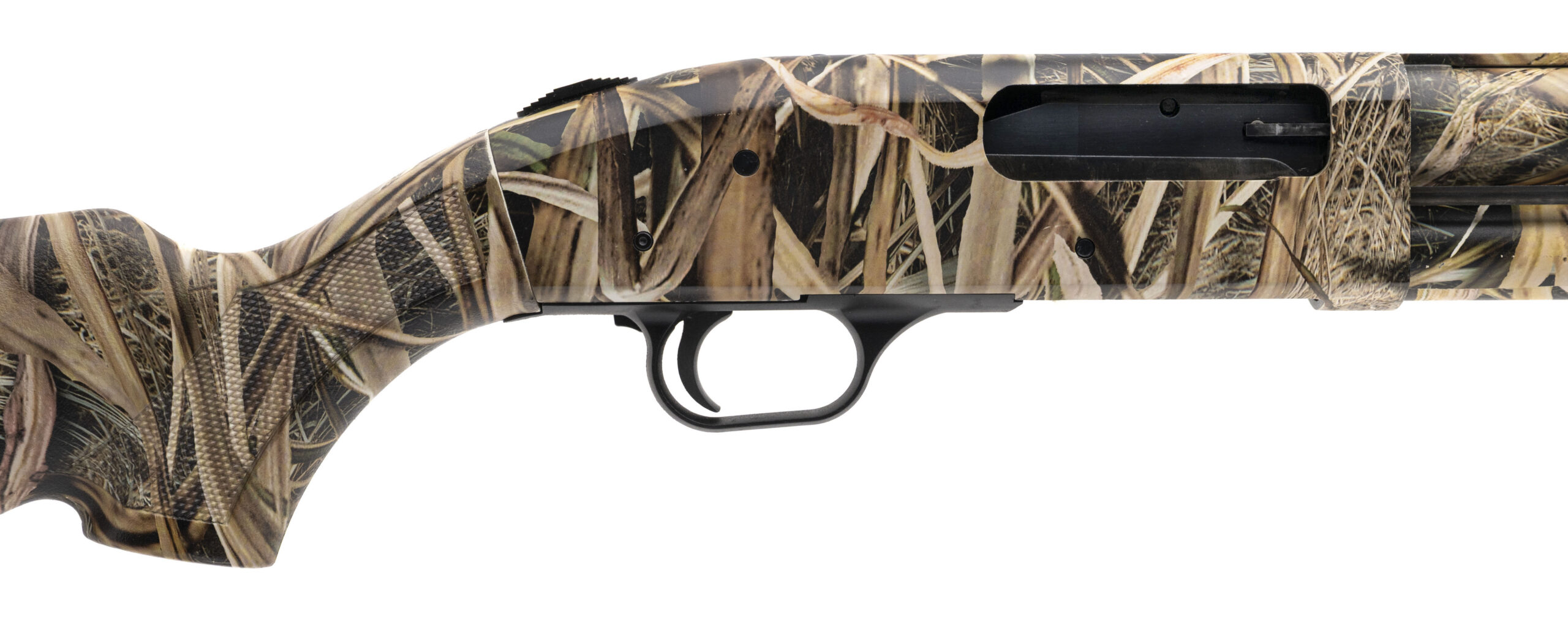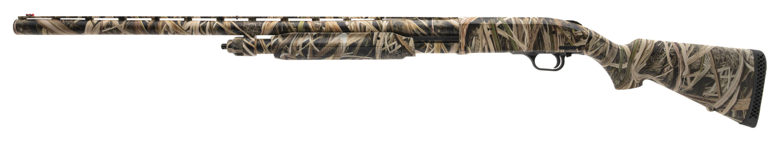 SN: UM0002717 modern production 12 gauge pump action field shotgun with a 28" vent rib barrel, 3 1/2" chamber and screw in choke. Synthetic furniture with Mossy Oak Shadow Grass Blades camo and a 14" LOP to the original pad. Overall in excellent condition.