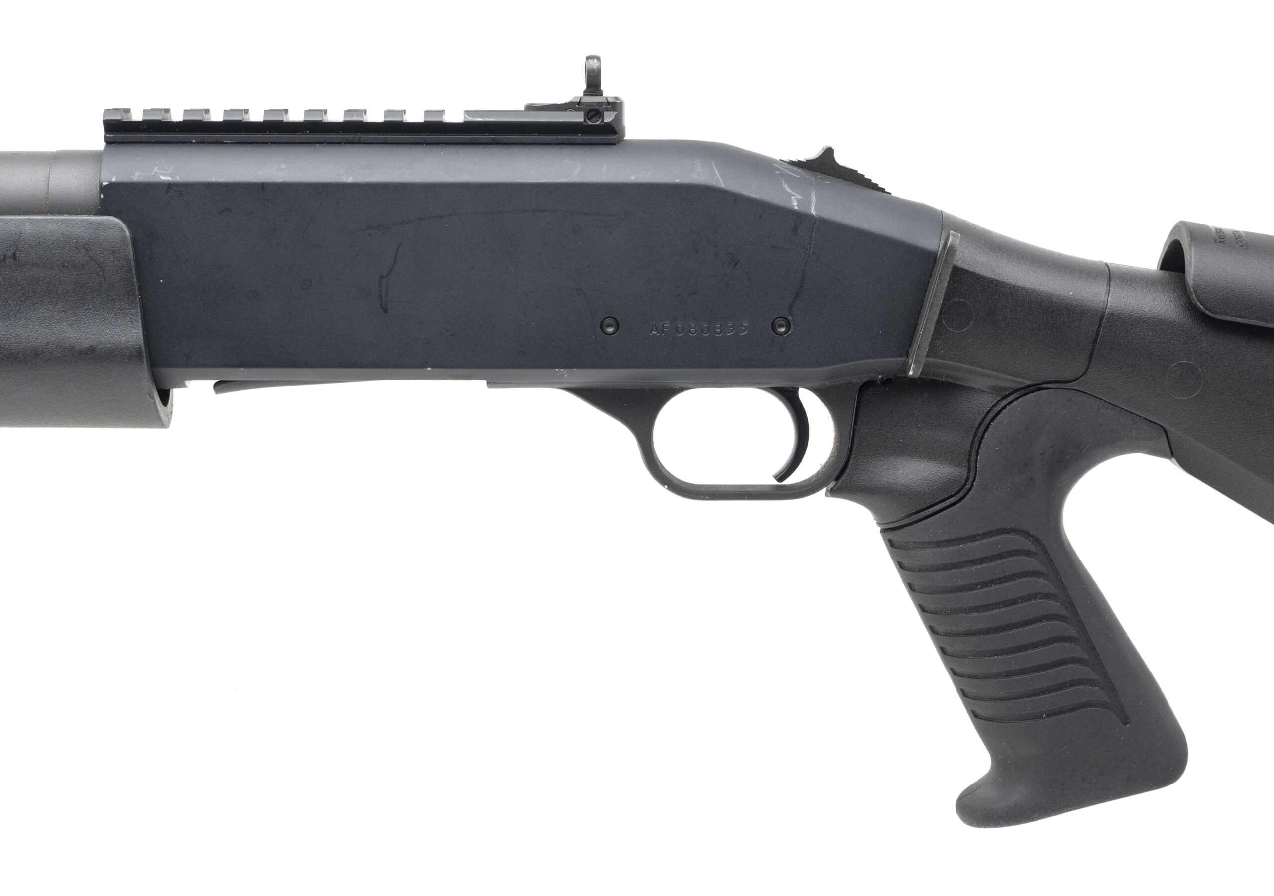 SN: AF080835. Modern production, 12 Gauge with a 18.5" barrel w/Mossberg Stand-Off choke. Bore is bright. Semi-auto with tactical shotgun with a 3" chamber, optic rail, XS tritium front & ghost ring rear sights, and a Limb Saver pistol grip & stock. Metal shows handling wear but the overall condition is very good.