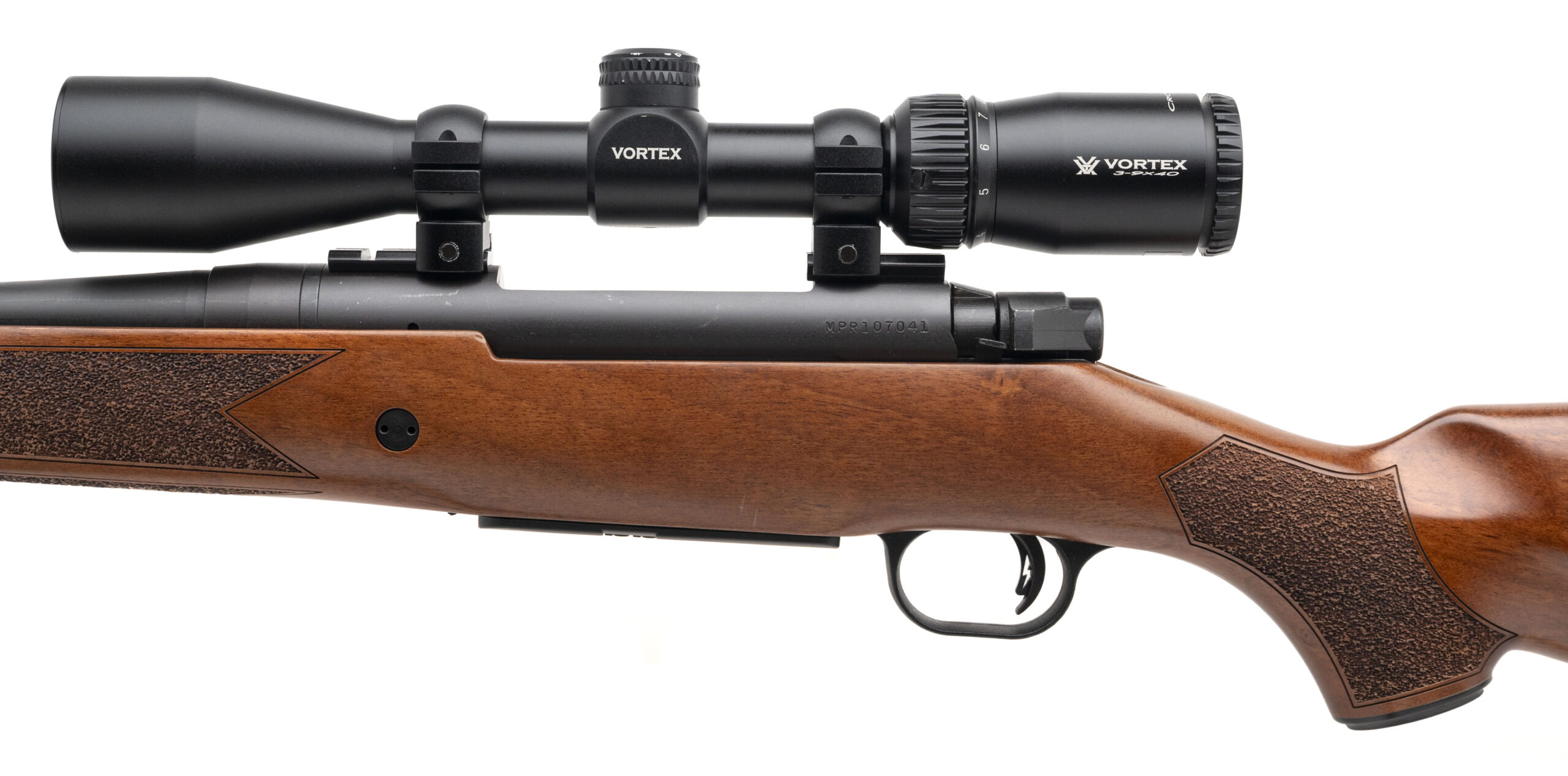 SN: MPR107041 modern production bolt action hunting rifle chambered in 270 Win. with a 22" round semi-fluted barrel and Vortex Crossfire II 3-9x40 scope in a wood stock with textured panels. Some light handling marks, overall in very good condition with an excellent bore. Comes with sling.